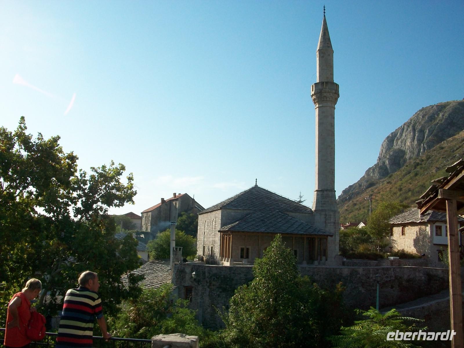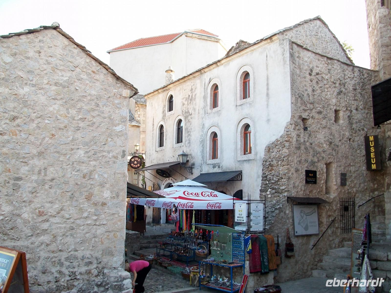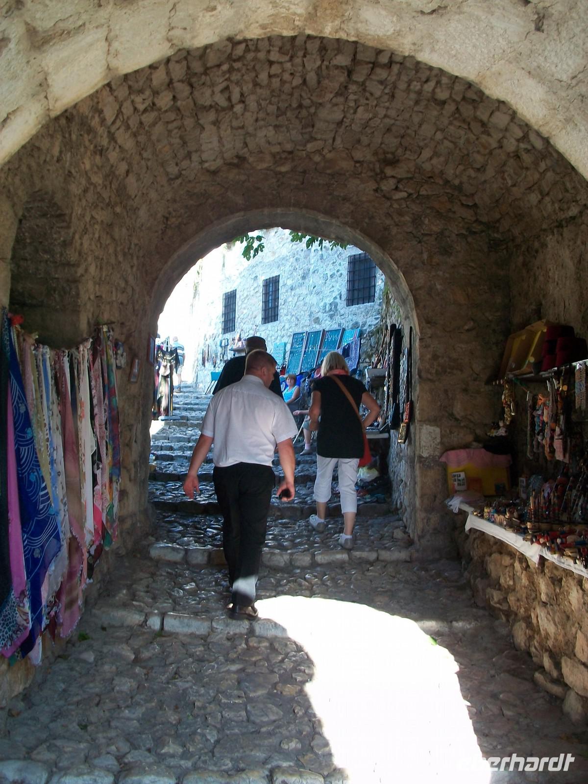 Nach dem wir die Hauptstraße überquert haben, ändert sich das Bild schlagartig. Plötzlich sind wir im Orient angelangt; wir laufen über holpriges türkisches Pflaster und sehen die typischen Bauten dieser langen osmanischen Zeitepoche. Da es noch früh am Tage ist, sind die schmalen Gassen noch fast leer, das Programm welches wir uns vornehmen kann ganz entspannt vonstatten gehen. Bald kommen wir am wichtigsten Wahrzeichen von Mostar an: der Alten Brücke. Etwas mühselig ist die Überquerung, unter unseren Füßen schlängeln sich die grünen Fluten der Neretva entlang. Am gegenüberliegenden Ufer haben wir einen schönen Blick auf dieses elegante Bauwerk welches ab 2004 wieder in alter, neuer Schönheit das Auge des Besuchers erfreut.