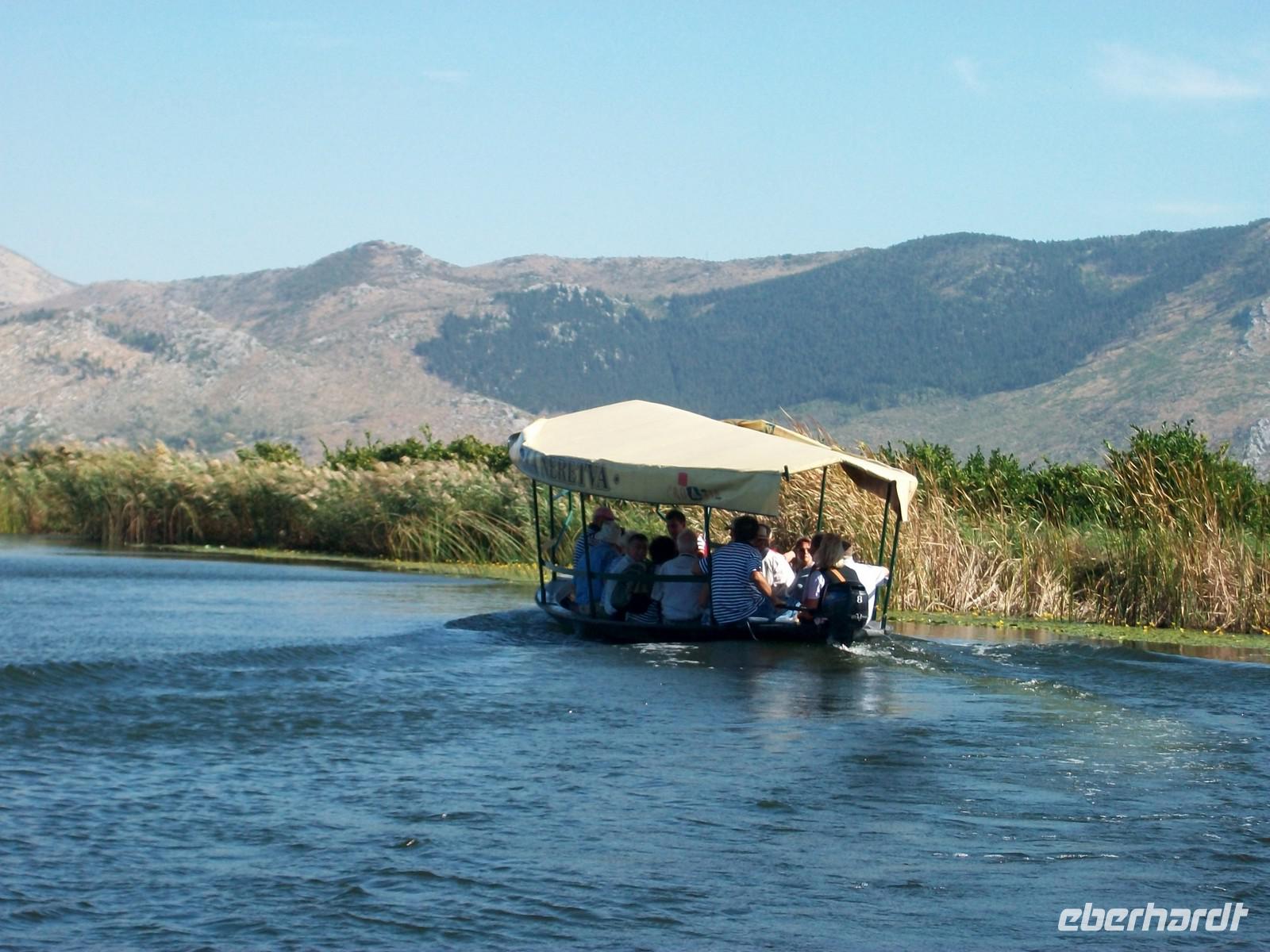 Hier im Tal der Neretva ist noch Hochsommer, an diesem späten Septembertag brennt die Sonne unbarmherzig und bei runden 30 Grad sind wir auf dem Weg zu den alten Fischerbooten. Auch dabei werden wir von den unermüdlichen Musikern begleitet, der Einstieg ins Boot ist etwas wackelig aber bald haben wir Platz genommen. Zur Begrüßung gibt es erst einmal einen Schnaps und dann geht ein Korb mit getrockneten Feigen herum. Nach diesem traditionellen Willkommensgruß geht die romantische Fahrt auf den Kanälen der Neretva los. Diese alten Boote haben einen modernen Außenbordmotor der uns tuckernd voran bringt. Überall sehen wir die Mandarinenbäume mit den reifen Früchten, auf den Wegen daneben sind Stiegen mit den gepflückten Früchten aufgestapelt und warten auf ihren Abtransport. Im Wasser des Flusses widerspiegeln sich die Berge der Umgebung, über unseren Köpfen fliegt ein Fischreiher den wir wohl in der Mittagsruhe gestört haben.