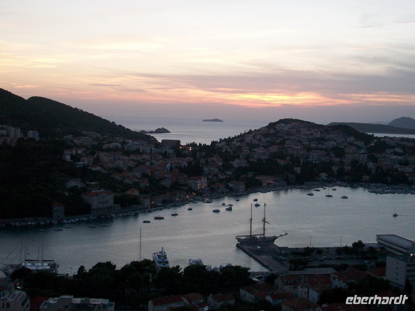 Doch dann heißt es aufbrechen, beim Ort Lepetane überqueren wir die Engstelle der Bucht mit der Autofähre. Dann führt uns der Weg zurück auf der Straße die wir am Morgen befahren haben. Die Sonne neigt sich dem Untergang zu und sendet ihre letzten Strahlen in die Bucht. An der Grenze geht es wieder recht flott und als wir 19.40 Uhr am Hotel ankommen, ist schon Dunkelheit eingezogen. Kurz vor der Hotelankunft sehen wir die Altstadt von Dubrovnik noch in einem magischen Licht. Mit dieser schönen Impression beschließen wir nun auch den heutigen Tag, mit unvergesslichen Erlebnissen die wir in Montenegro erleben konnten.