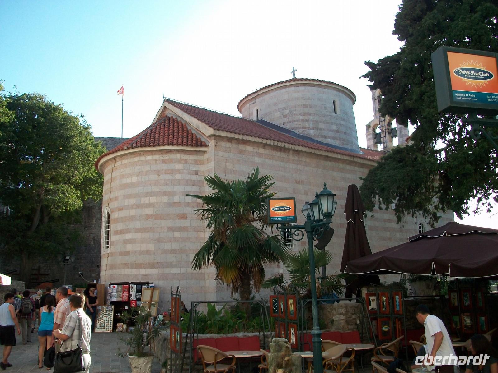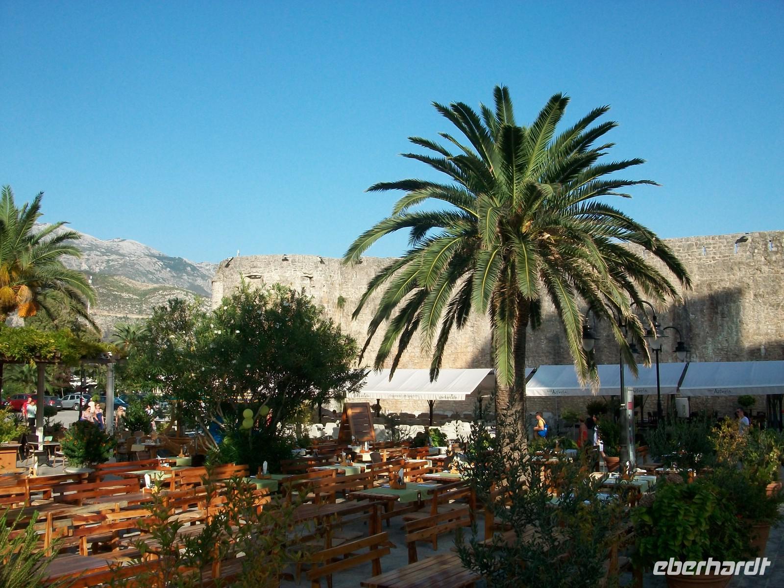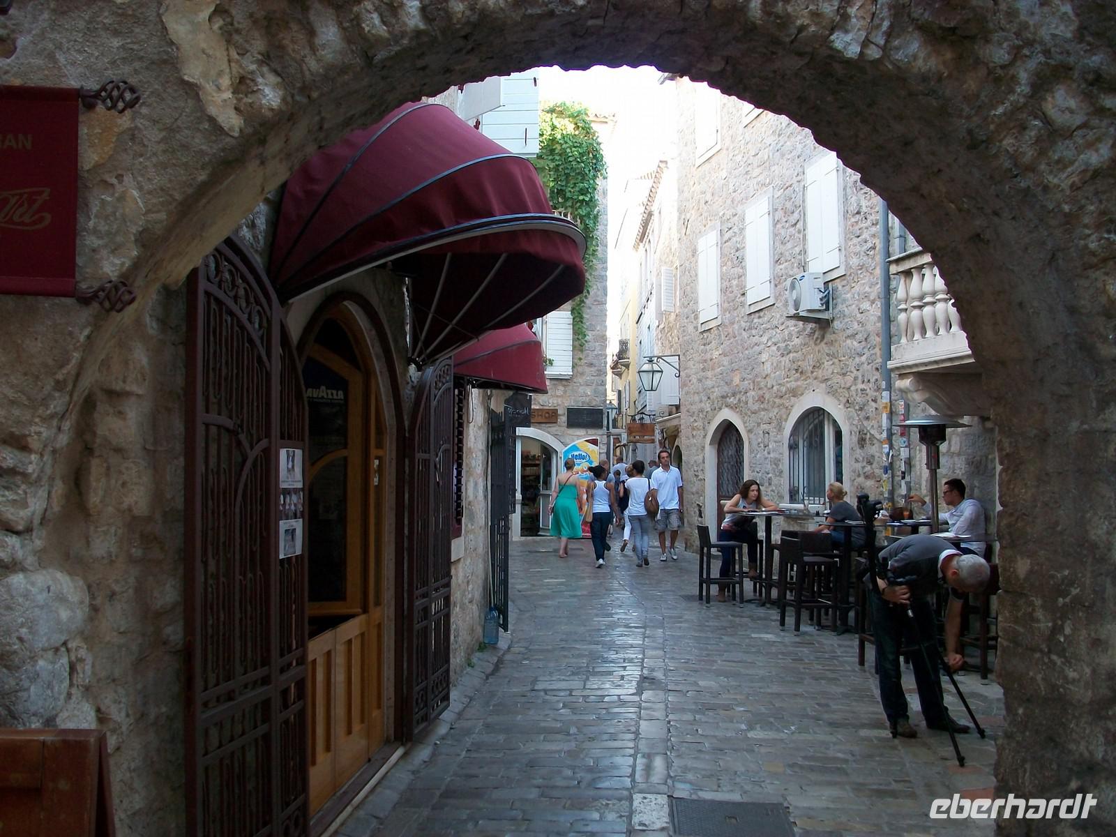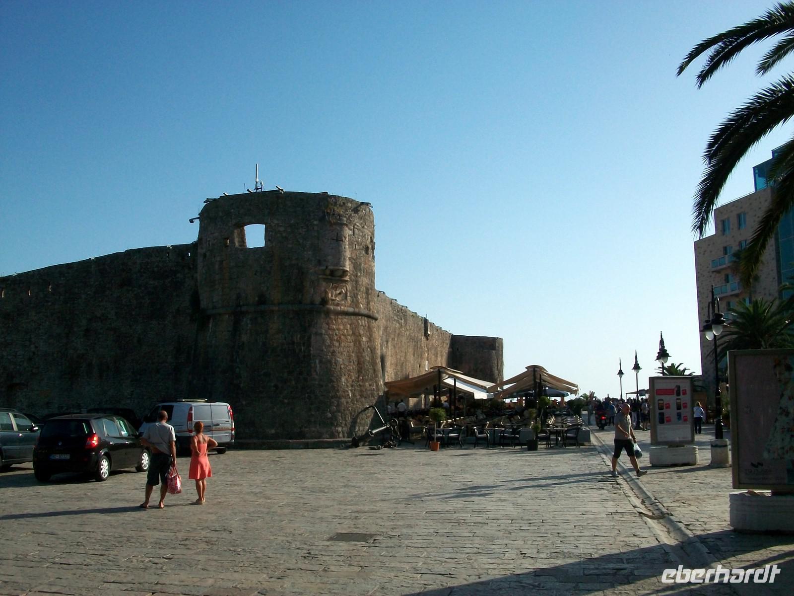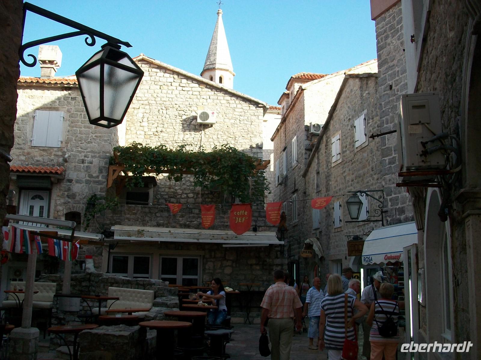Nach der wissenswerten Führung geht unsere Rundreise durchs Land der schwarzen Berge weiter, bald überqueren wir den Kamm des Küstengebirges und sehen die Adria wieder. Vor unseren Augen und von oben kommend, dehnt sich die in der Nachmittagssonne glitzernde Wasserfläche aus. In Serpentinen geht es abwärts und bald haben wir die Altstadt von Budva erreicht. Nur wenige Gehminuten und wir stehen am Eingang zur Stadt. Wie Dubrovnik, nur viel kleiner, ist Budva von einer Stadtmauer umgeben, wenige Eingänge führen hinein. Unser montenegrinischer Führer erklärt die Sehenswürdigkeiten und verabschiedet sich von unserer Gruppe. Sehr originell und humorvoll hat er uns Teile seines Heimatlandes gezeigt; unsere Gäste haben nun noch eine Stunde Zeit Budva individuell zu erkunden.