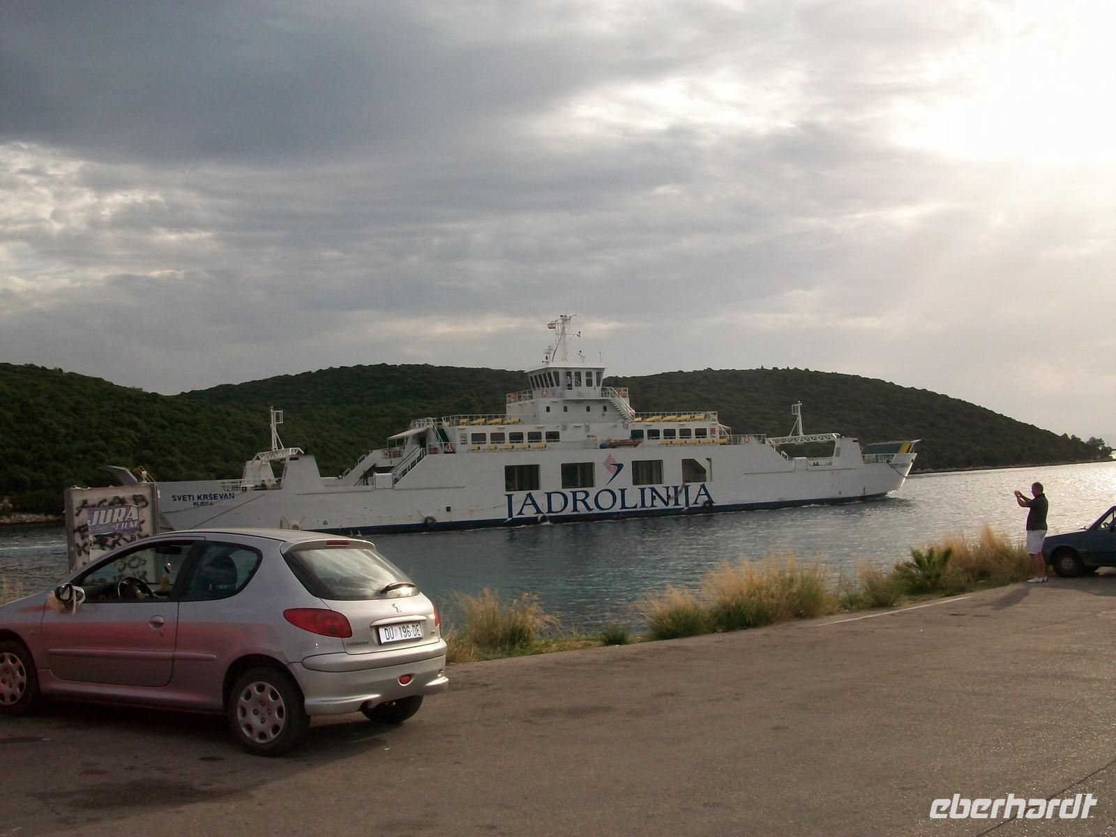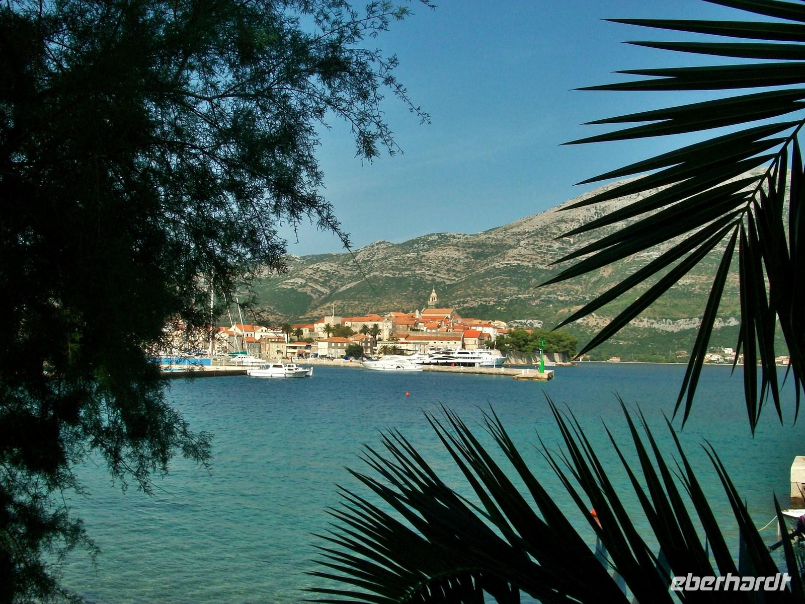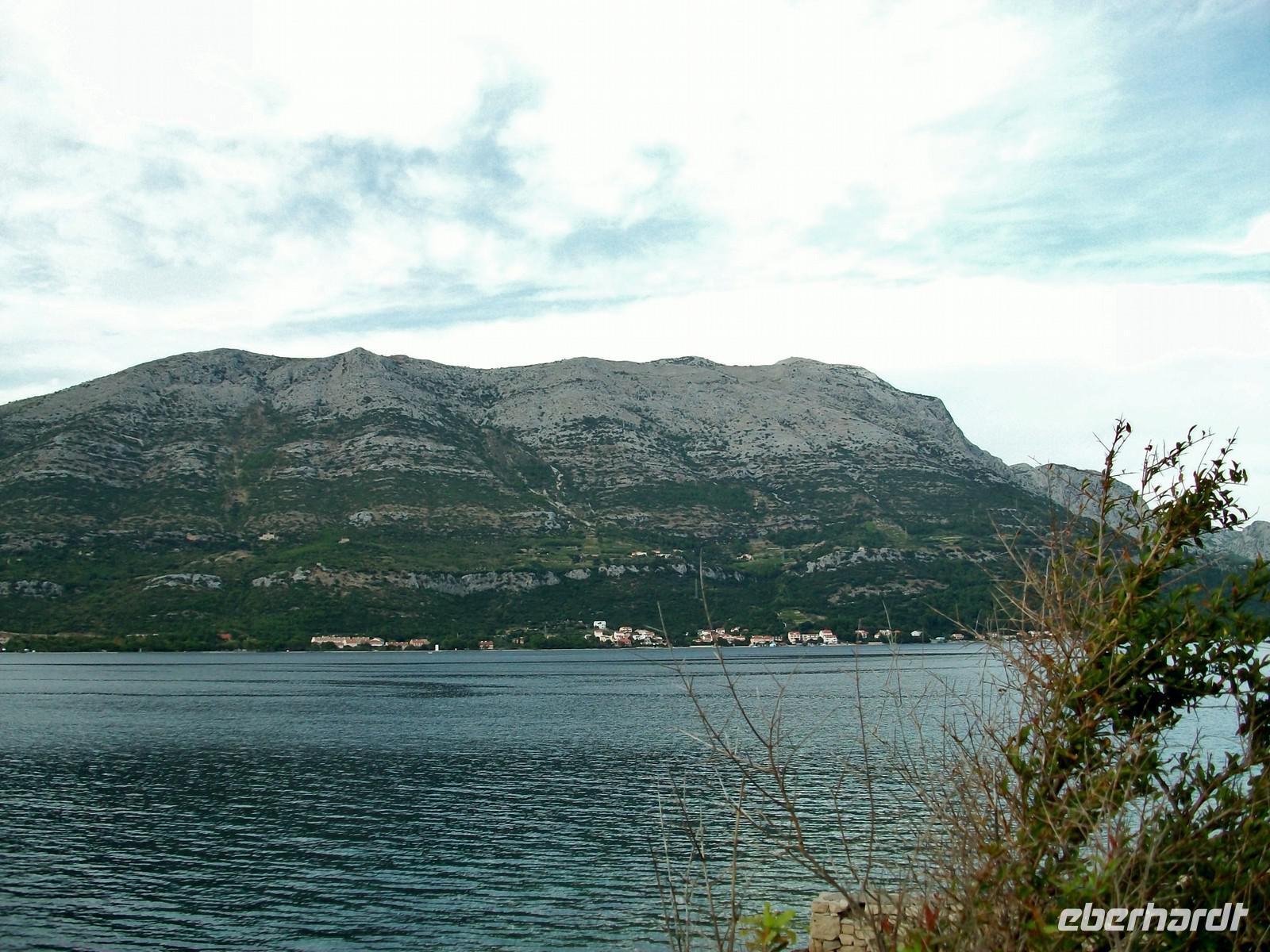 Dann nehmen wir unsere Fahrt auf der Verbindungsstraße wieder auf, sie wird uns nach Orebic bringen. Schon von weitem ist der Eliasberg zu sehen, die höchste Erhebung von Pelješac. Gegen elf erreichen wir bei sonnigem Hochsommerwetter die Fähre, sie wird uns eine halbe Stunde später sicher auf die Insel Korcula bringen.