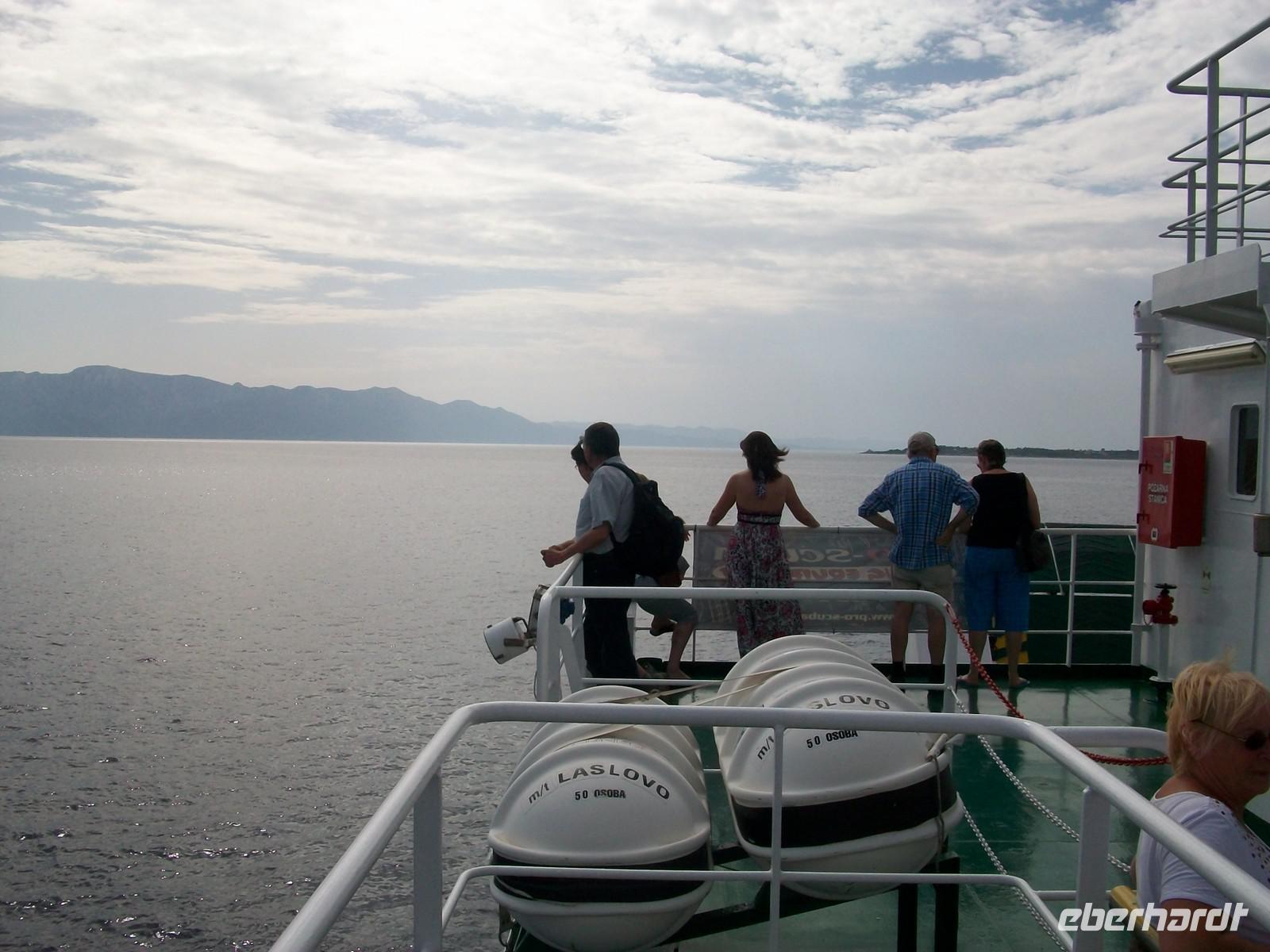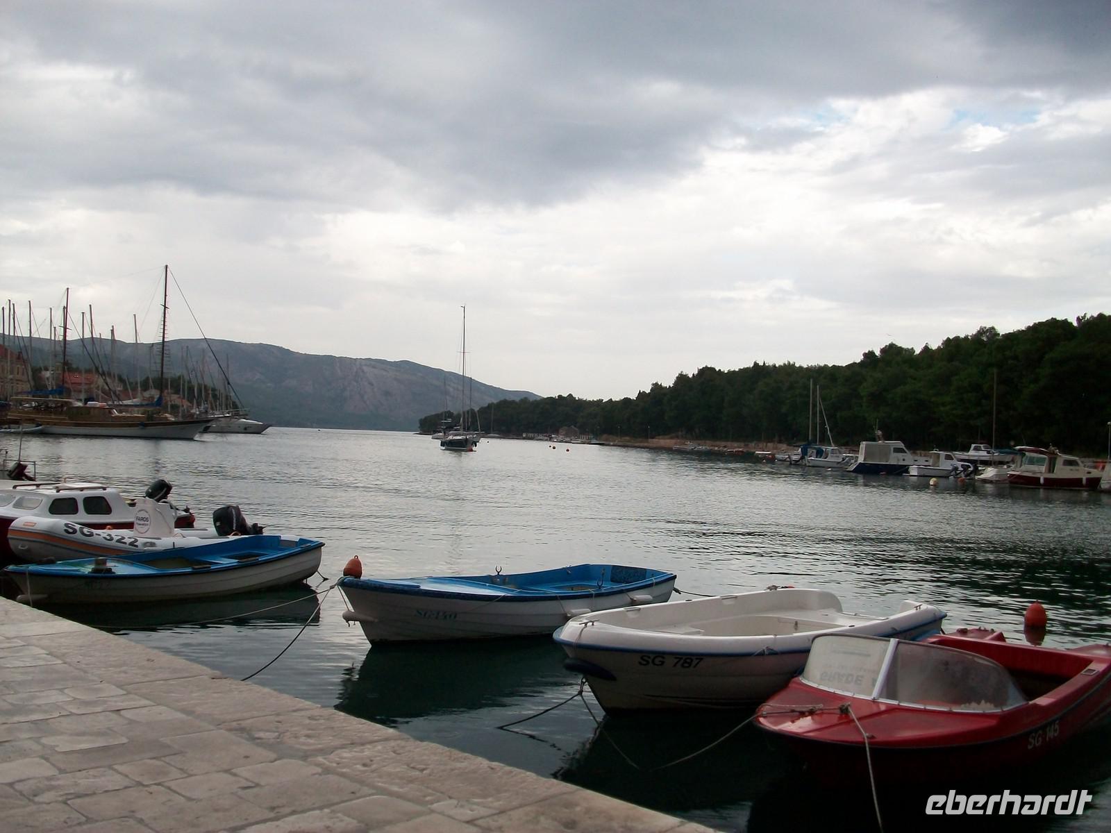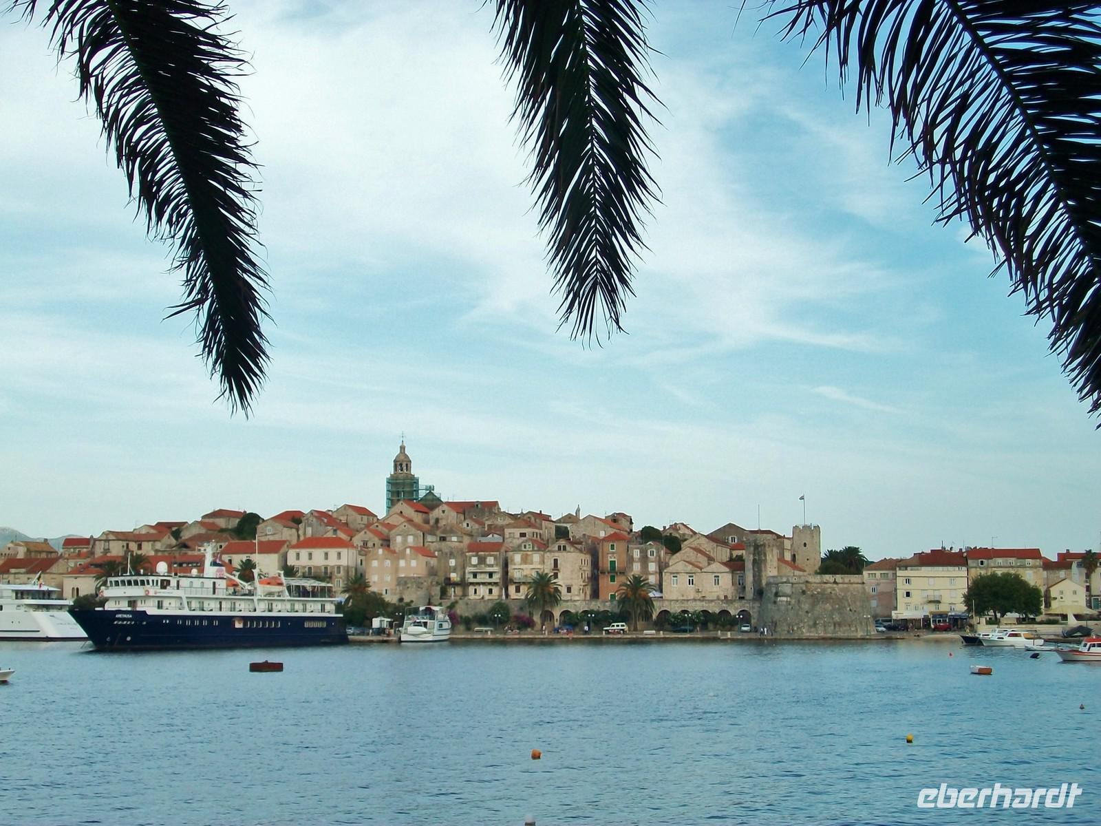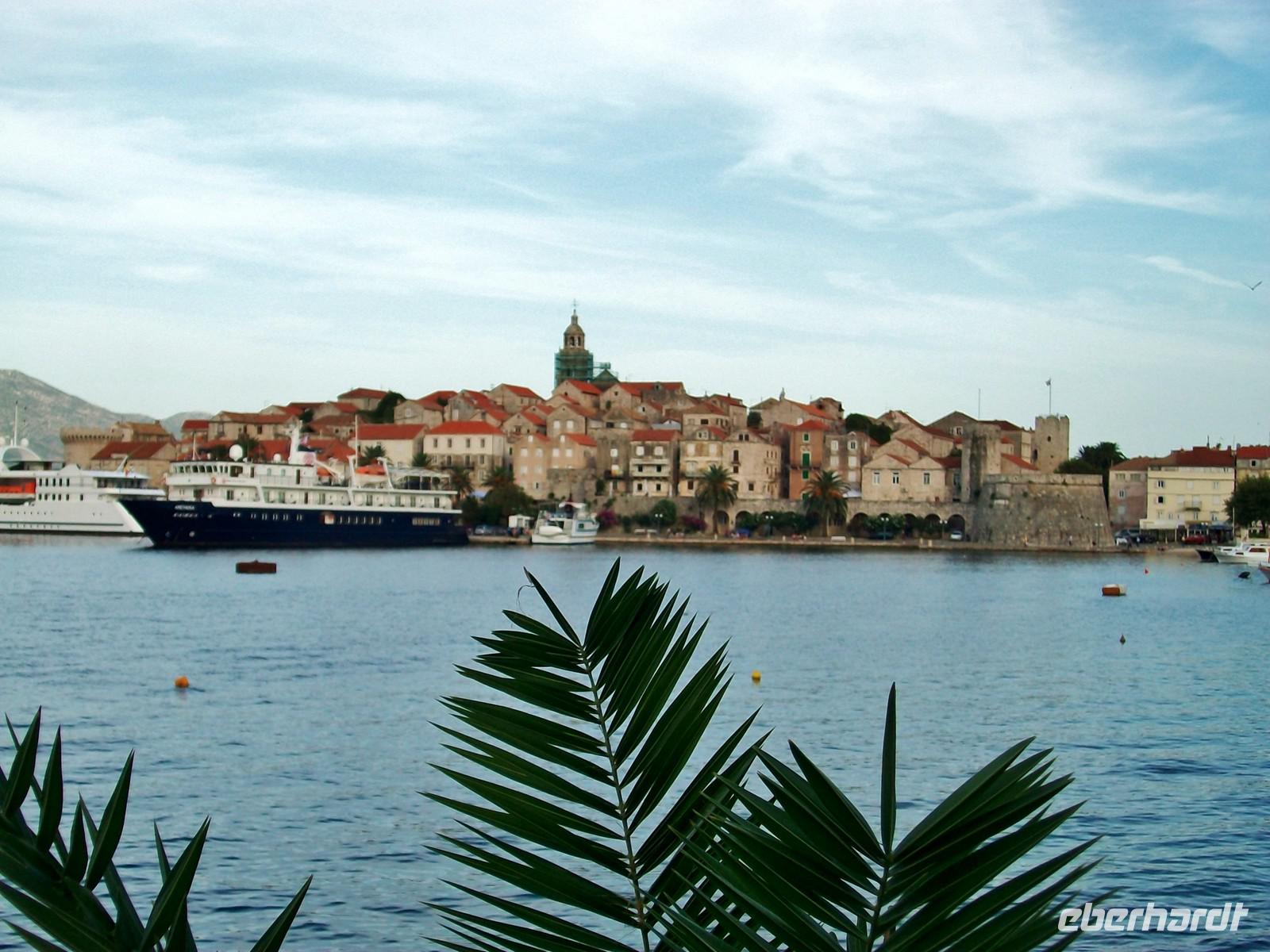 Dann nehmen wir unsere Fahrt auf der Verbindungsstraße wieder auf, sie wird uns nach Orebic bringen. Schon von weitem ist der Eliasberg zu sehen, die höchste Erhebung von Pelješac. Gegen elf erreichen wir bei sonnigem Hochsommerwetter die Fähre, sie wird uns eine halbe Stunde später sicher auf die Insel Korcula bringen.