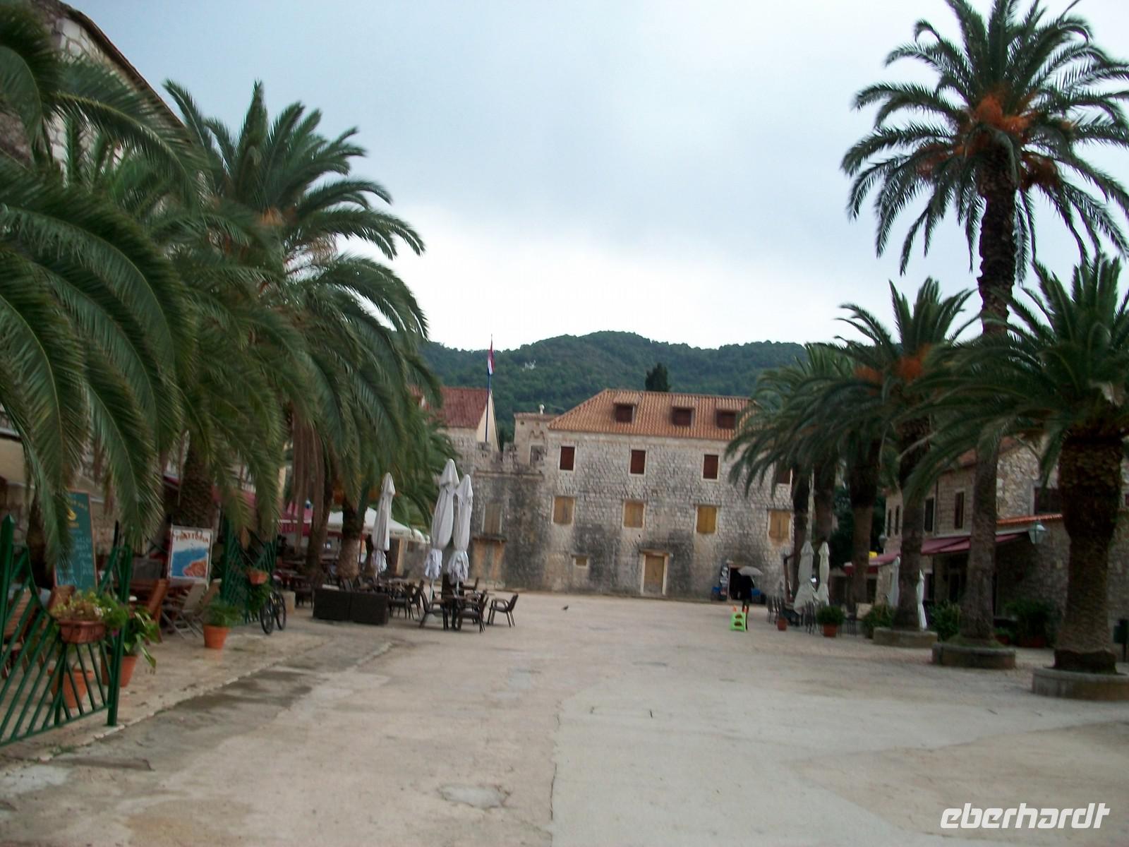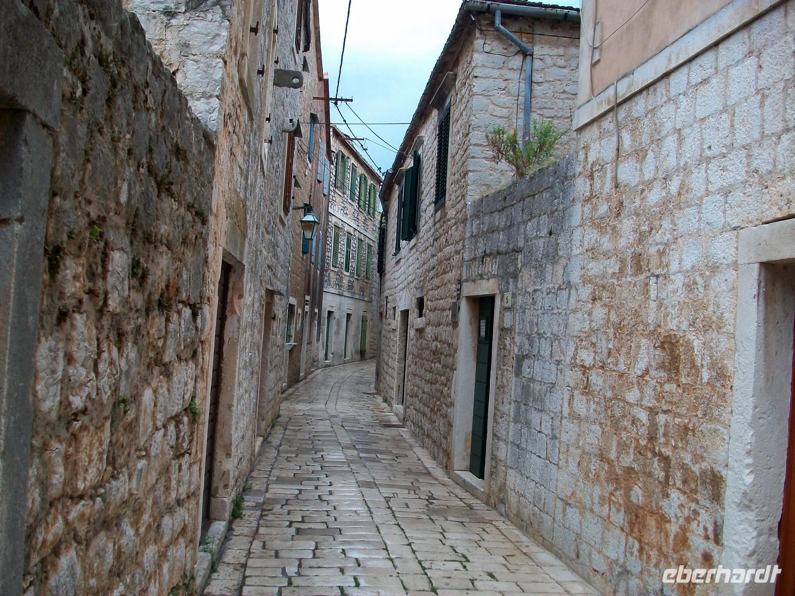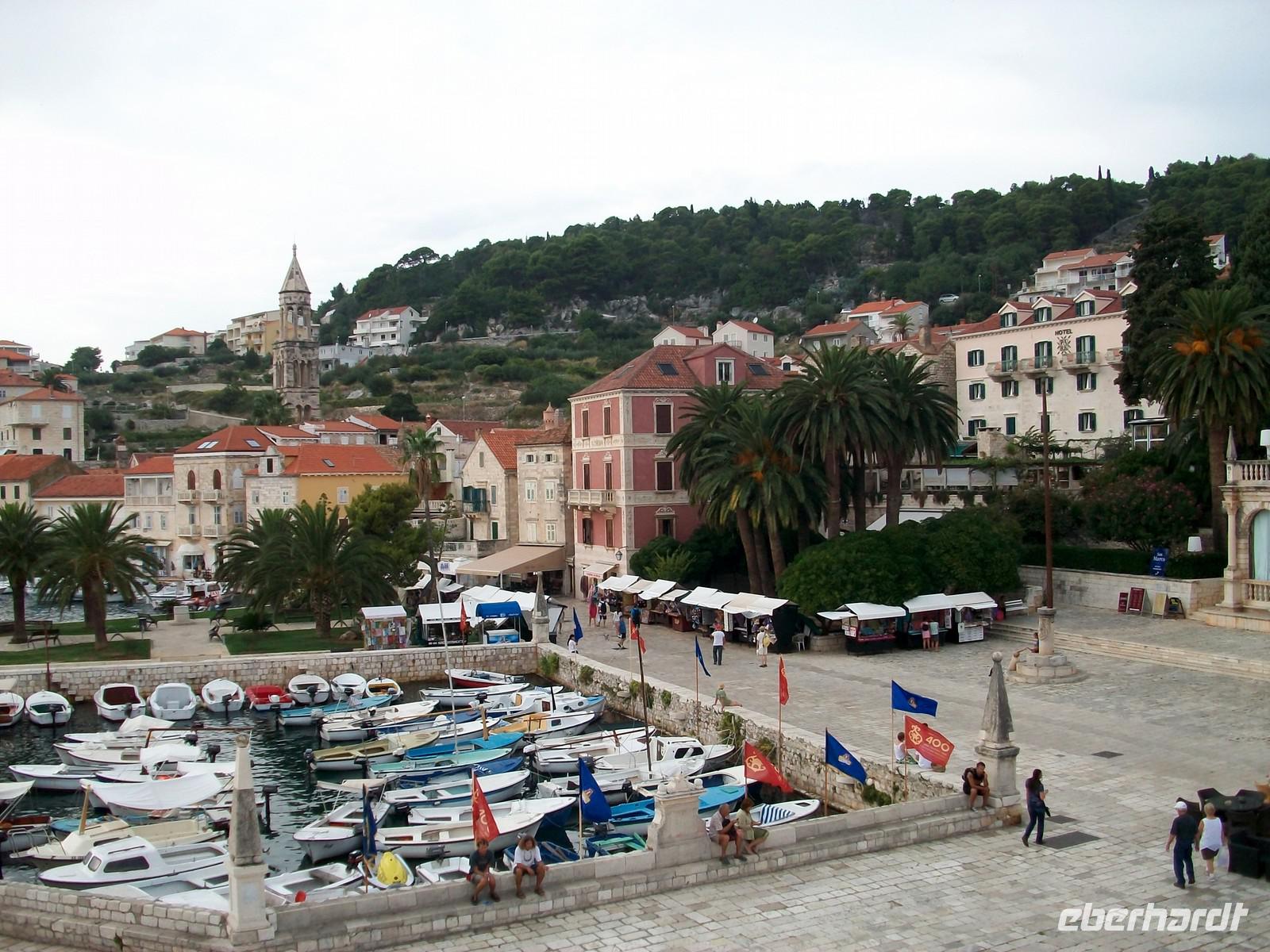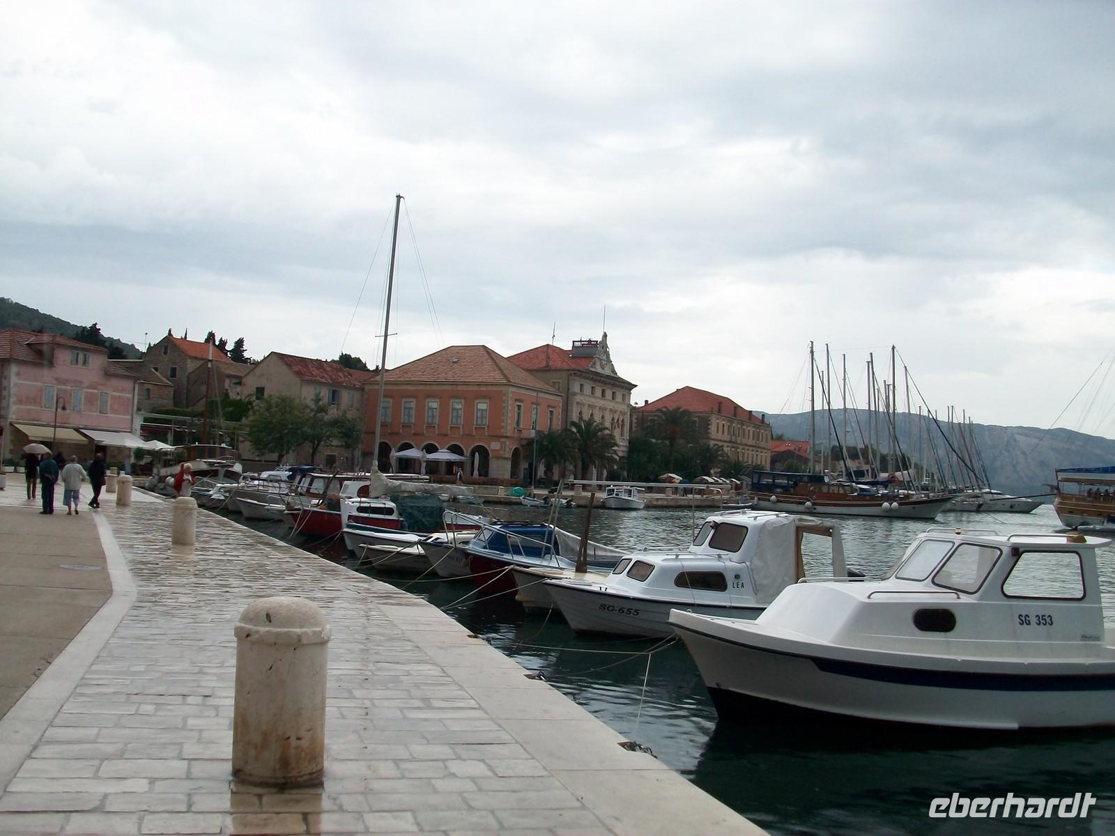 Auch wenn dieser Ort von den Griechen gegründet wurde, das Stadtbild ist heute davon geprägt was uns die Venezianer hinterließen. Da ist der große Hauptplatz mit der Kathedrale, dort sind wieder schmale und romantische Gassen mit den schönen Häusern aus unverputztem Kalkstein. Von der Balustrade des Arsenals blicken wir hinunter in die Stadt und sehen hierbei auch die zwei Festungen oben am Berg. Wir schlendern mit Jasna entlang der schönen Uferpromenade, hier sind zahlreiche Boote festgemacht die lustig auf den Wellen schaukeln. Da hier zurzeit relativ wenige Touristen unterwegs sind genießen wir einen schönen Nachmittag in diesem pittoresken Ort. Nachdem sich unsere Stadtführerin verabschiedet hat, verbleibt noch etwas Freizeit, gegen sechs nehmen wir unsere Fahrt wieder auf, wir unterqueren erneut das Inselgebirge und langen nach gut halbstündiger Fahrt an unseren Hotel bei Starigrad an.