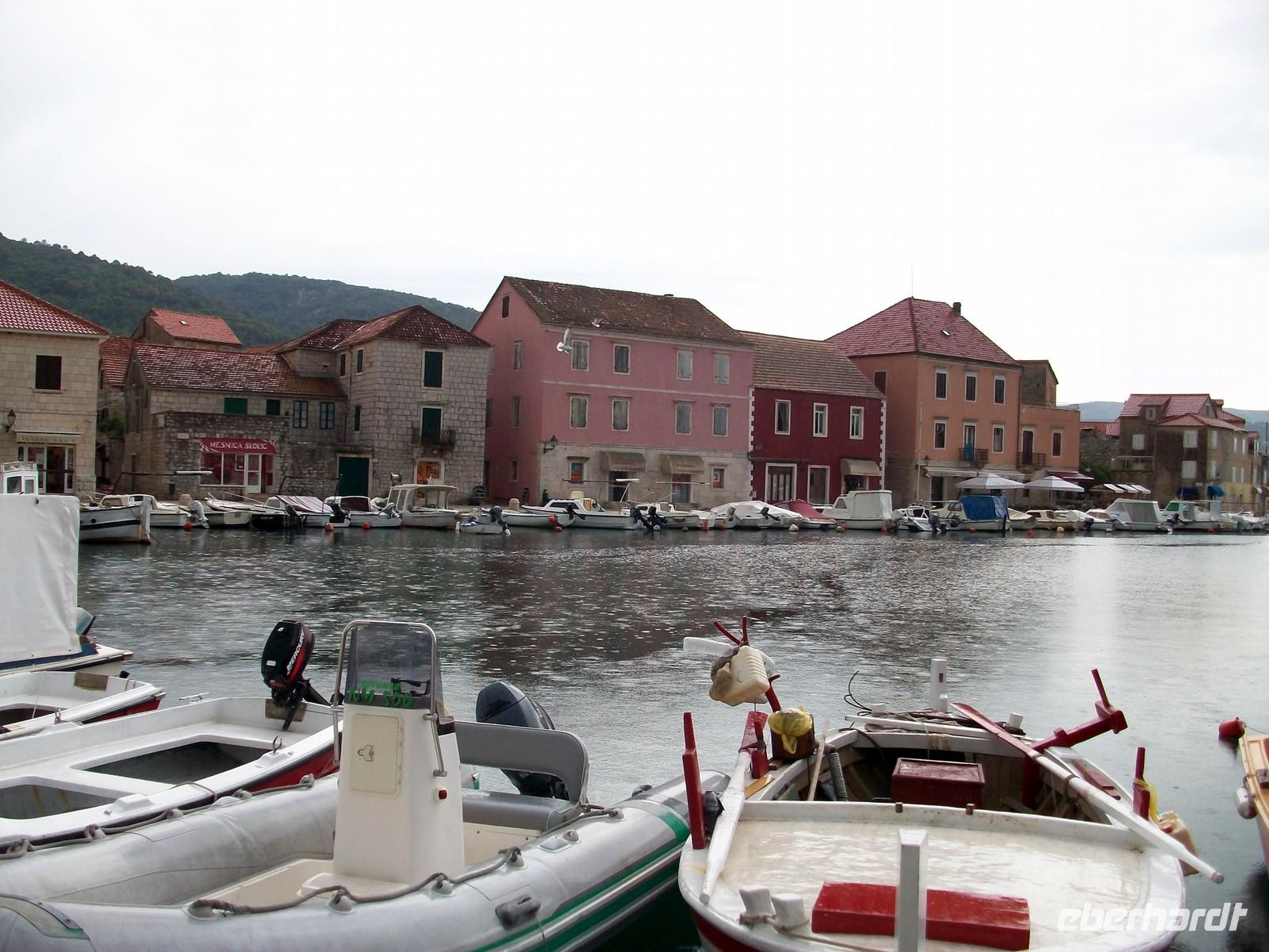 Auf der kurzen Überfahrt haben wir es uns auf dem Oberdeck bequem gemacht und lassen uns die angenehm kühle Morgenbrise um die Ohren wehen. Bald langen wir wieder auf der Halbinsel an und hinter dem Ort Ston sind wir dann wieder endgültig auf dem Festland angekommen. Wir durchfahren noch einmal das Flussdelta der Neretva, uns begleitet dabei ein schöner Sonne- Wolkenmix der immer wieder malerische Ausblicke auf Meer und Festland gestattet. Wir gelangen bald nach Drvenik, hier werden wir zur Insel Hvar übersetzen. Uns verbleibt noch eine Stunde Zeit die wir zu einem Mittagsimbiss nutzen. Ein kleiner Spaziergang im Ort verkürzt die Zeit, pünktlich 13.45 Uhr legt die Fähre ab und wir werden nun eine gute halbe Stunde übersetzen nach Sucurei, dem Fährort auf der Insel Hvar. Die Inselstraße führt uns dann durch sehr unberührtes Land; hier in diesem Teil scheint die Zeit stehen geblieben zu sein. Wir sehen viele verlassene Gebäude, durchfahren Dörfer mit einfachen aber schönen Häusern und bewundern auch hier wieder die üppig grüne Flora.