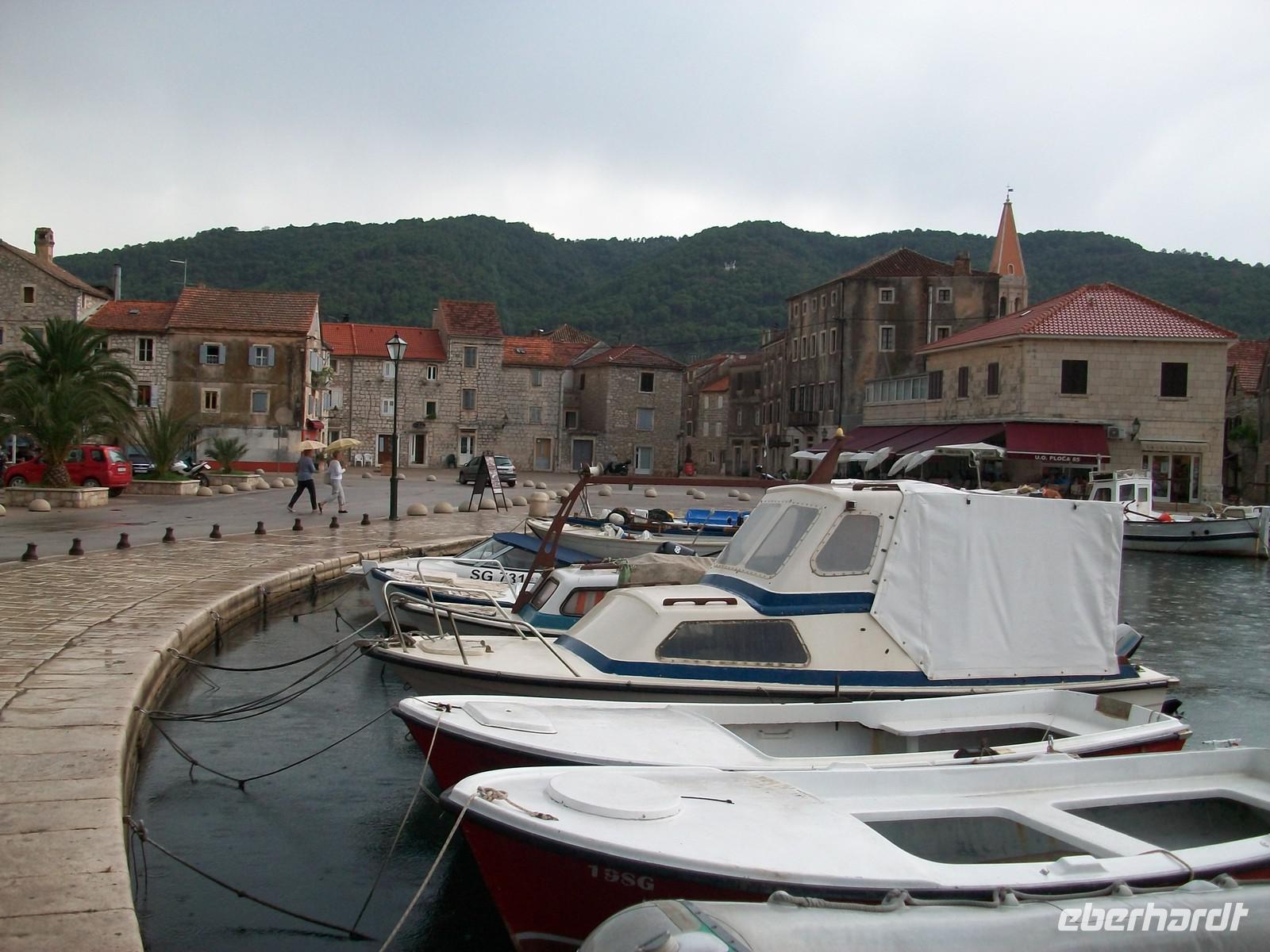 1.10.2012. Heute früh zeigt sich der Himmel bewölkt, Schauer entladen ihre Last zur ungünstigsten Zeit gerade als wir die Koffer verladen. Es liegt eine gewittrige Stimmung in der Luft, doch das stört unseren Tatandrang nicht als wir gegen 9.00 Uhr starten. Nur wenige Minuten und wir sind in Starigrad angelangt; es ist die älteste Siedlung auf der Insel die einst von den alten Griechen begründet wurden. Einige der uralten Grundmauern sind freigelegt, das Ortsbild wird allerdings auch hier durch die Architektur der Venezianer bestimmt.