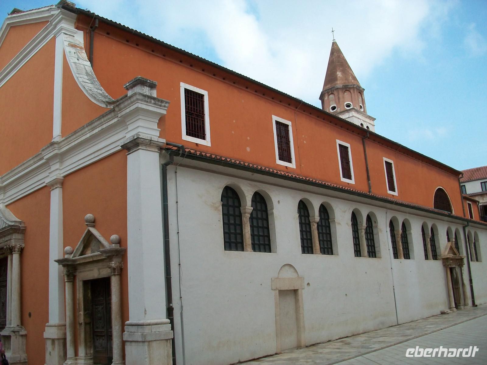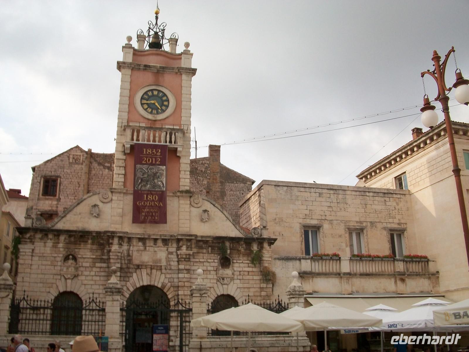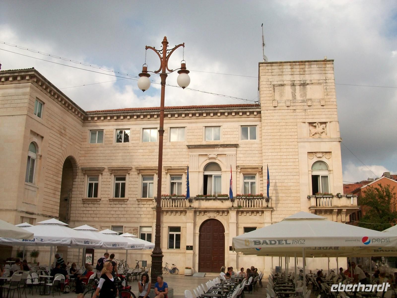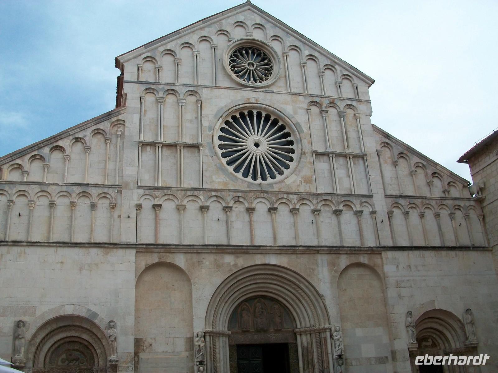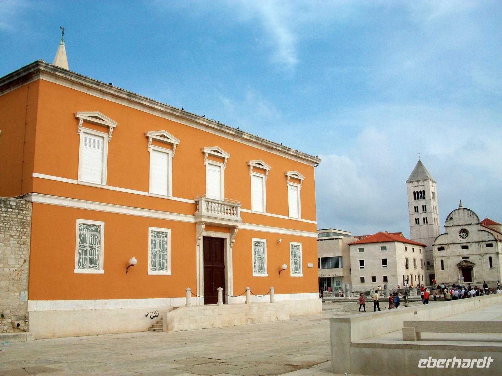 Dann sind wir im Hinterland unterwegs, der Himmel hat sich wieder bezogen, dunkelblaue Wolken drohen mit Gewitter. Doch vorerst bleiben wir unbehelligt unser Ziel heißt Zadar welches wir gegen 15.40 Uhr erreichen. Hier werden wir schon von meinem Kollegen Edi erwartet der uns nun wieder auf den Schwingen der Zeit in die Vergangenheit entführen wird. Das beginnt hier alles im Römischen Imperium, das einstige Forum Romanum ist noch in seinen Umrissen erhalten geblieben, mit Fragmenten aus dieser faszinierenden Epoche. Doch am Rand des Forums ist dann zu christlicher Zeit die Rotunde der Donatskirche entstanden die mit ihrer vorromanischen Architektur das Auge erfreut. Dahinter der Glockenturm der Kathedrale und auch einiges Modernes welches nach dem 2. Weltkrieg entstand. Dann lenken wir unsere Schritte über das glänzende Kalksteinpflaster zum Hauptplatz. Er ist umstanden von schönen Gebäuden und hier findet das lustige Treiben von Einheimischen und Touristen statt. Edi erklärt uns die Funktionen der Gebäude und danach gehen wir noch einige Schritte bis zur Simonskirche. Hier verabschiedet sich unser Stadtführer und bevor er uns verlässt beantwortet er geduldig die zahlreichen Fragen unseres wissbegierigen Publikums.
