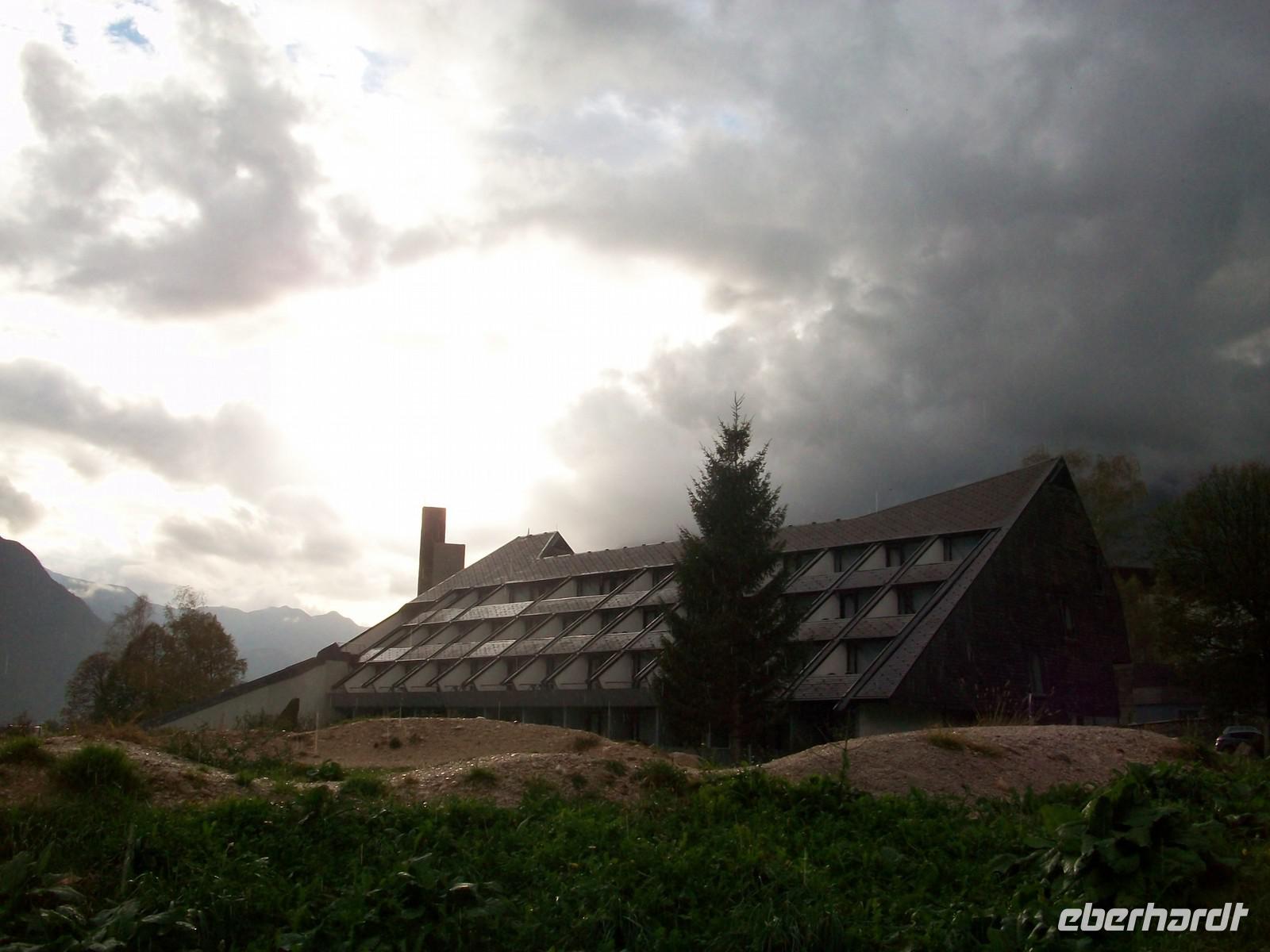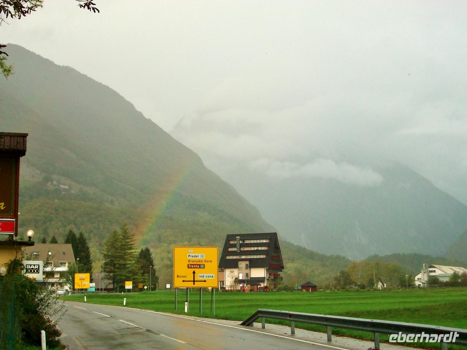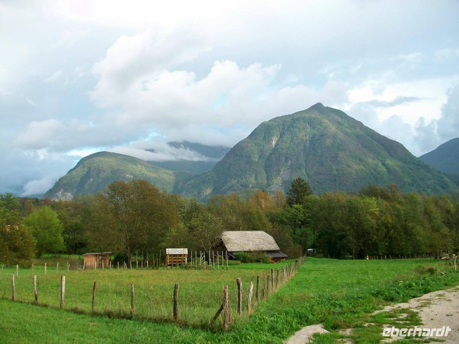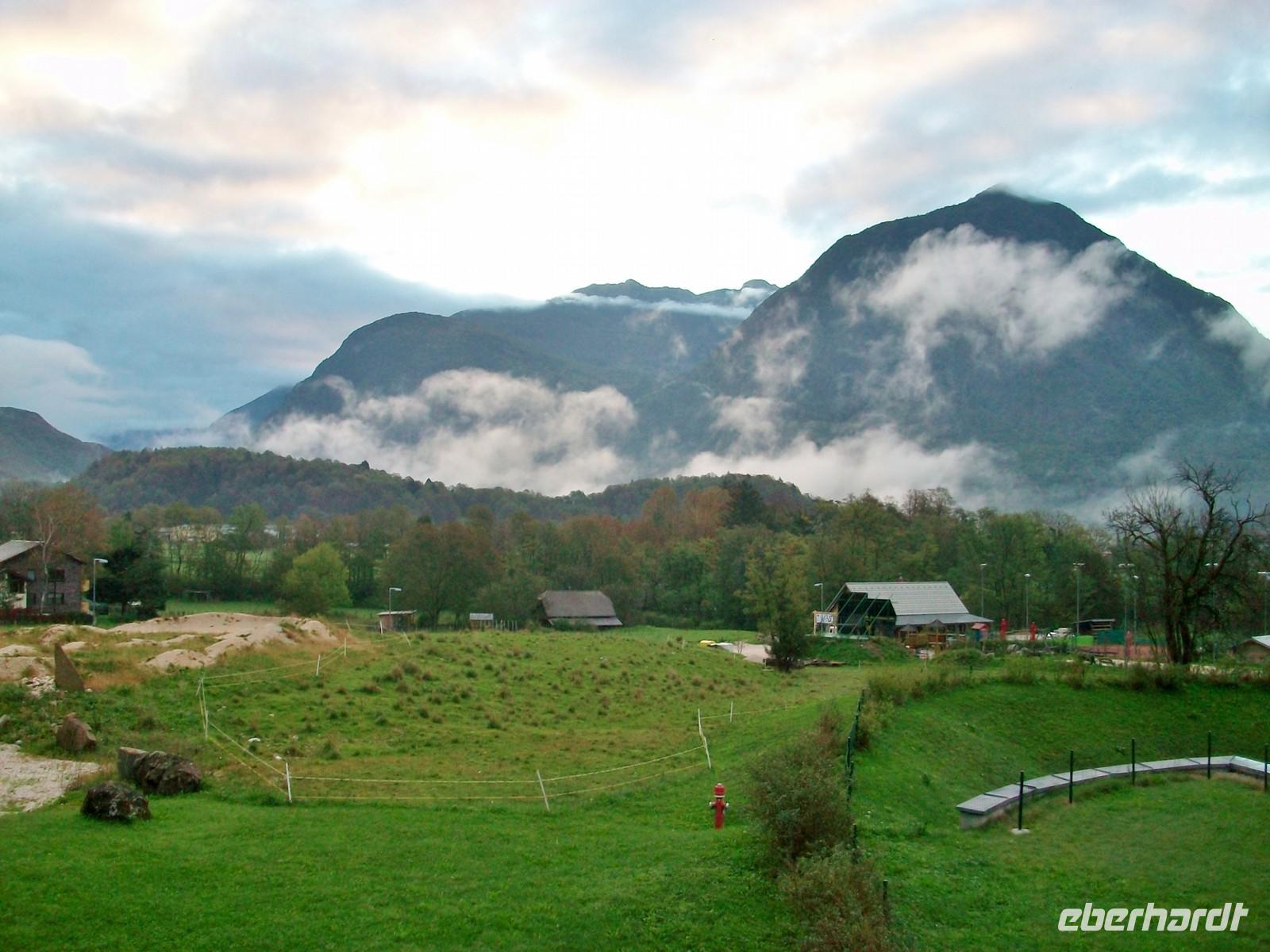 Gegen 16.30 Uhr kommen wir in Bovec an und haben bald darauf die schönen Zimmer im Hotel Kanin bezogen. Für den Rest des Nachmittags bleibt noch Zeit für einen schönen Spaziergang in dieser einmaligen Bergkulisse. Gleich hinter dem Hotel steigt der Kanin auf über 2 000 Meter an, leider ist das Vergnügen nicht ungetrübt, immer wieder gehen kleinere Schauer nieder, aber dagegen gibt es Regenschirme. Ich glaube das hat keinen unserer Gäste wirklich gestört, zum letzten Abendessen dieser Tour trifft sich unsere Reisegruppe im geräumigen Restaurant und die munteren Gespräche zeugen davon, dass wohl alle noch einen schönen Nachmittag erleben konnten. Etwas Wehmut ist allerdings auch dabei, morgen wird diese schöne Reise nun zu Ende gehen, viel zu schnell verging doch die Zeit...