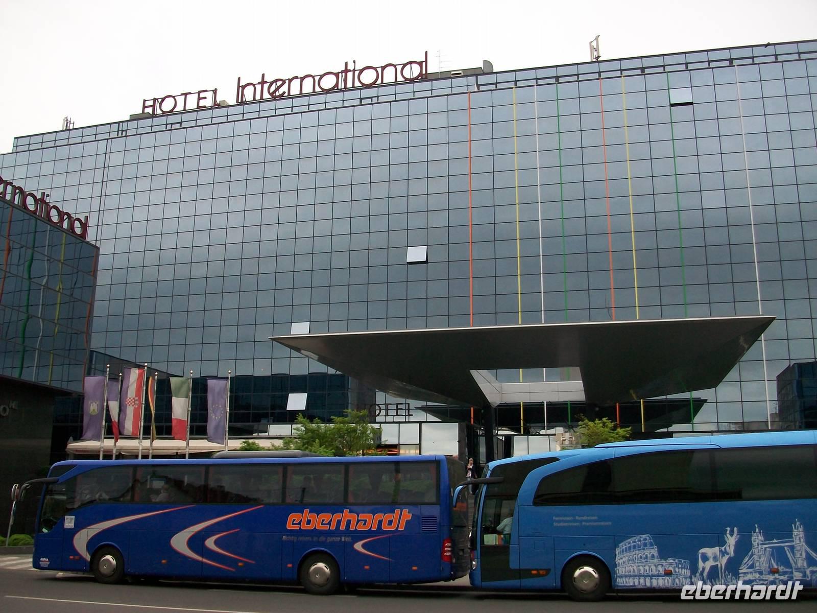 Nach dem reichhaltigen Frühstück, welches uns die erste Stärkung für den Tag bringt, fahren wir kurz vor neun los und lassen bald die Berge hinter uns. Im südlichen Teil der Steiermark durchfahren wir flacheres Land, nach der Grenze zu Slowenien sehen wir rechts das Pohorje- Gebirge bei Maribor und sind nun unterwegs zur kroatischen Grenze, hier benötigen wir etwas Geduld für die nötigen Formalitäten. Doch auch das geht zügig voran, leider hat Petrus wieder dicke Wolken vor den Himmel geschoben, auch der Zagreber Berg vor uns ist davon eingehüllt. Nach einem kleinen Mittagsimbiss gelangen wir gegen eins zu unserem sehr schönen 4- Sterne- Hotel „International" und können trotz der frühen Stunde schon einmal die Zimmer beziehen.
