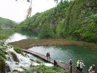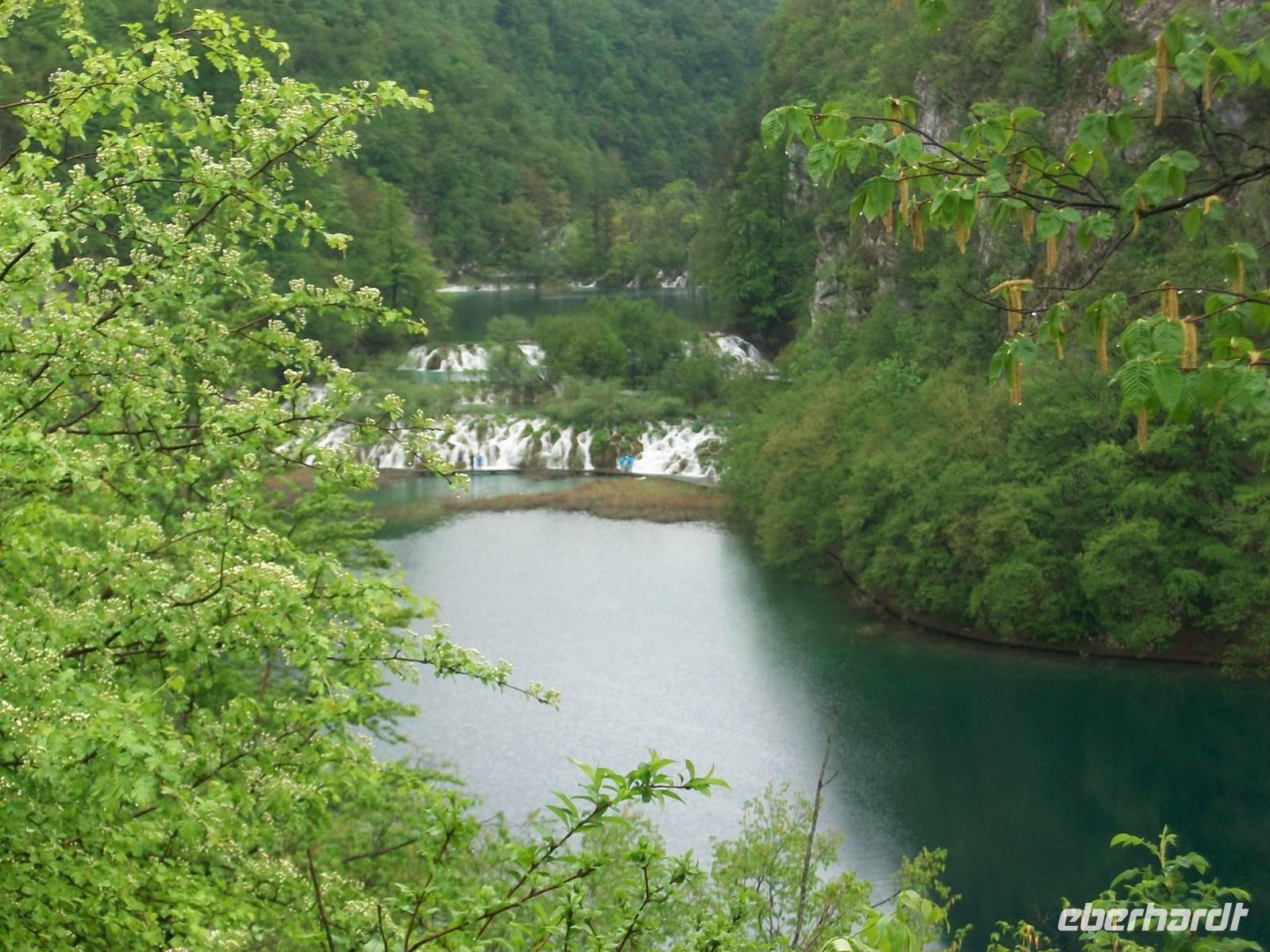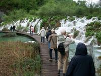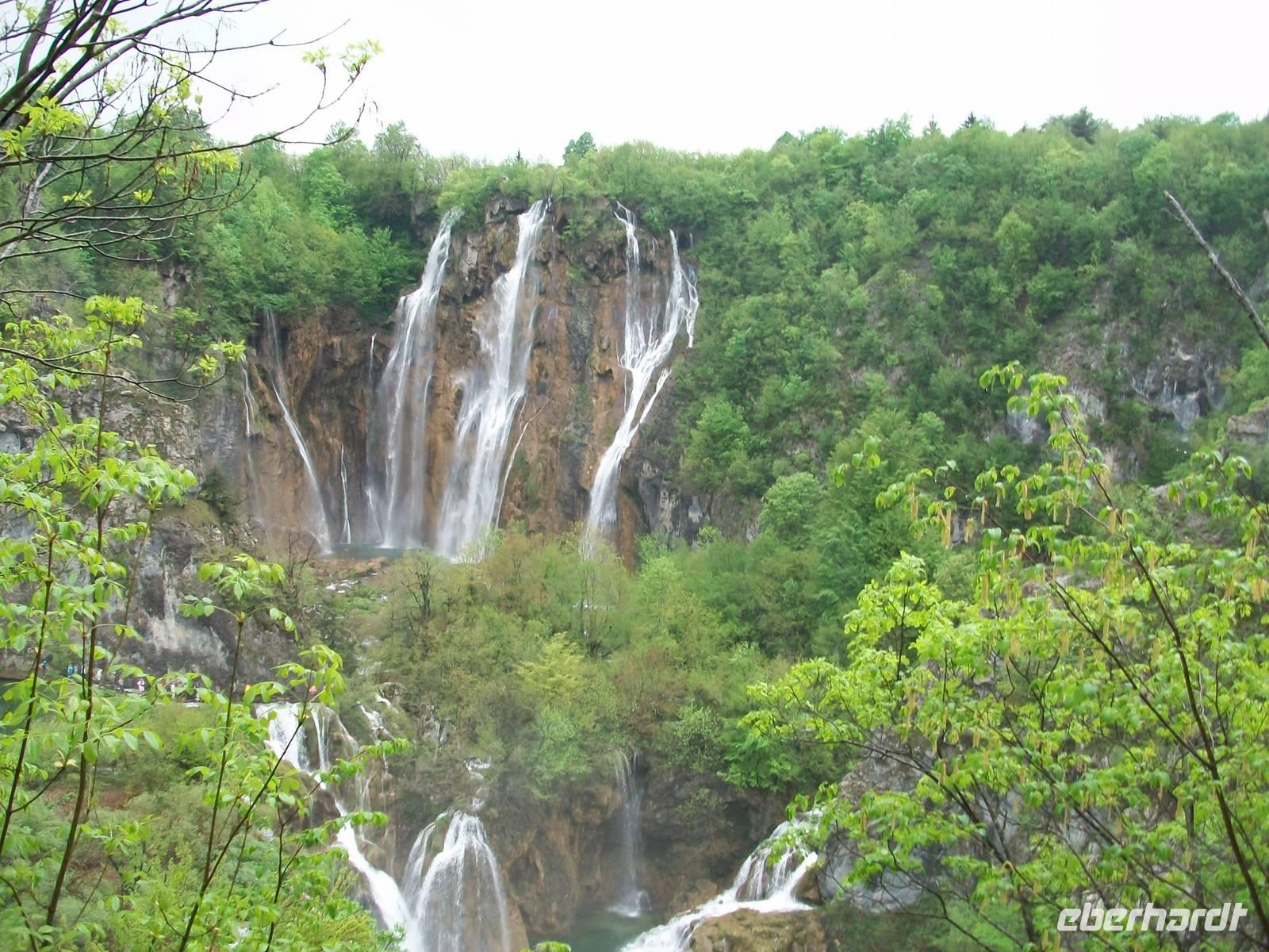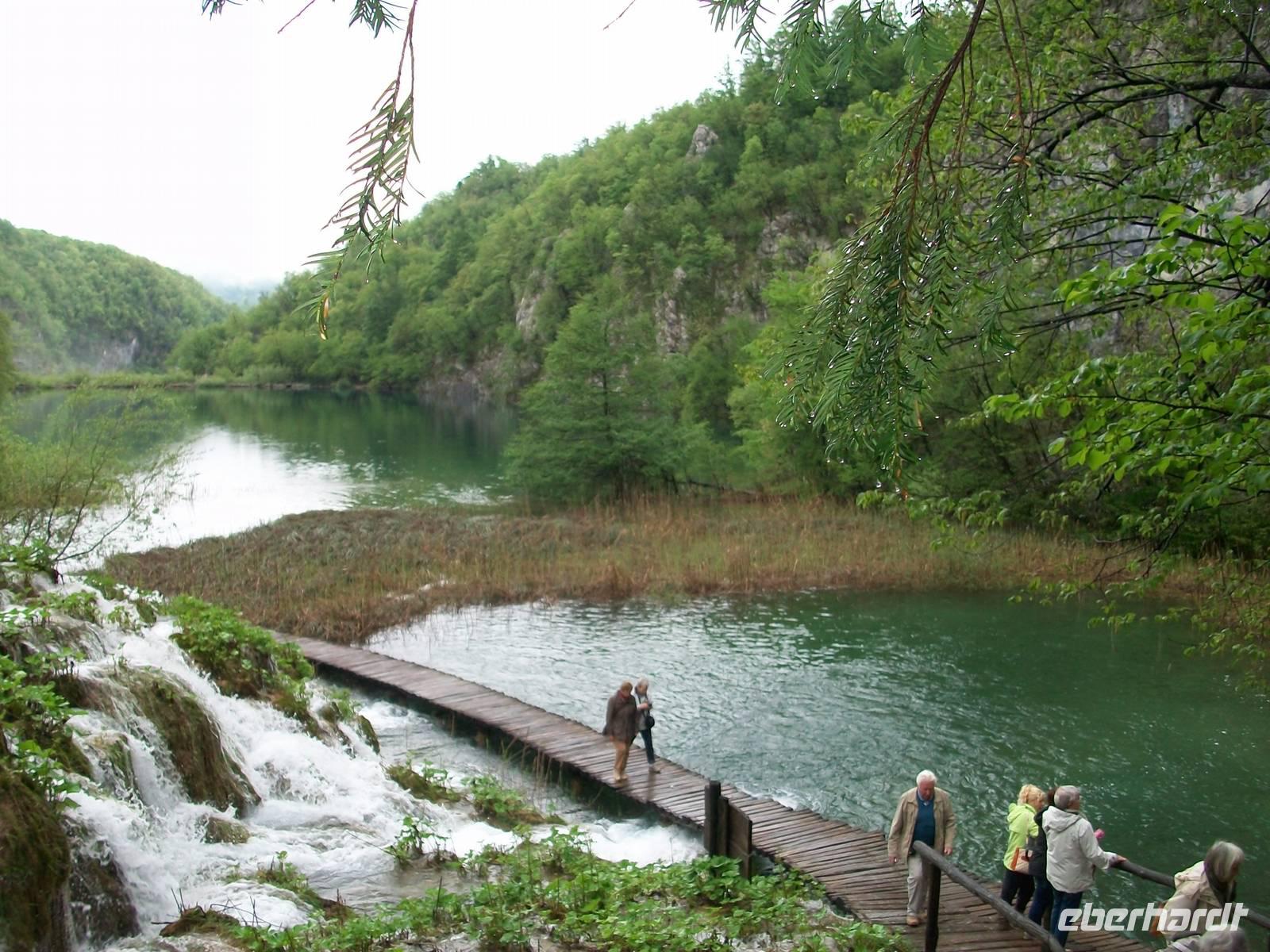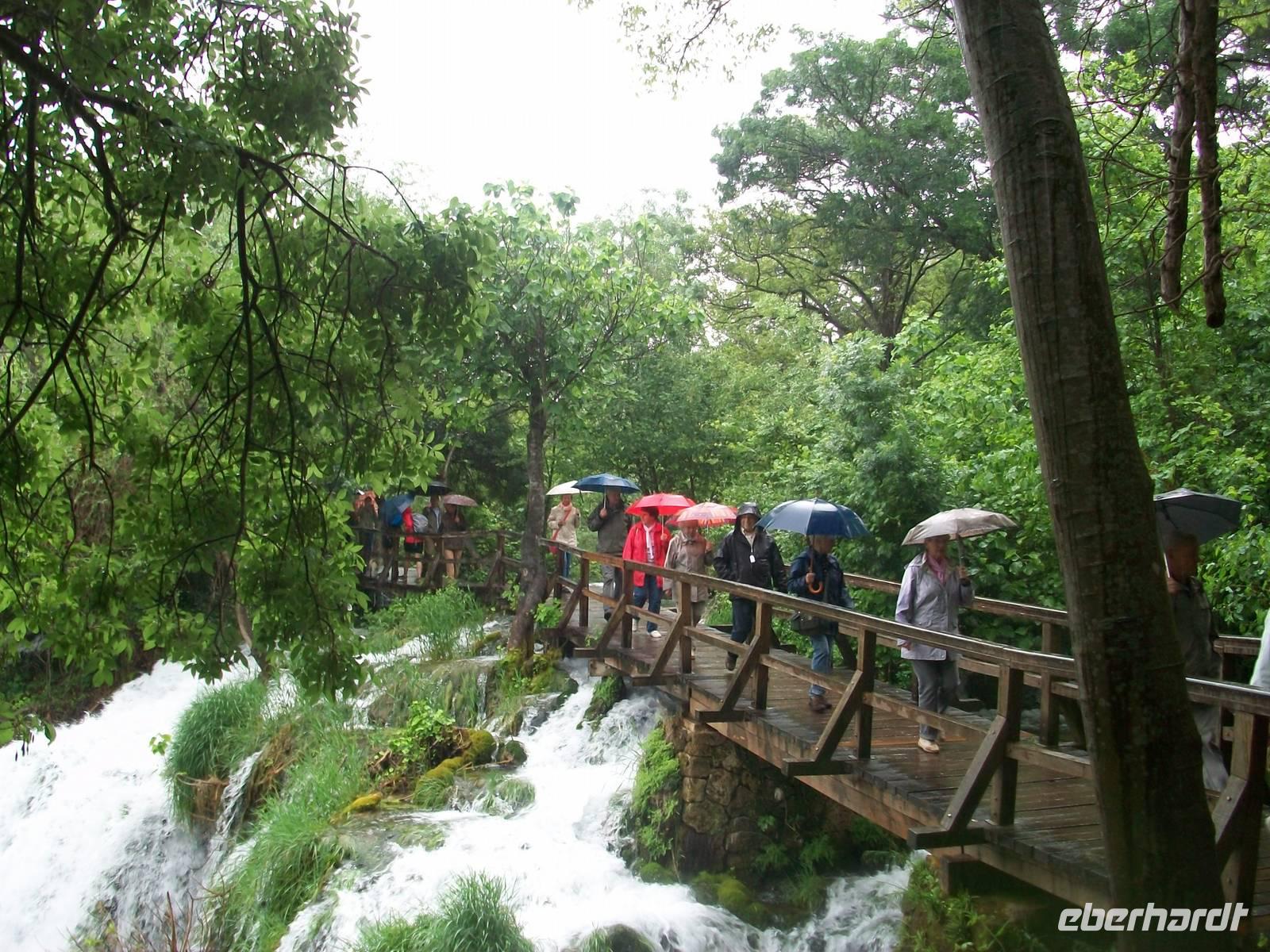Dicke Wolken versperren uns die Sicht als wir nach Karlovac auf der Landstraße unterwegs sind. Das Land sieht heute trostlos aus und als wäre das noch nicht genug- da muss Petrus nun auch wieder die Himmelsschleusen öffnen. Aber das stört unseren Tatendrang nicht; nachdem wir kurz am Hotel waren beginnen wir gegen halb eins unseren Rundgang im Nationalpark der Plitwitzer Seen. Auch wenn der Regenschirm heute unser ständiger Begleiter bleibt, so können wir dennoch all die Wunder genießen die dieser schöne Park zu bieten hat. Staunend stehen wir vor dem Großen Wasserfall der seine Wasser donnernd zur Erde sendet, gehen dann später immer bergauf an den verschiedenen Seen und den eindrucksvollen Kaskaden vorbei die sich hier im Karst gebildet haben.
