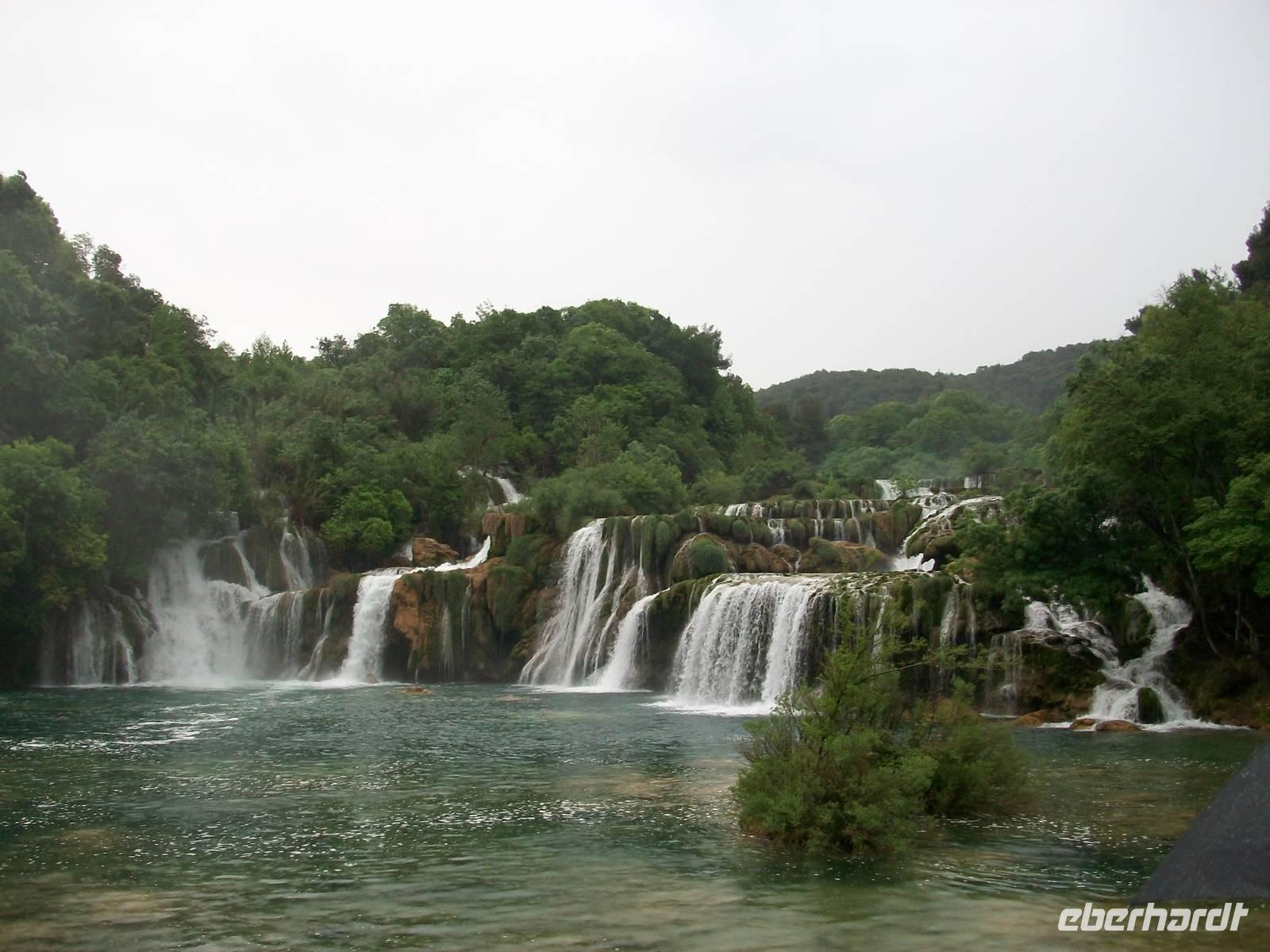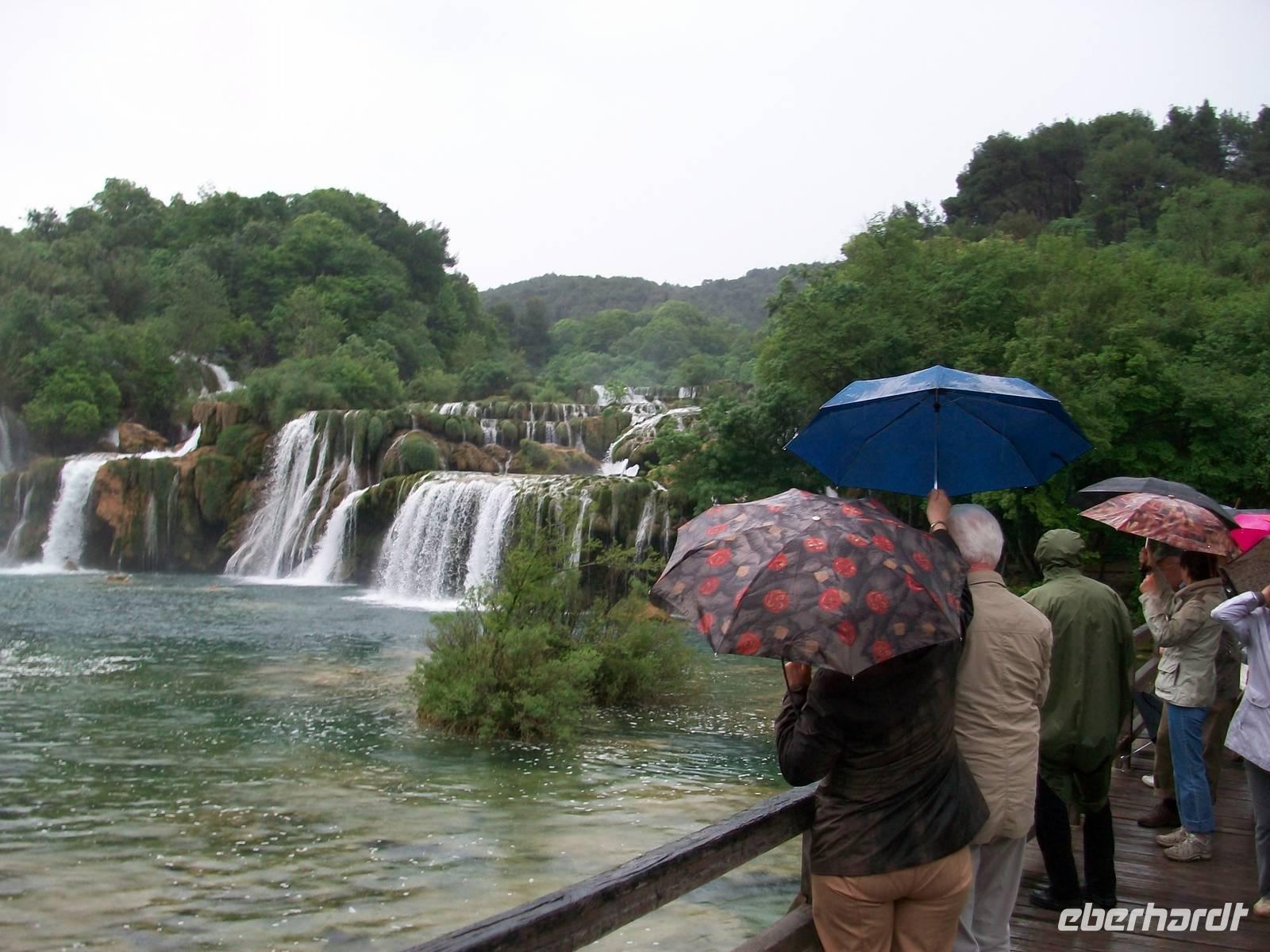Gegen Mittag sind wir dann schon auf dem Weg zum Krka- Nationalpark, leider beginnt sich der Himmel erneut zu beziehen, am oberen Rastplatz, auf dem wir einen kleinen Mittagsimbiss zu uns nehmen, fängt es wieder an zu regnen. Nun sendet Petrus auch noch Blitz und Donner- aber das stoppt unsere Entdeckerfreude nicht, gut gerüstet beginnen wir den Rundgang um den Skradinski Buk. Es ist der mächtigste Wasserfall im Park und es ist immer wieder beeindruckend wie das Wasser rauschend zu Tal fällt, bei unserem Rundgang sind wir immer mittendrin.