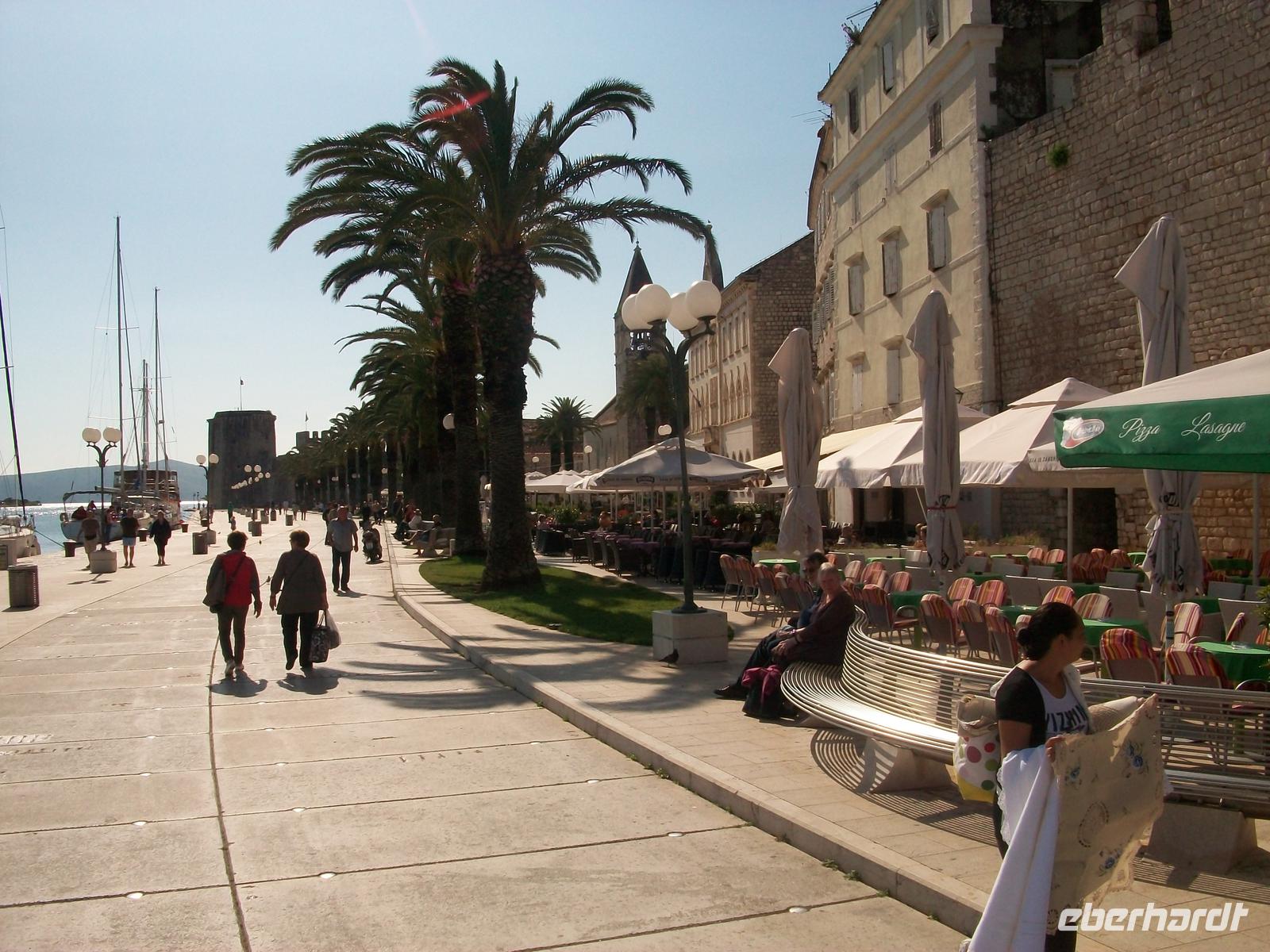 Gegen vier langen wir in Trogir an, hier beginnt die Zeitreise in die Vergangenheit dieser Region. Wir tauchen ein in die schmalen Gassen der vergangenen Jahrhunderte, atmen den Geist einer längst vergangenen Epoche und staunen über die schönen Gebäude aus Kalkstein die uns aus dieser Zeit erhalten geblieben sind. Quirliges Leben herrscht am Hauptplatz, Kathedrale und Stadtloggia zeugen von einstiger Macht; hat der Besucher dann den Stadtkern verlassen so steht er auf der schönen Promenade, hier laden zahlreiche Cafés zu einem Besuch ein. Die am Kai festgemachten Schiffe schaukeln leise auf den Wellen und die Sonne meint es wirklich gut an diesem schönen Nachmittag.