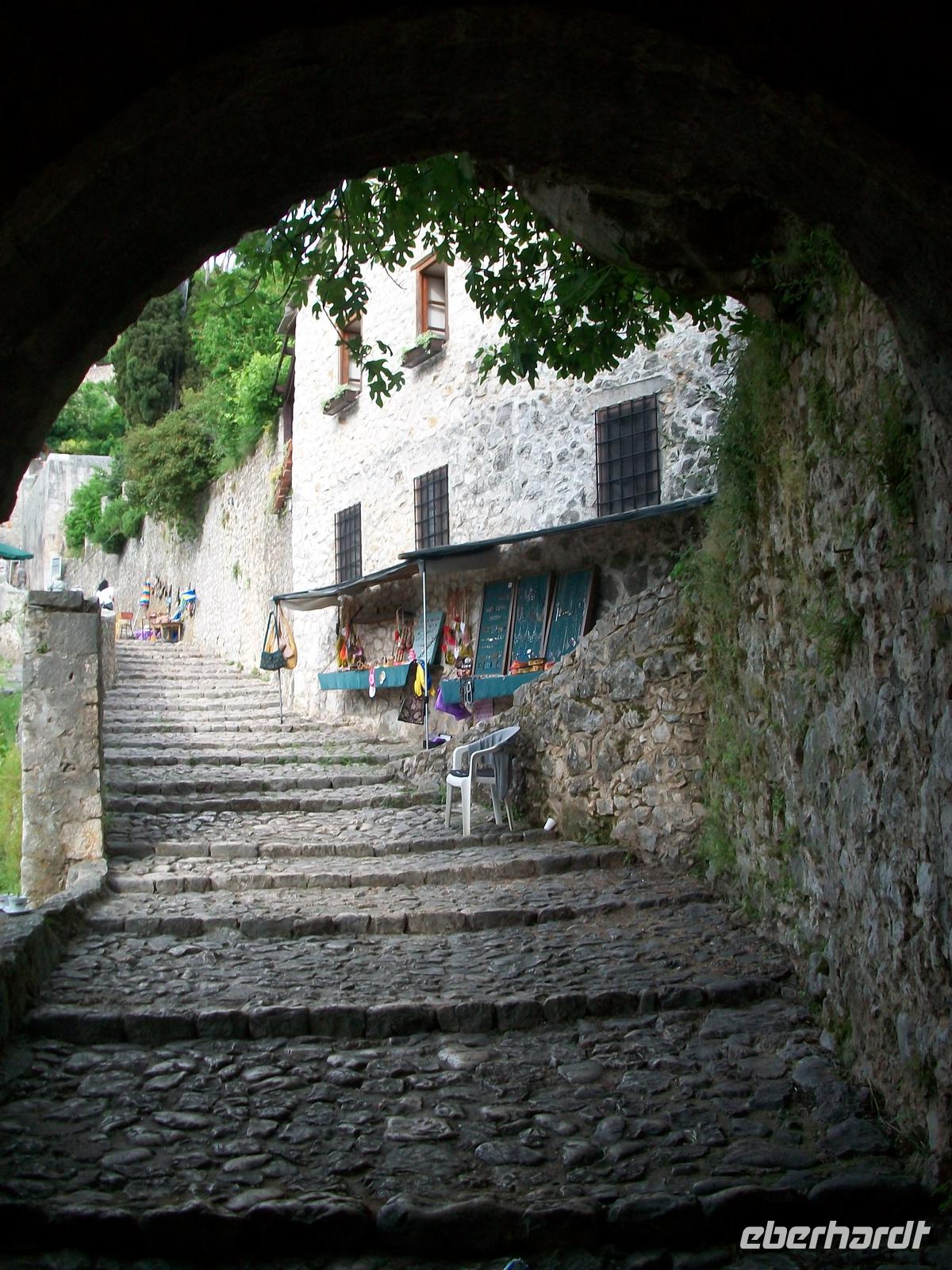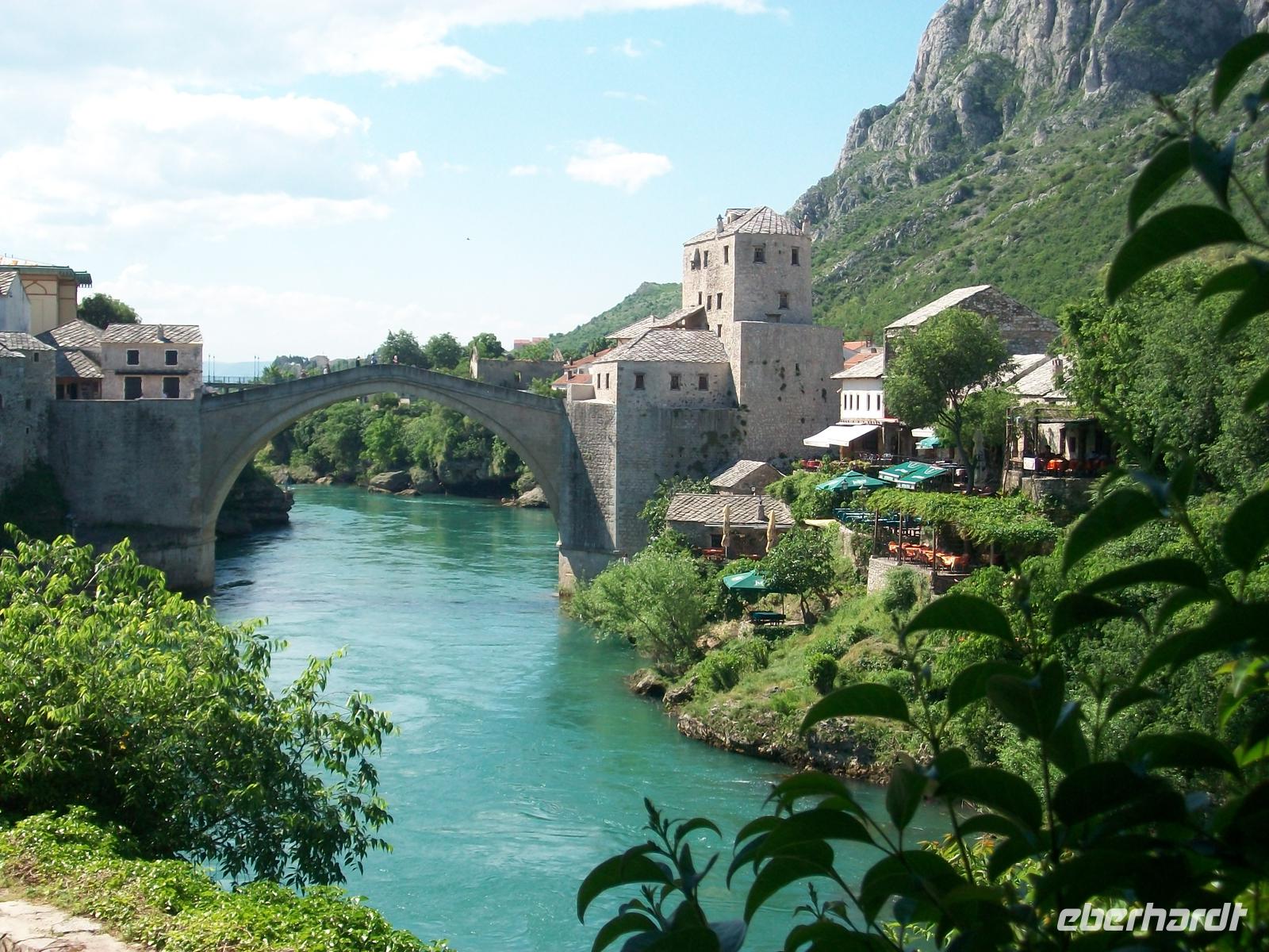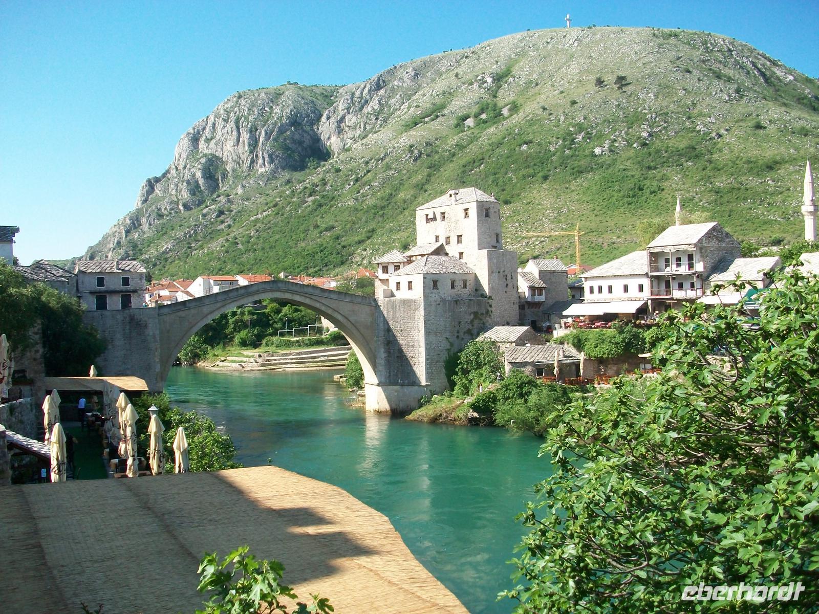 Schnell sind wir wieder im Morgenland angekommen, es ist noch früh am Tag und daher herrscht hier auch noch angenehme Ruhe. Bald ist die Alte Brücke, das Wahrzeichen von Mostar erreicht, tief unter diesem schönen Bauwerk fließt die Neretva dahin, sie bildet kleine Strudel. Am gegenüberliegenden Ufer kommen wir durch eine schmale Gasse hindurch; zahlreiche Souvenirhändler bieten ihre teils kuriosen Waren feil, und bald haben wir einen schönen Ausblick auf die Brücke.