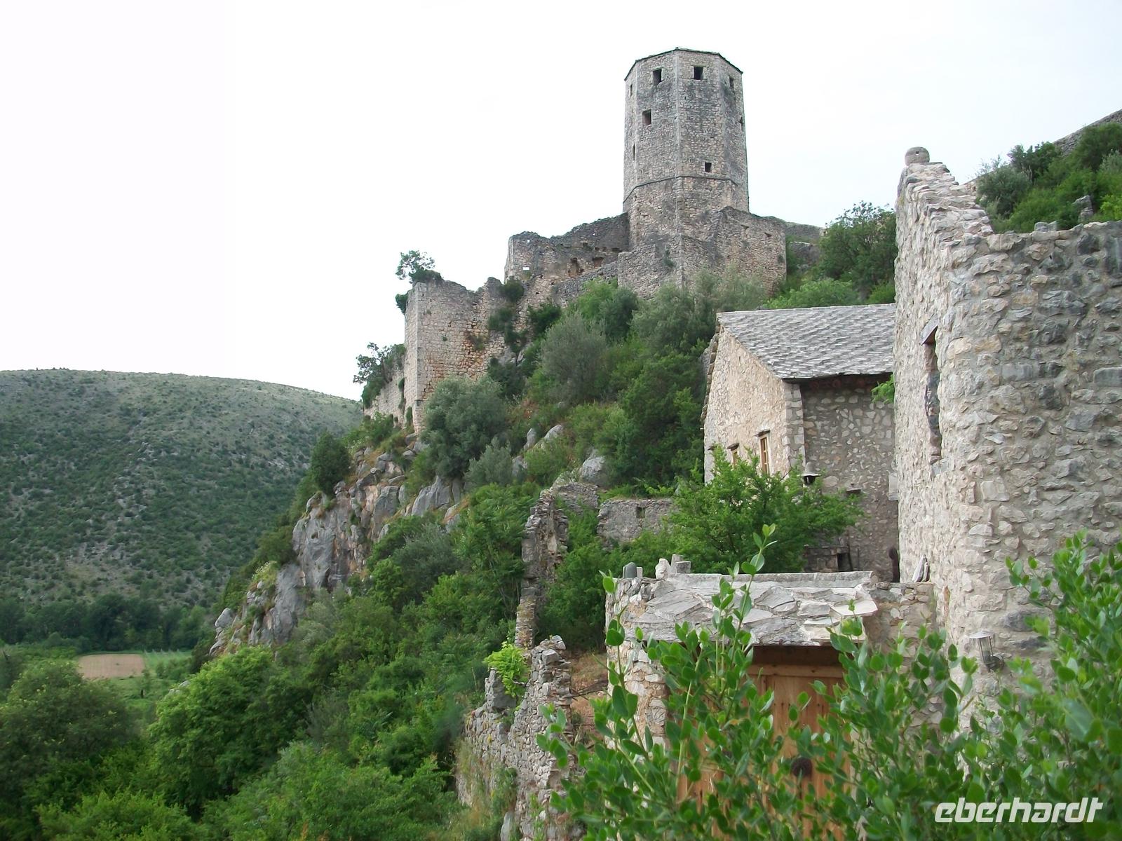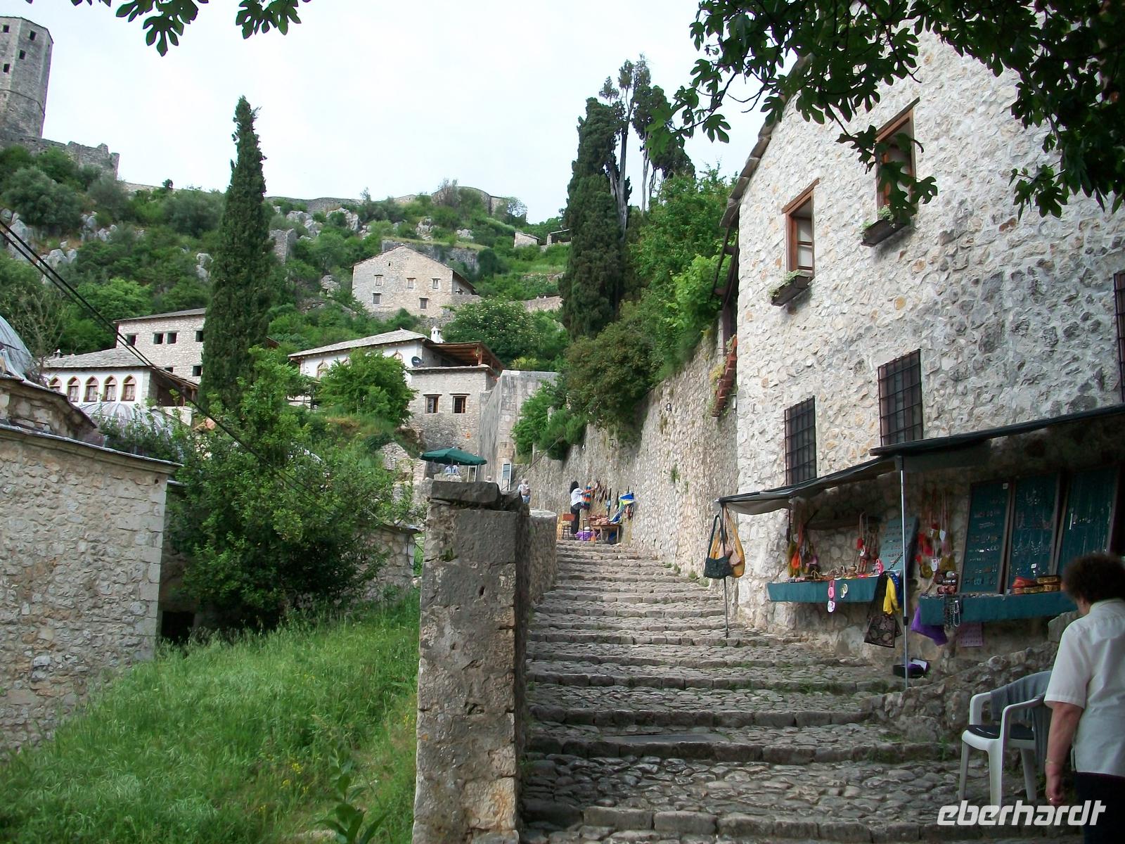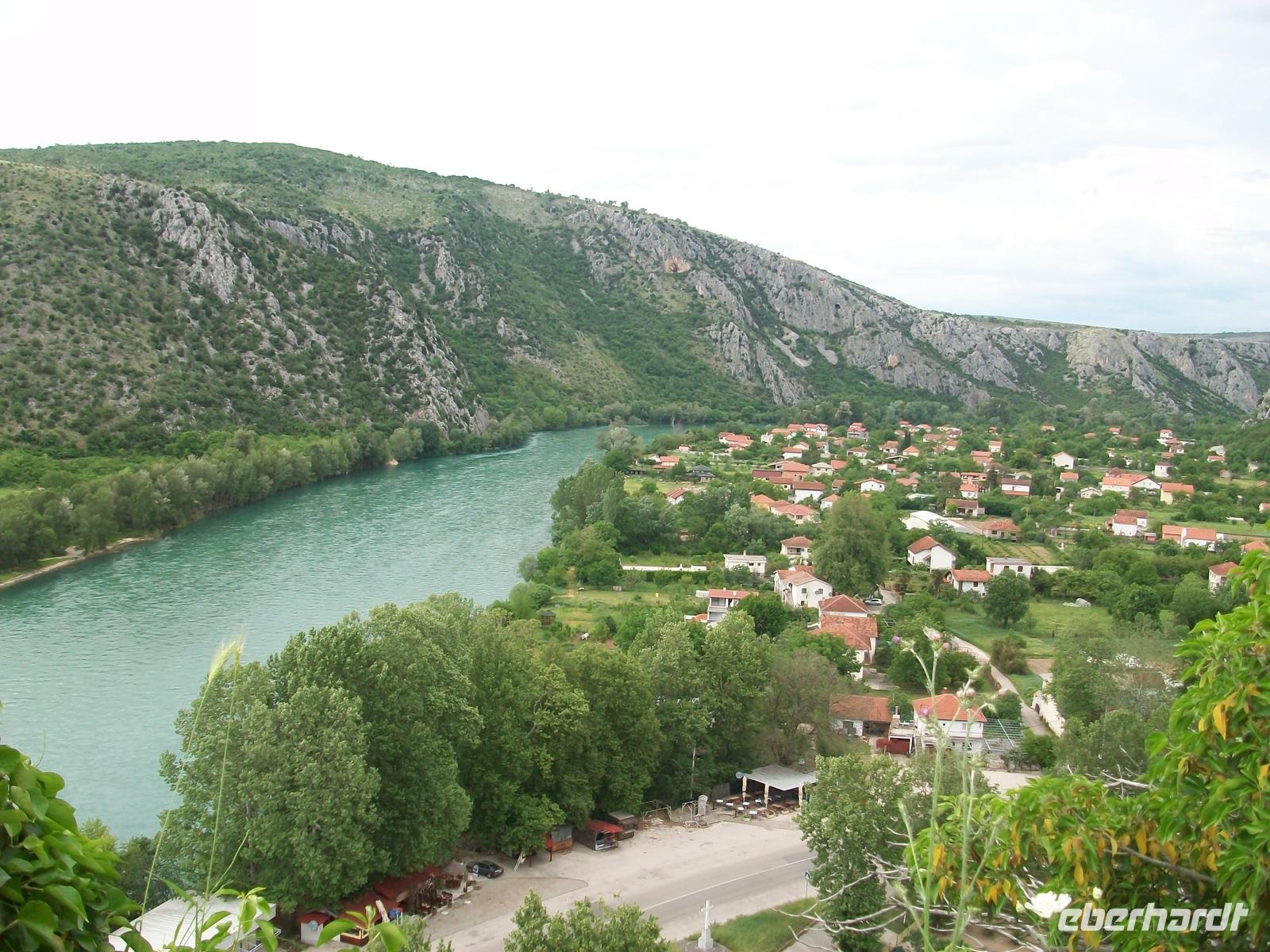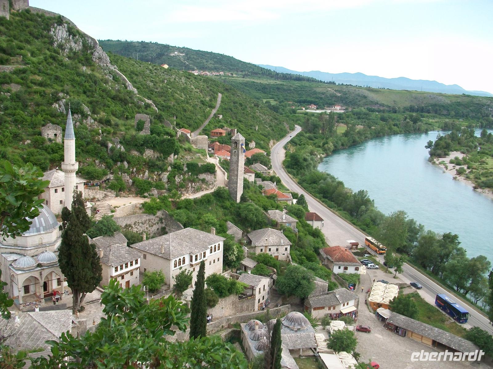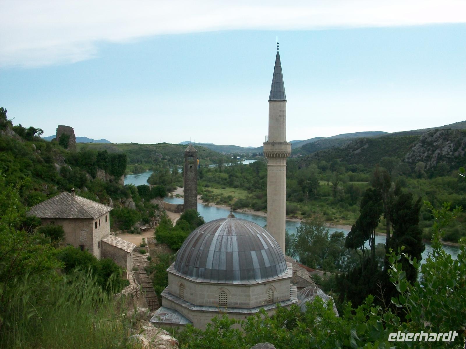 Leider behindern einige Ampeln unser zügiges Vorankommen, gegen halb fünf langen wir an der bosnischen Grenze an, hier gehen die Formalitäten aber recht schnell, nach zwanzig Minuten tauchen wir nun in einen völlig anderen Kulturkreis ein. Hier herrschten über Jahrhunderte die Osmanen und hinterließen uns die Zeugnisse ihrer Kultur. Ein Aufenthalt im Ort Pocitelj bringt uns diese Kultur näher, ein Besuch der Moschee und der Aufstieg zur Festung mit dem grandiosen Blick auf das Tal der Neretva wird dann bei diesem schönem Wetter zum großen Erlebnis.