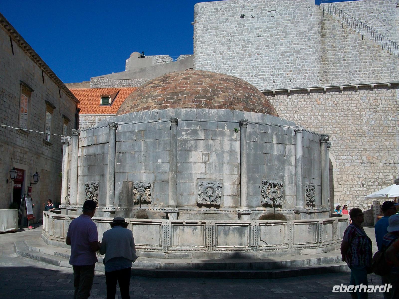 Durch das Piletor hindurch, von oben begrüßt uns der Schutzheilige Blasius, gelangen wir zur Stradun, es ist die Hauptfußgängerzone. Hier, am großen Onofriobrunnen, haben sich einige Gruppen versammelt und es herrscht schon ein munteres Treiben.