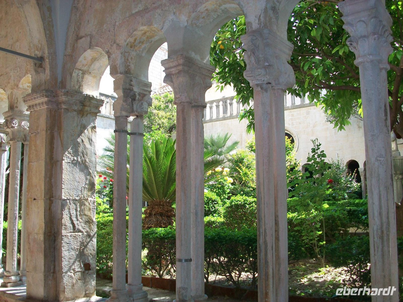 Wir schauen aber zuerst einmal in das Franziskanerkloster hinein. Im wunderschönen romanischen Kreuzgang und dem sonnendurchfluteten Innenhof mit seinen Zitrusbäumen hören wir die Geschichte dieses Hauses. Dann werfen wir auch noch einen Blick in die Alte Apotheke hinein und sind dann bald wieder im Getümmel der Stadt unterwegs. An der Blasiuskirche ist heute Konzert, eine Frauengesangsgruppe unterhält die Gäste von Dubrovnik mit Folklore, wir setzen unseren Rundgang am Rektorenpalast und an der Kathedrale entlang fort, bald erreichen wir den Alten Hafen. Von hier ist auch gut der Berg Srd zu sehen, eben fahren auch die zwei Gondeln der Bergbahn.