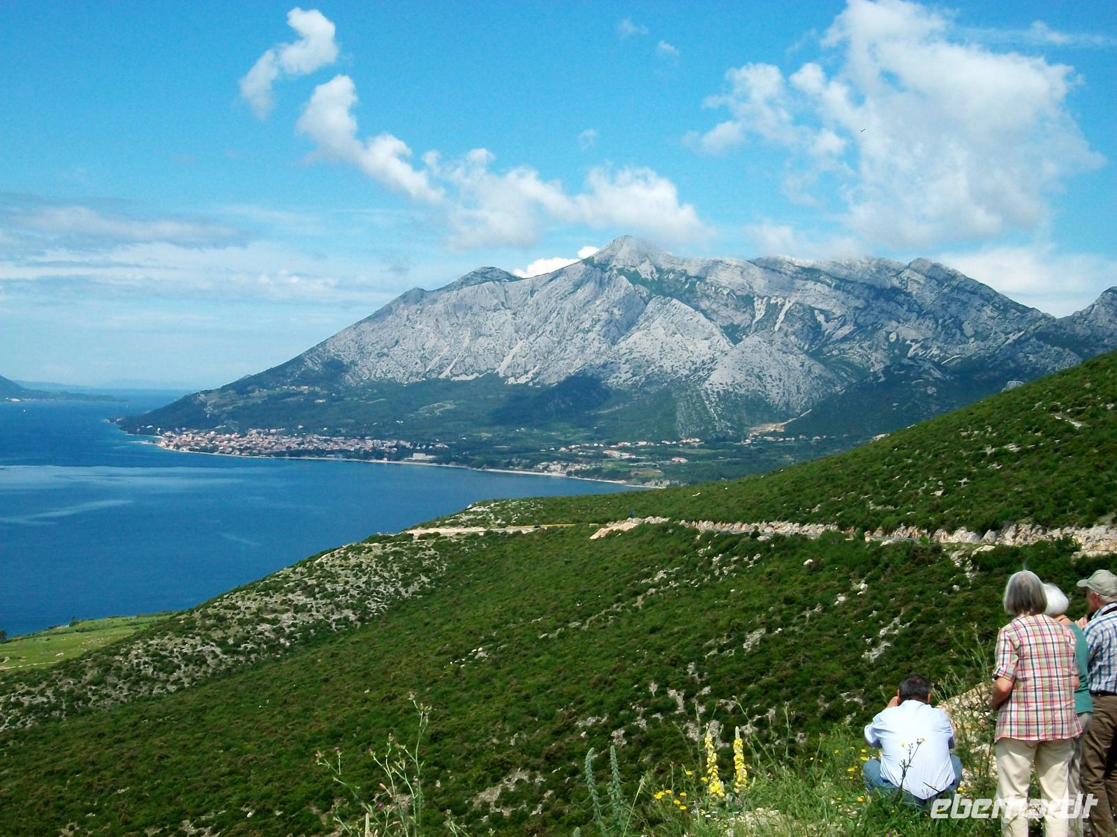 Unsere Fahrt führt uns nun direkt an der Küste entlang. Hinter dem schmalen Küstenstreifen steigen die Berge steil an, rechts ist die glitzernde Wasserfläche der Adria zu sehen und im Hintergrund die grünbewachsenen Inseln. Heute macht Petrus wieder alles gut; ein herrlicher Frühlingsnachmittag begleitet unsere Fahrt, überall an den Hängen blüht eine farbenfrohe Vegetation und erfreut unser Auge. Hoch oben über einer Bucht legen wir einen Fotostopp ein und bewundern die Süßwasserquellen die unter der Meeresoberfläche hervorsprudeln.
