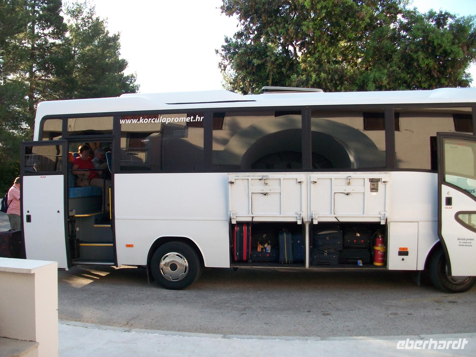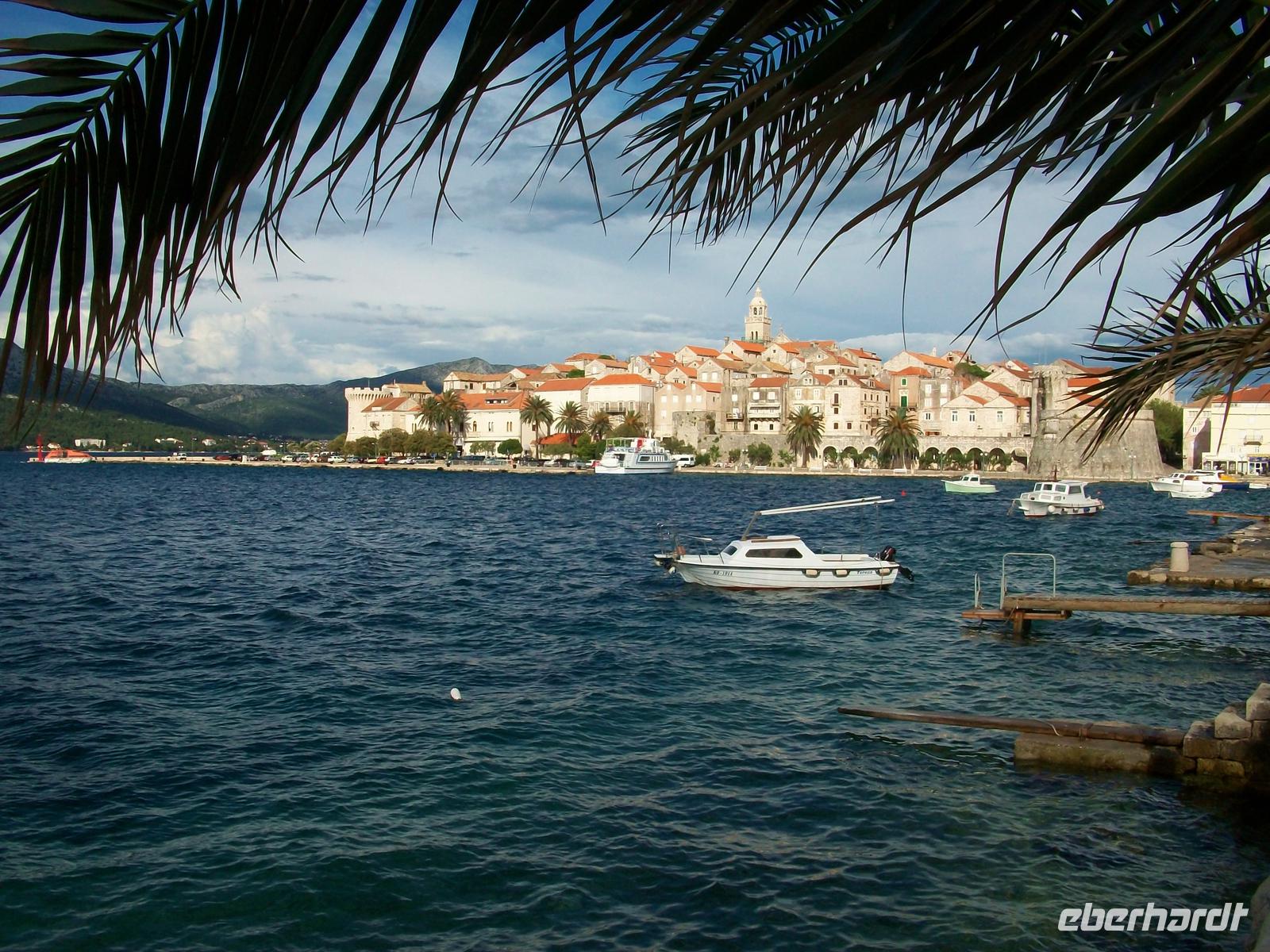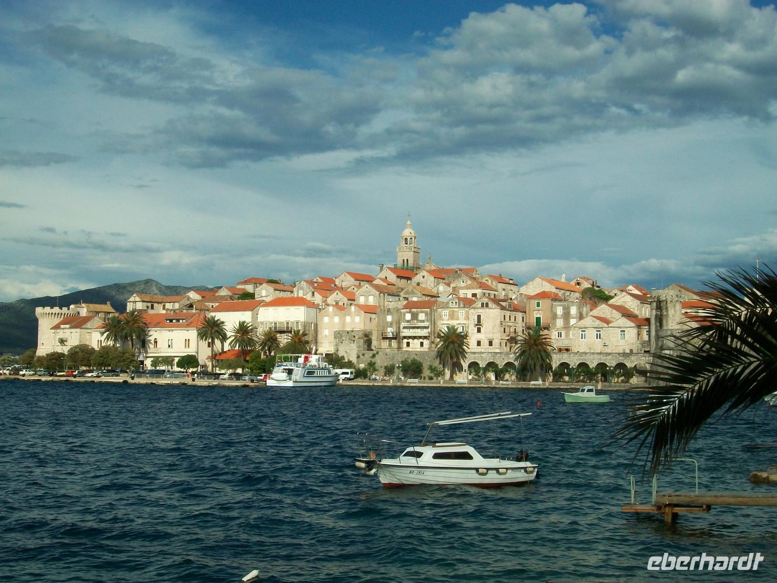 Und tatsächlich, bald treffen Kleinbusse ein, wir verladen die Koffer und die Gäste gelangen erst einmal zur Schiffsanlegestelle. Hier steht nun schon ein kleines Boot bereit, unsere Koffer werden auf das Dach verladen, manch ein Blick geht zu den Taschen, werden sie nicht ins Wasser fallen? Werden sie nicht! Leicht schaukelnd geht es nun hinüber nach Korcula, hier werden wir schon von Lujo erwartet, unserem Stadtführer.