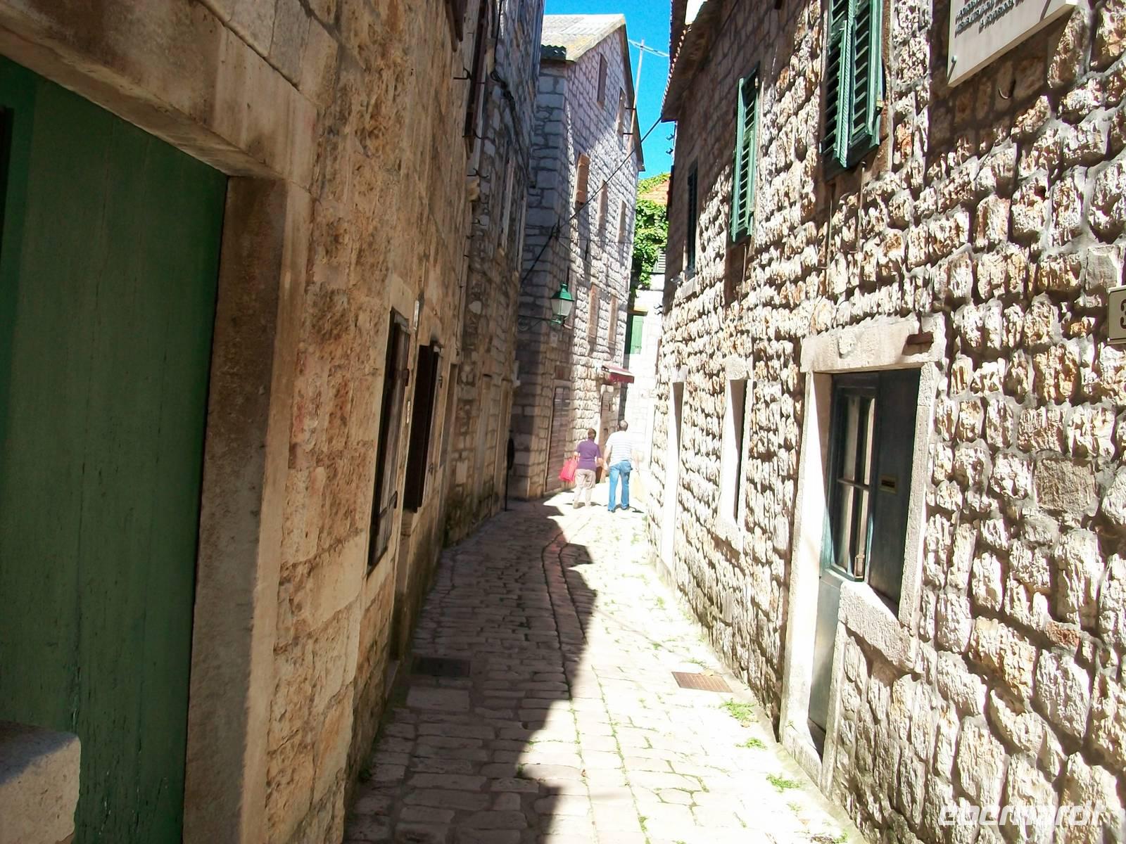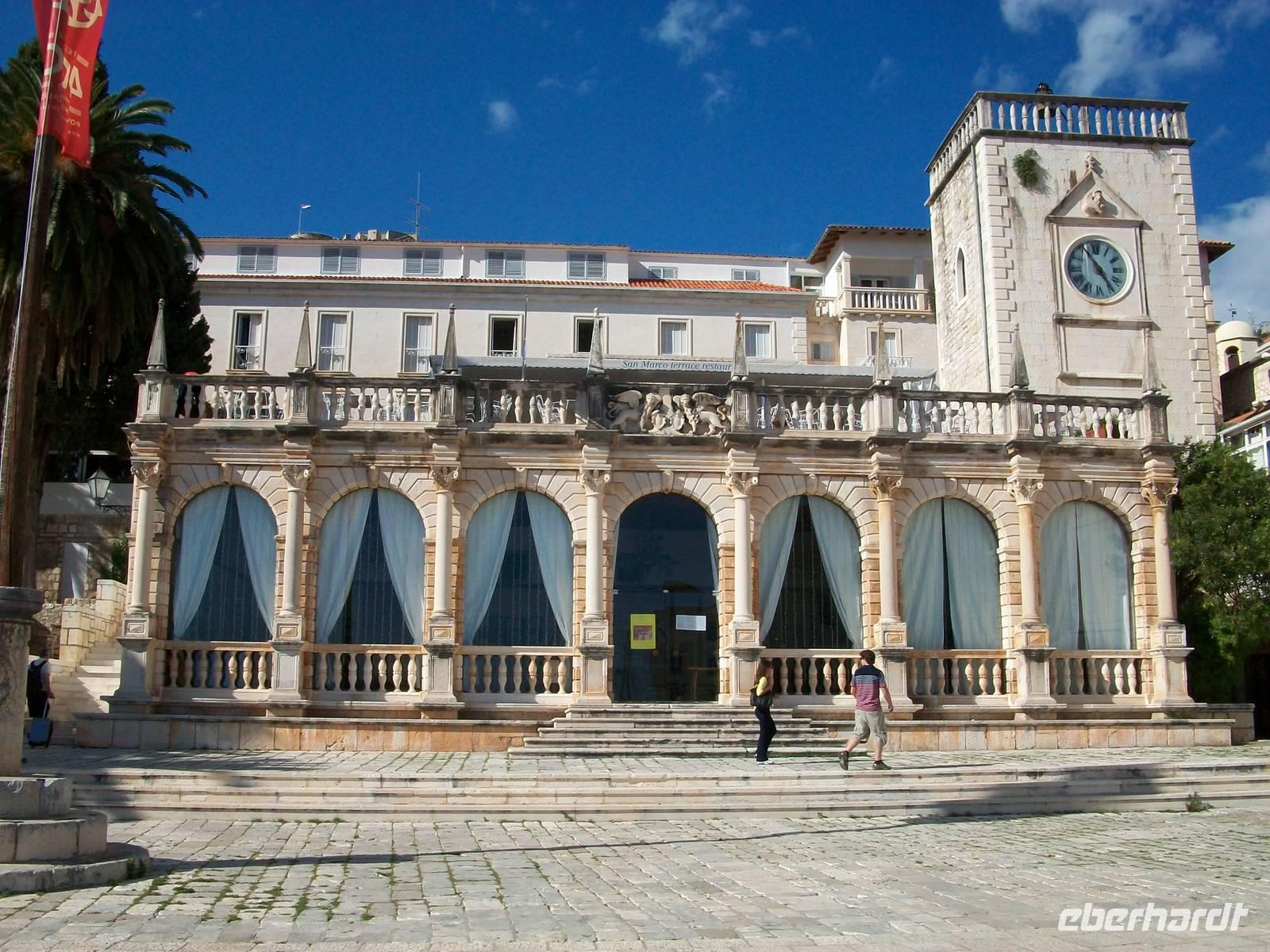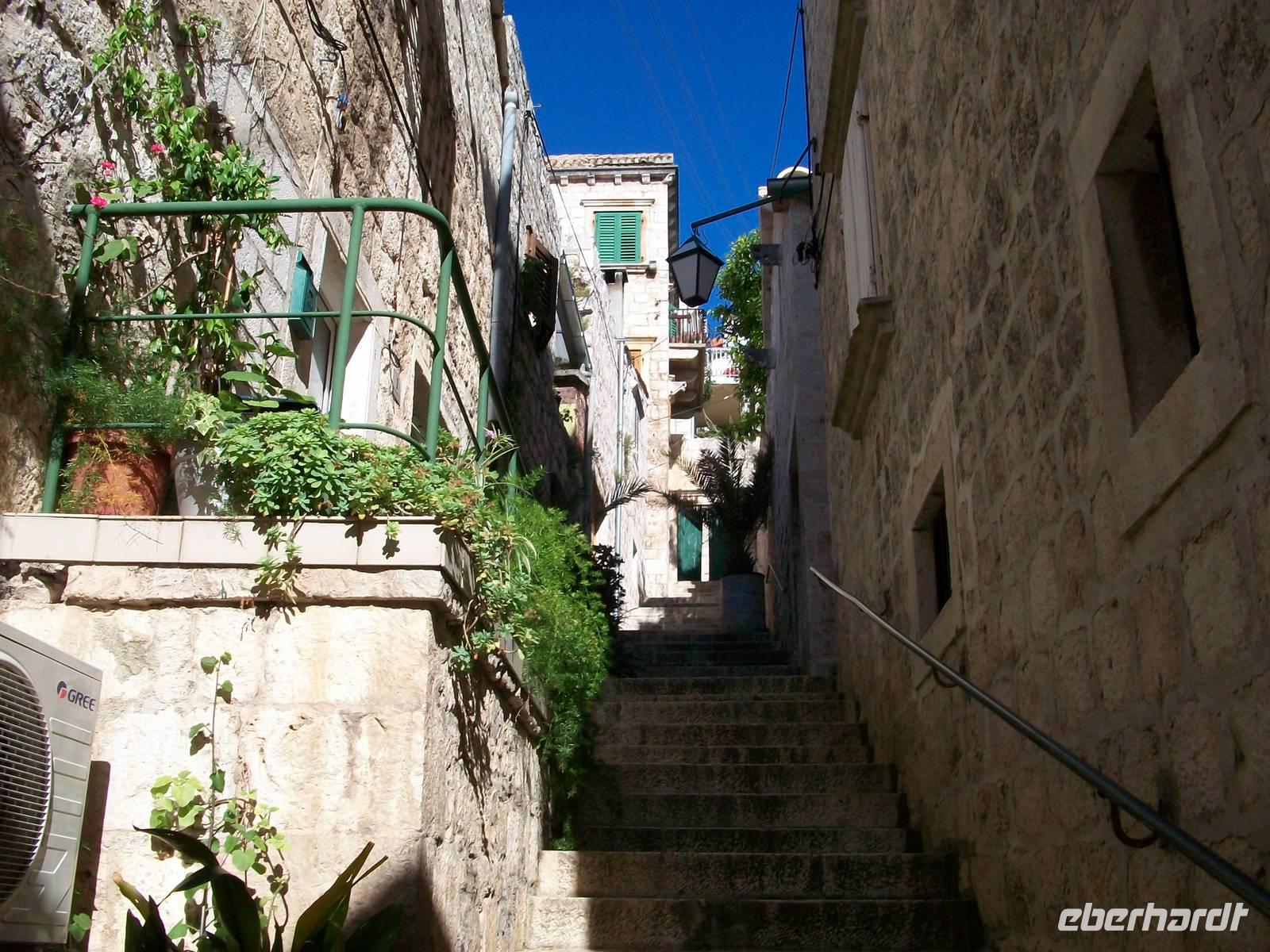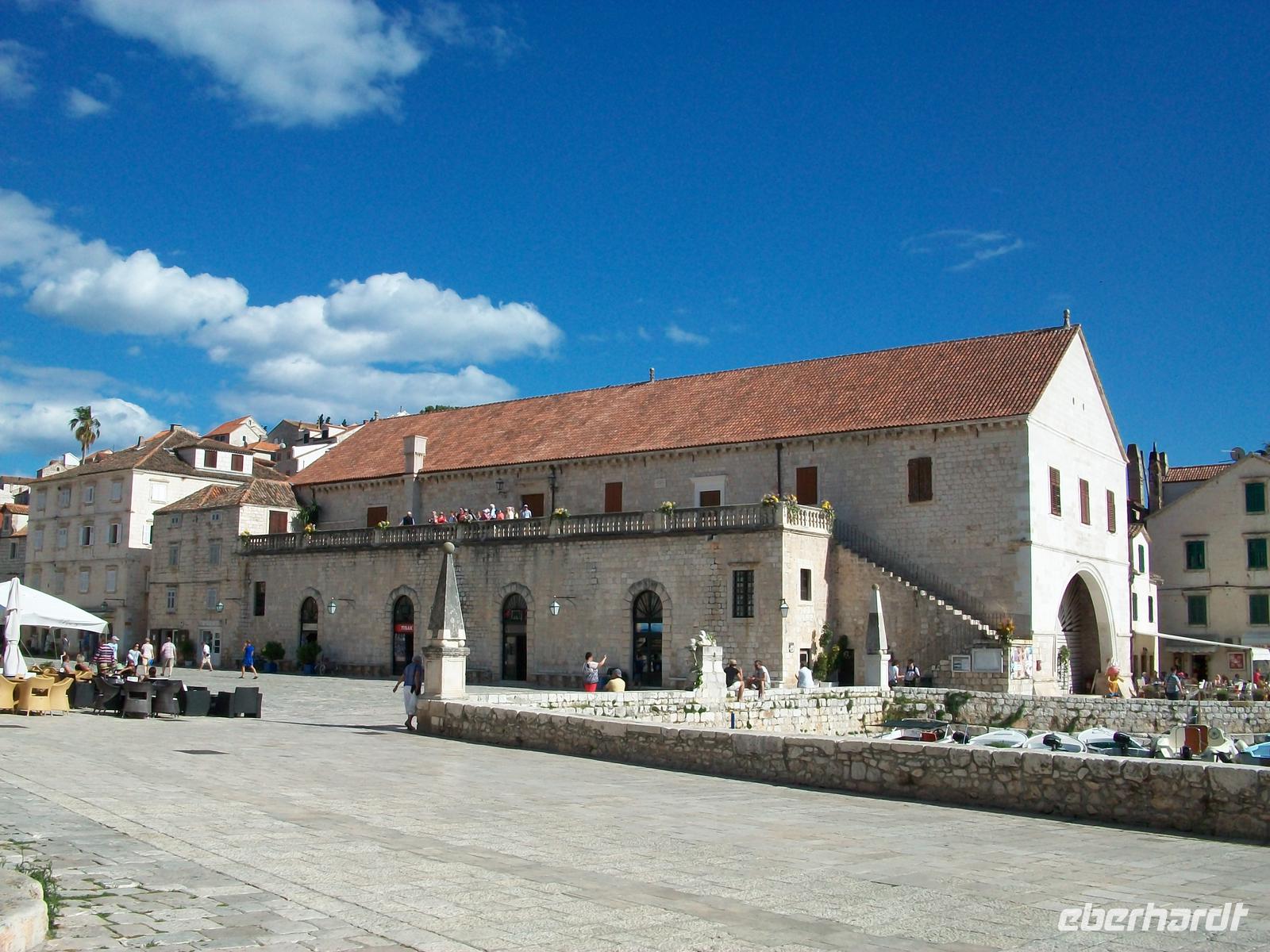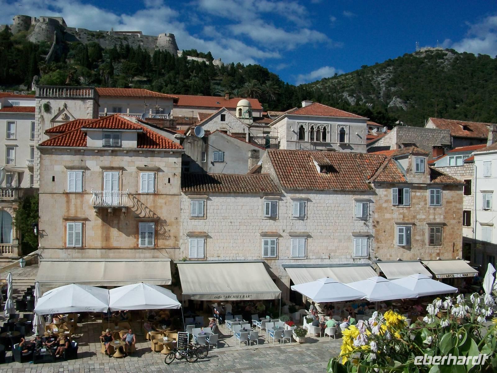Die Sonne verwöhnt uns dann später bei der Überfahrt; mit dem kleinen Bus geht es nun die holprige Inselstraße entlang. Hier scheint die Zeit stehen geblieben zu sein. Nur hie und da durchqueren wir einsame Dörfer, im Feld von Starigrad wird es dann doch etwas munterer. Bald fahren wir durch den Tunnel unter dem Inselgebirge hindurch und gegen 15.50 Uhr erreichen wir den Ort Hvar. Jasna, unsere Stadtführerin erwartet uns schon, und während ich mit dem kroatischen Kollegen den Gepäcktransport organisiere bummelt unsere interessierte Reisegruppe durch die schmalen Gassen von Hvar. In dieser Zeit erfahre ich auch dass nun unser Reisebus auch wieder flott ist, Günther unser Fahrer, wird mit der nächsten Fähre dann auch hier ankommen. Die Stadt Hvar ist recht klein, vom Arsenal gibt es einen schönen Blick auf den großen Platz und die Kathedrale, und der Blick vom Hafen über das glitzernde Wasser kann romantischer nicht sein.