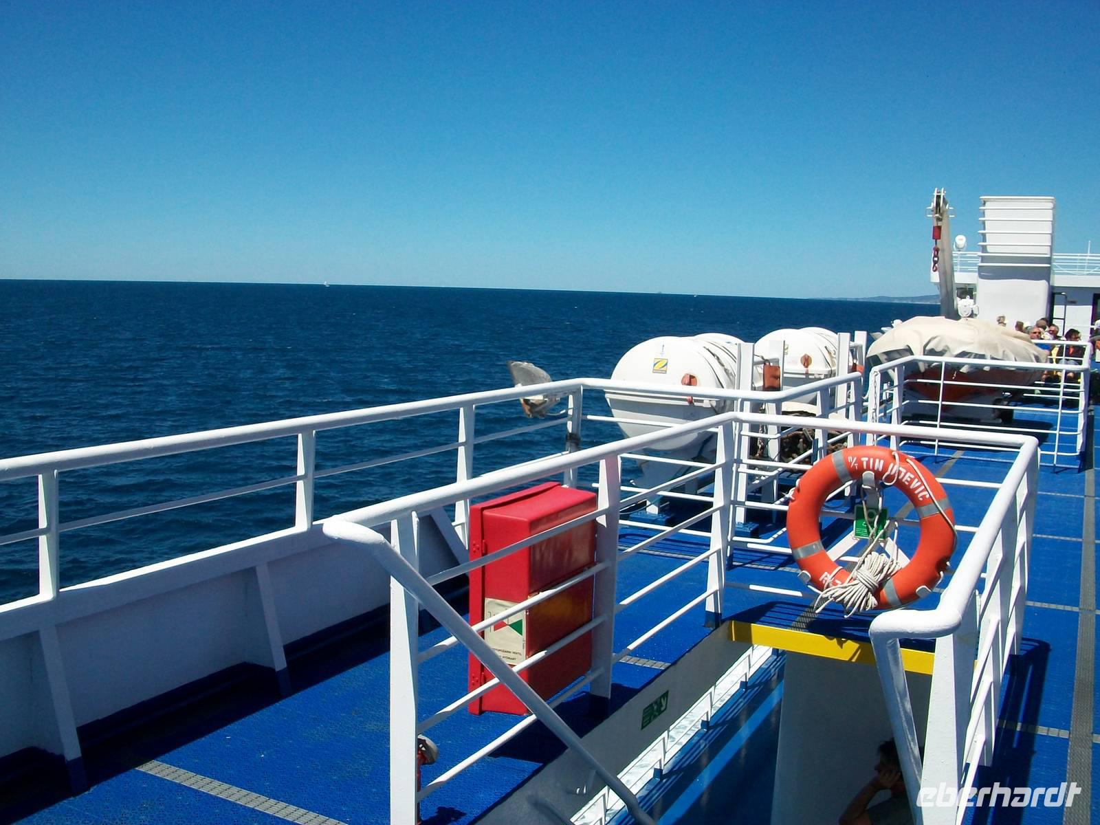 13.5.2013. Unser Bus konnte leider noch nicht repariert werden und steht am Festland. Aber die Partneragentur hat uns einen kleinen Ersatzbus organisiert und mit dem sind wir nun auf dem Weg zur Fähre. Ein weiterer schöner und sonniger Tag kündigt sich an; auf dem Sonnendeck der Fähre lassen wir uns die frische Morgenbrise um die Ohren blasen.