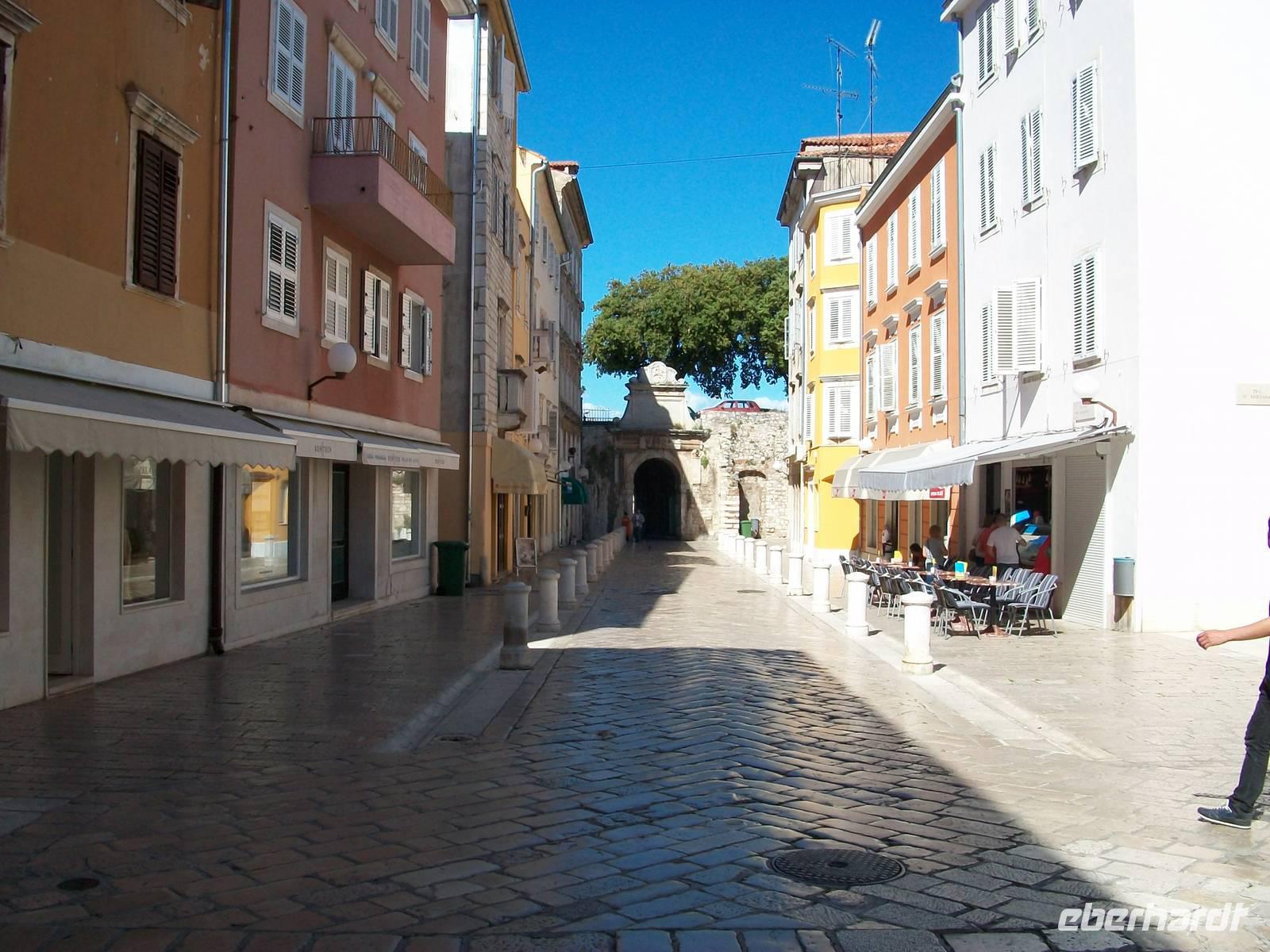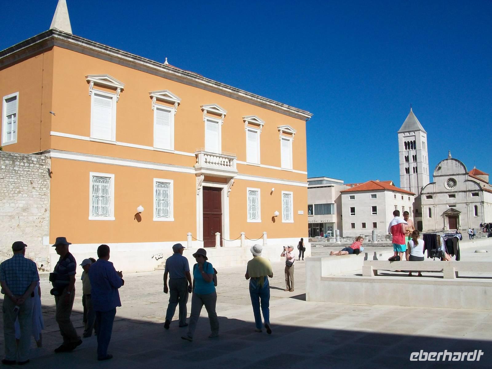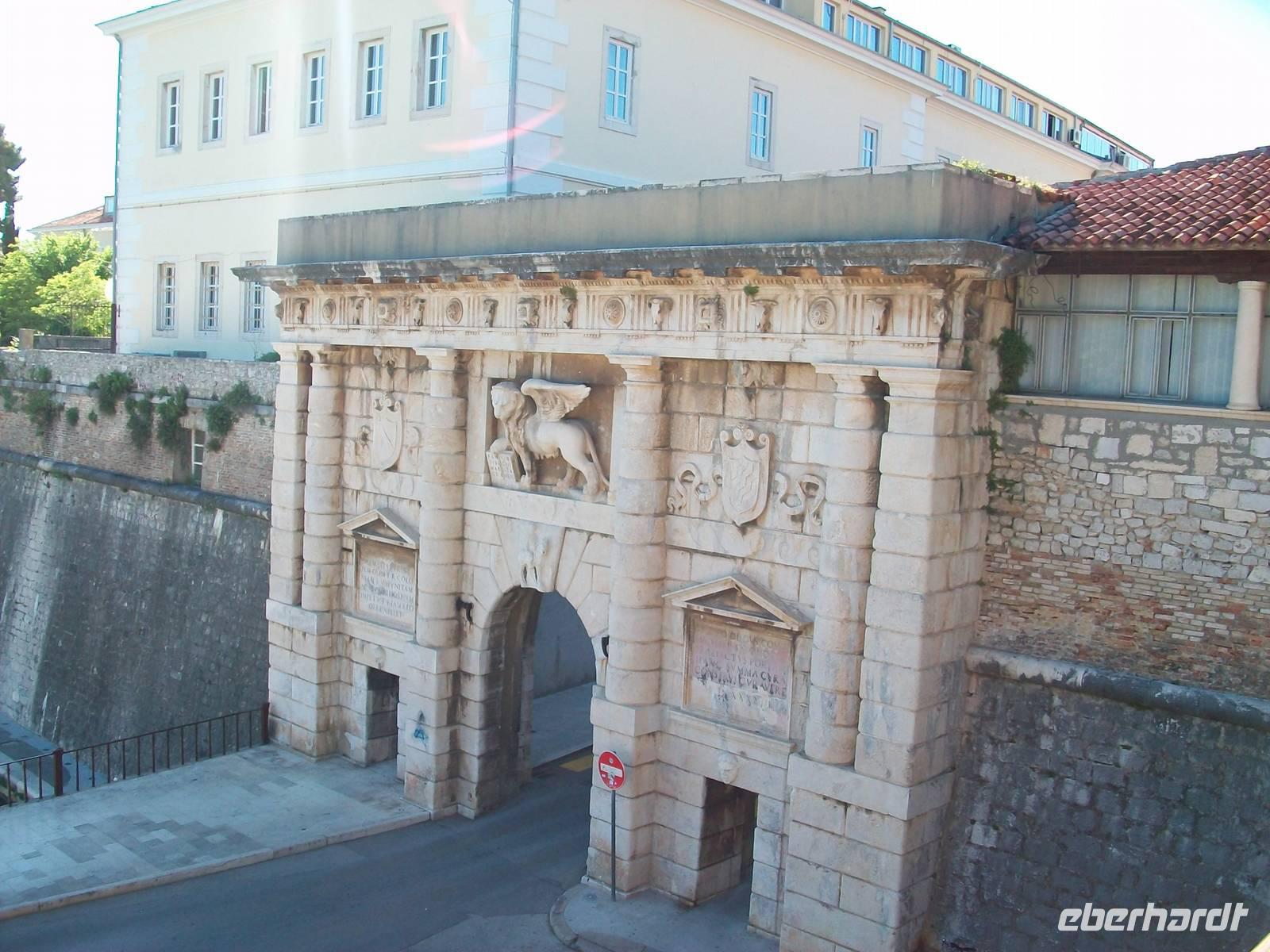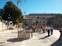 Es ist ein schöner warmer Nachmittag als wir in Zadar ankommen. Hier erwartet uns schon Edi, unser bewährter Stadtführer. Die Geschichte dieses Ortes ist nicht ganz einfach, das Stadtbild nicht mehr durchweg historisch, aber dennoch sehr reizvoll. Das ehemalige Forum Romanum zeigt in Fragmenten immer noch die Macht Roms, die Rotunde der Donatskirche die erste Zeit des Christentums, die Kathedrale Romanik und auch Gotik und am Hauptplatz sind viele Stilrichtungen zu bemerken. Über den Platz der Fünf Brunnen langen wir oberhalb des Landtores an, hier zeugt der Markuslöwe von der einstigen Macht der Venezianer.