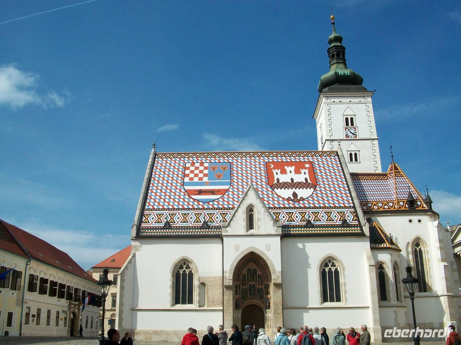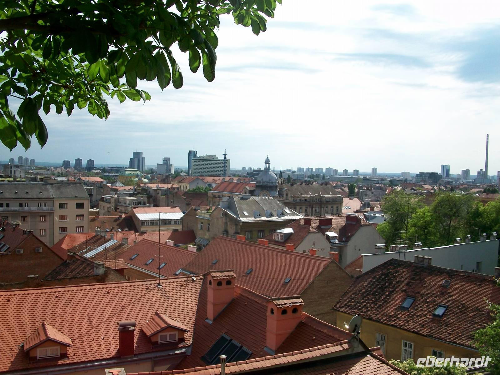 Weiter geht es zu Fuß in die Oberstadt. Nun hat es die Sonne doch tatsächlich geschafft durch die Wolkenlücke zu dringen! Durch das Steintor mit seiner kleinen Kapelle gelangen wir hinauf zum Markusplatz, bestaunen hier die bunten Dachziegel der Markuskirche, erfahren etwas über Parlament und Regierungssitz und stehen bald am Aussichtspunkt. Hier oben kann der Blick weit über die Dächer der Häuser ins schöne Hinterland schweifen.