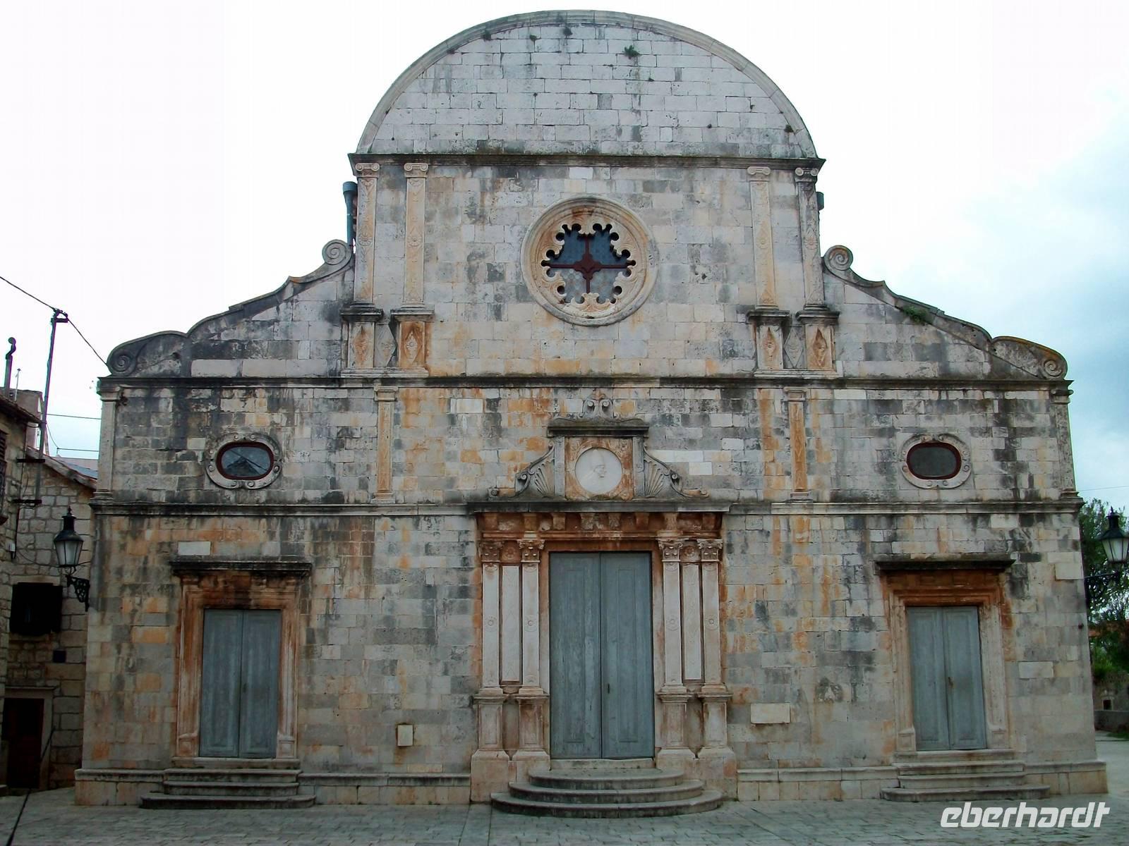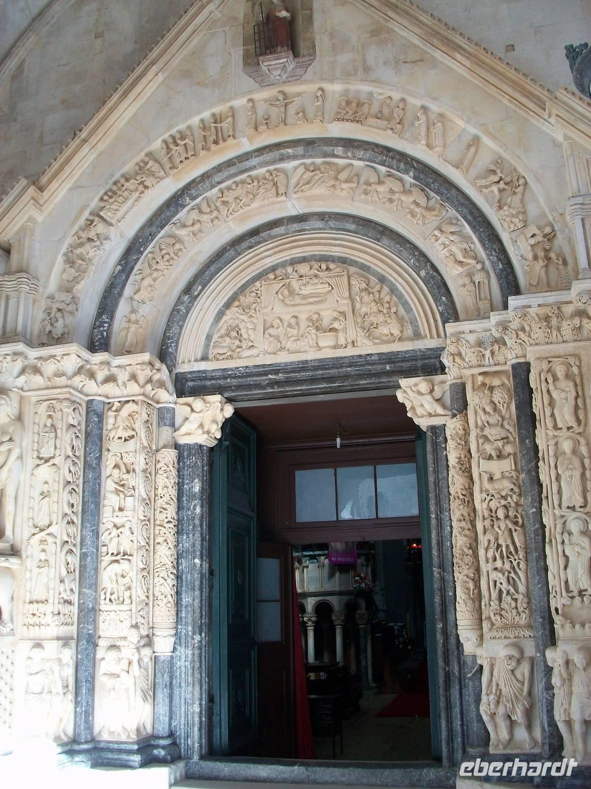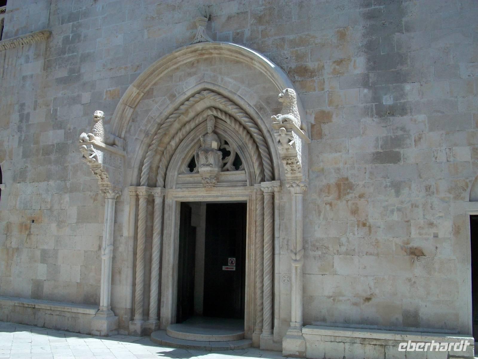 Aus den Gassen auftauchend steht der Besucher plötzlich vor der Kathedrale; am Eingangsportal hat der große Meister Radovan den Skulpturenschmuck geschaffen, mit seiner filigranen figürlichen Darstellung ein atemberaubendes Kunstwerk im spröden Kalkstein.