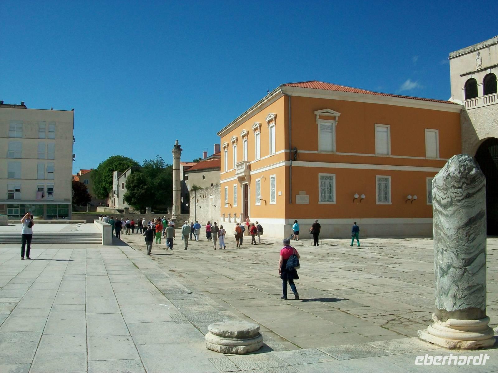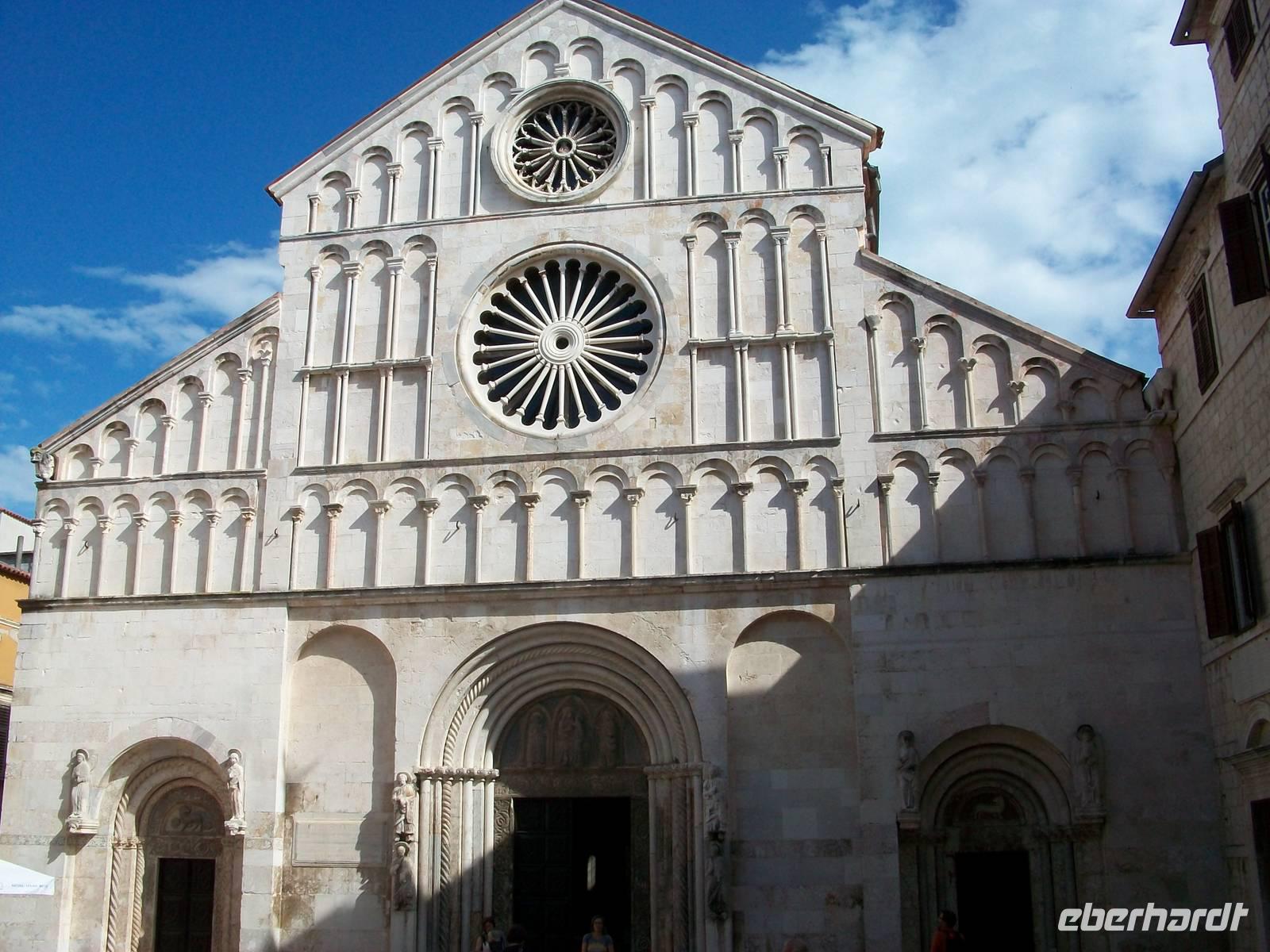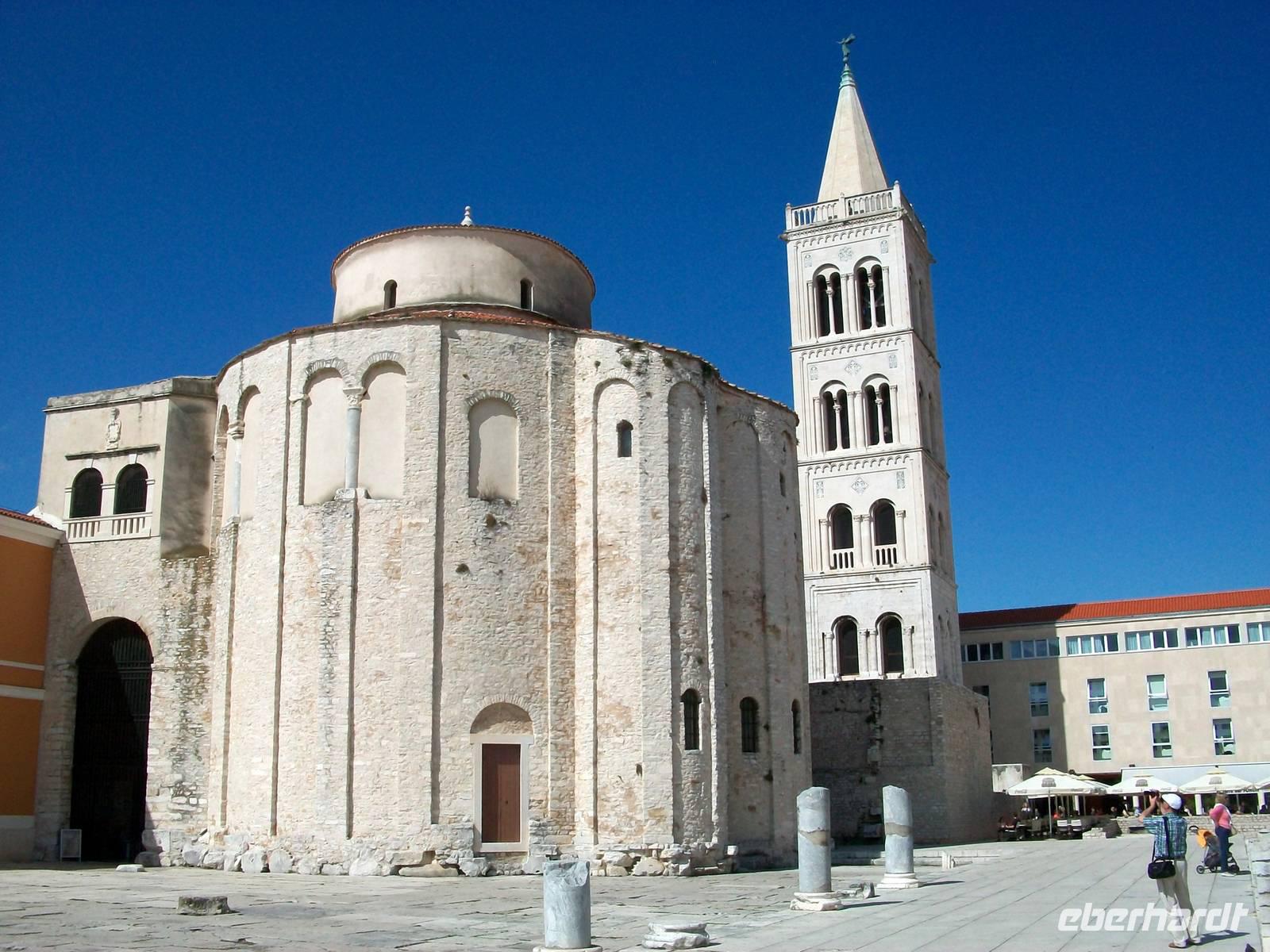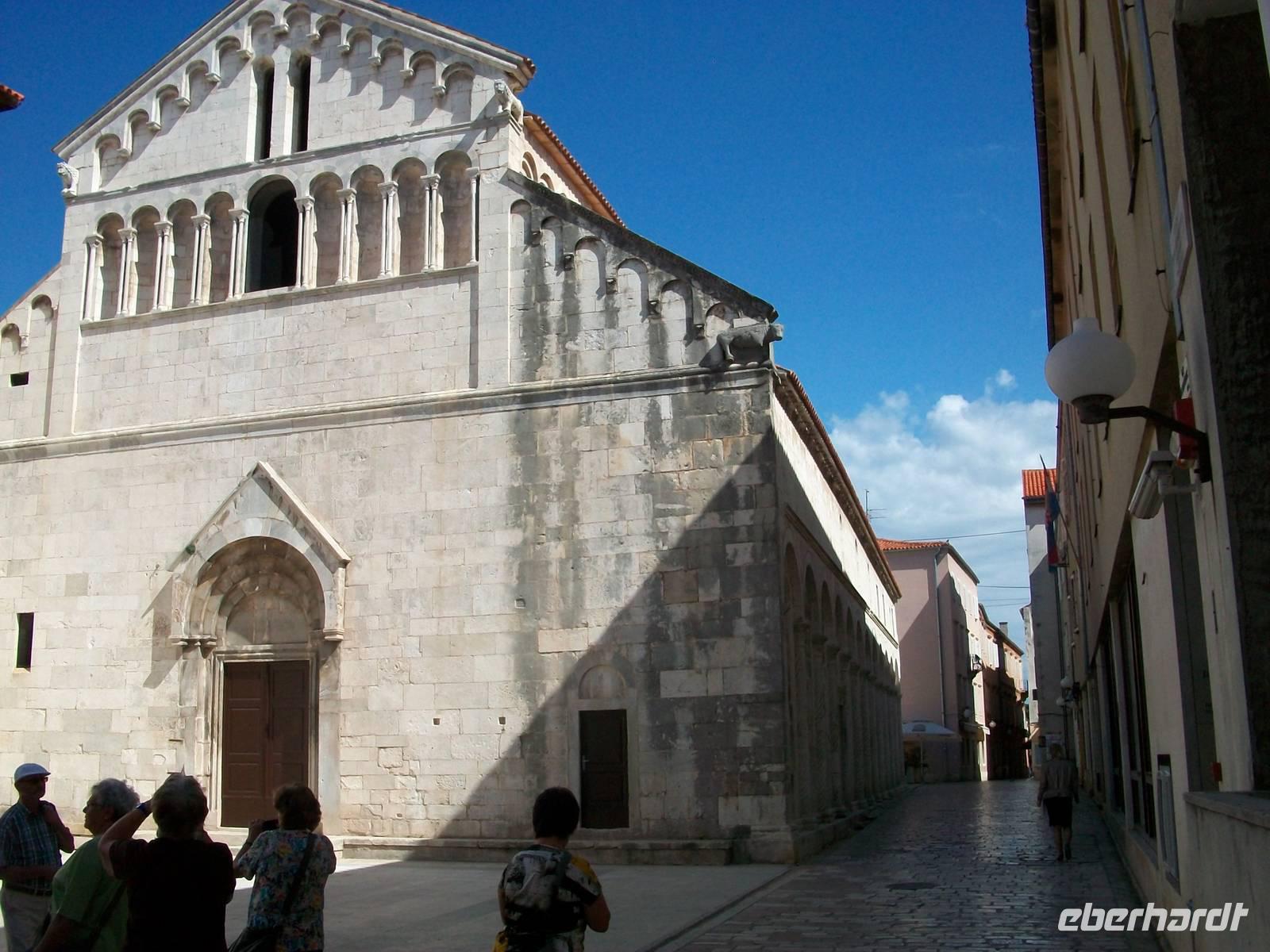 Edi, unser bewährter Führer und Kunsthistoriker steht schon bereit und nimmt uns nun mit auf einen Rundgang durch gleich mehrere Jahrtausende Siedlungsgeschichte. Lange vor Christi Geburt siedelten hier die Liburer, ein illyrischer Stamm. Von ihnen ist nichts mehr erhalten geblieben, jedoch von den Römern die dem Ort ein wichtiges Gepräge gaben. Wir gelangen zum ehemaligen Forum Romanum und von hier haben wir einen schönen Blick auf die Bauten der weiteren Epochen der Stadt. Schön anzuschauen ist die vorromanische Rotunde der Donatskirche, ihr weißer Kalkstein leuchtet in der Nachmittagssonne. Dahinter liegt die romanische Kathedrale und als wir zu ihr gelangen sehen wir auch die gotischen Elemente einer späteren Zeit.