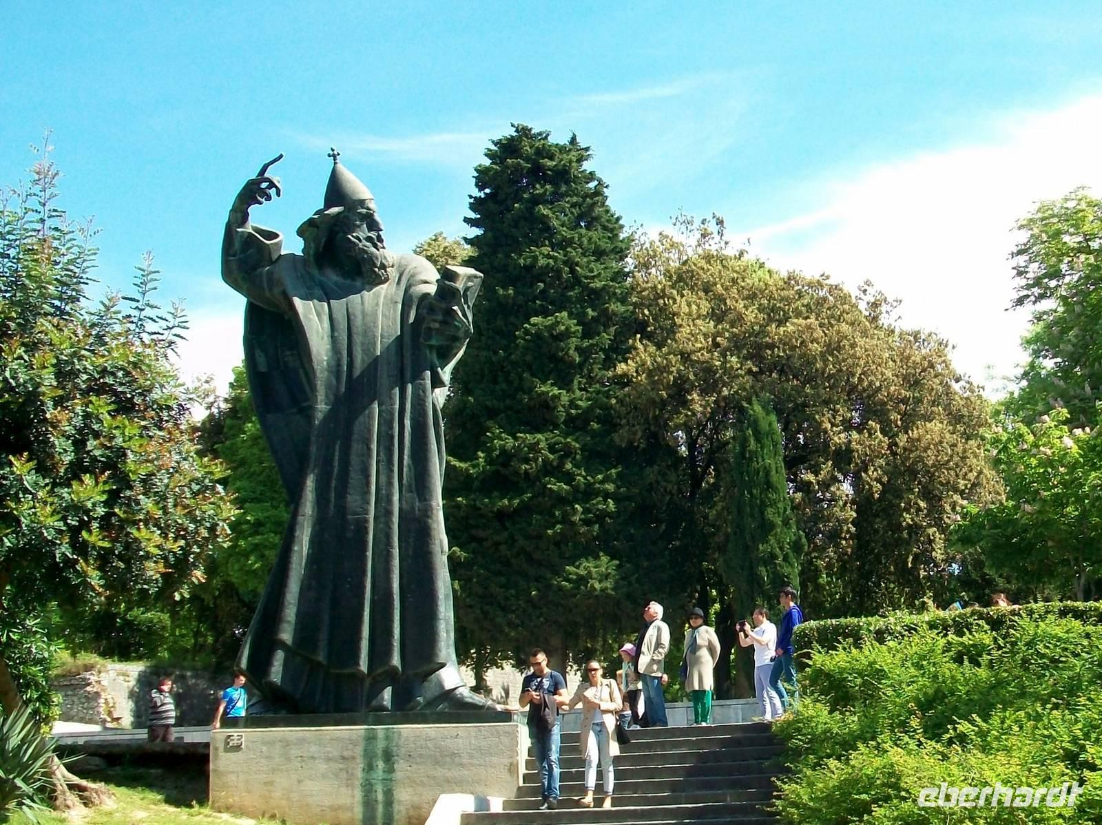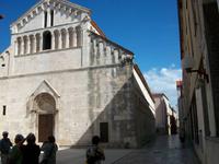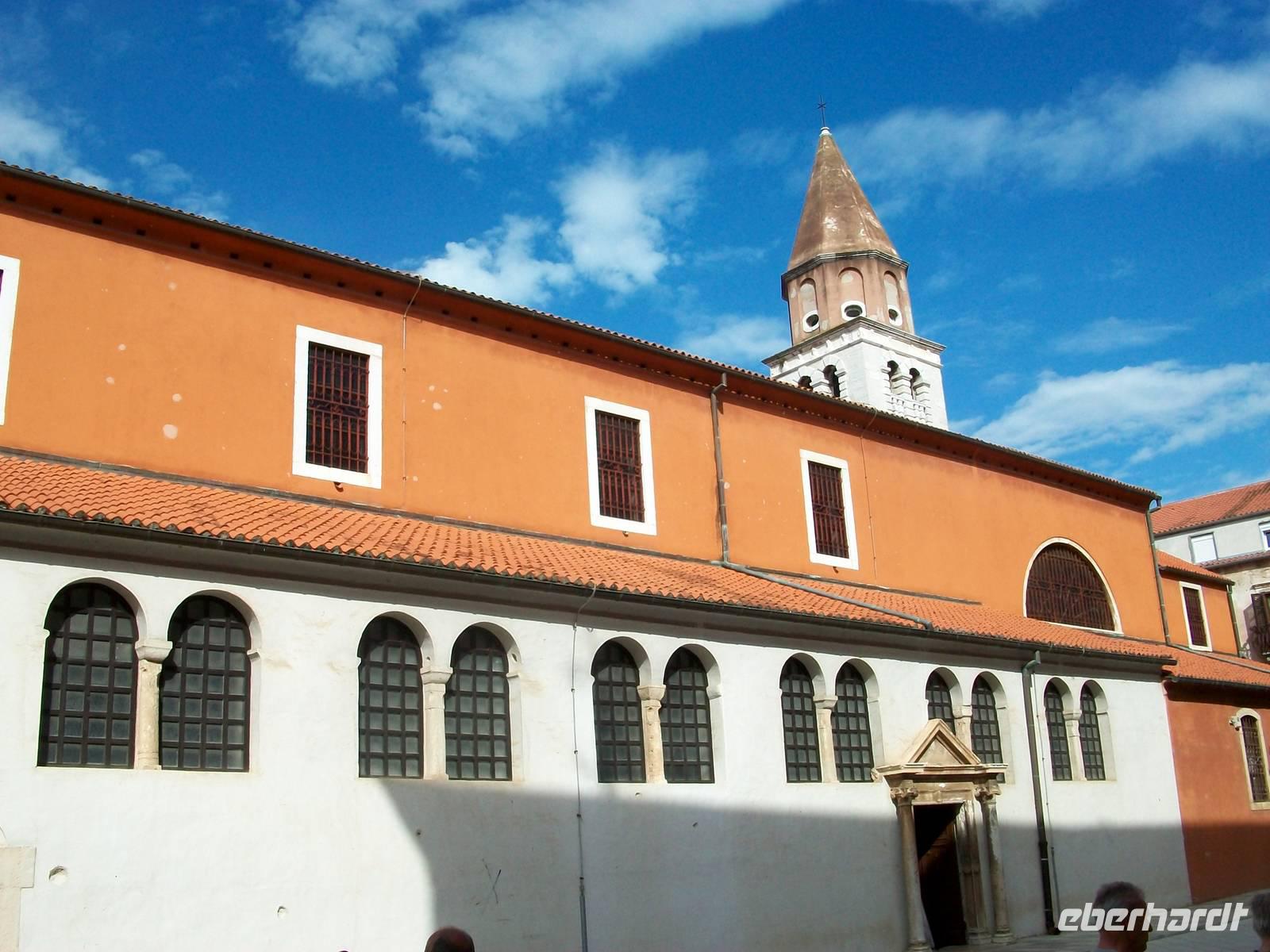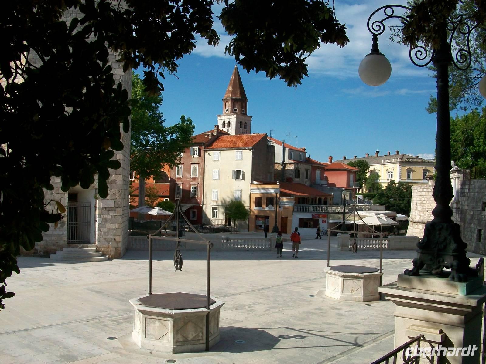 Edi, unser bewährter Führer und Kunsthistoriker steht schon bereit und nimmt uns nun mit auf einen Rundgang durch gleich mehrere Jahrtausende Siedlungsgeschichte. Lange vor Christi Geburt siedelten hier die Liburer, ein illyrischer Stamm. Von ihnen ist nichts mehr erhalten geblieben, jedoch von den Römern die dem Ort ein wichtiges Gepräge gaben. Wir gelangen zum ehemaligen Forum Romanum und von hier haben wir einen schönen Blick auf die Bauten der weiteren Epochen der Stadt. Schön anzuschauen ist die vorromanische Rotunde der Donatskirche, ihr weißer Kalkstein leuchtet in der Nachmittagssonne. Dahinter liegt die romanische Kathedrale und als wir zu ihr gelangen sehen wir auch die gotischen Elemente einer späteren Zeit.