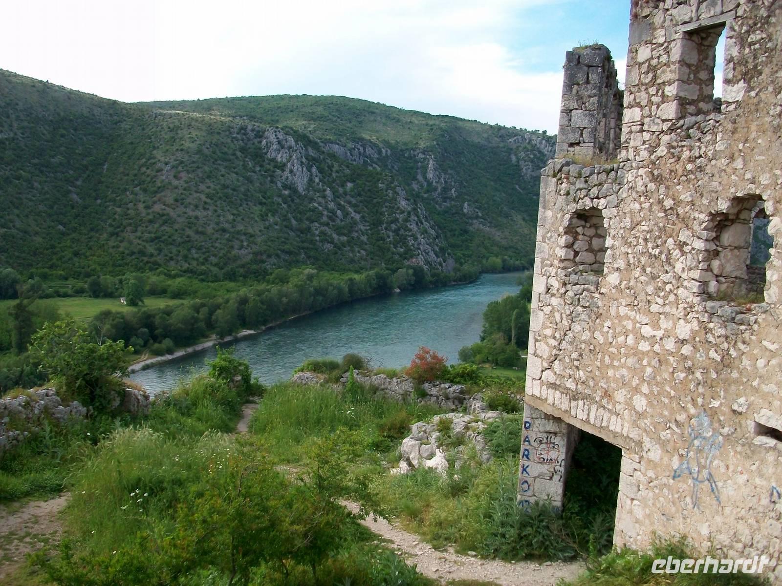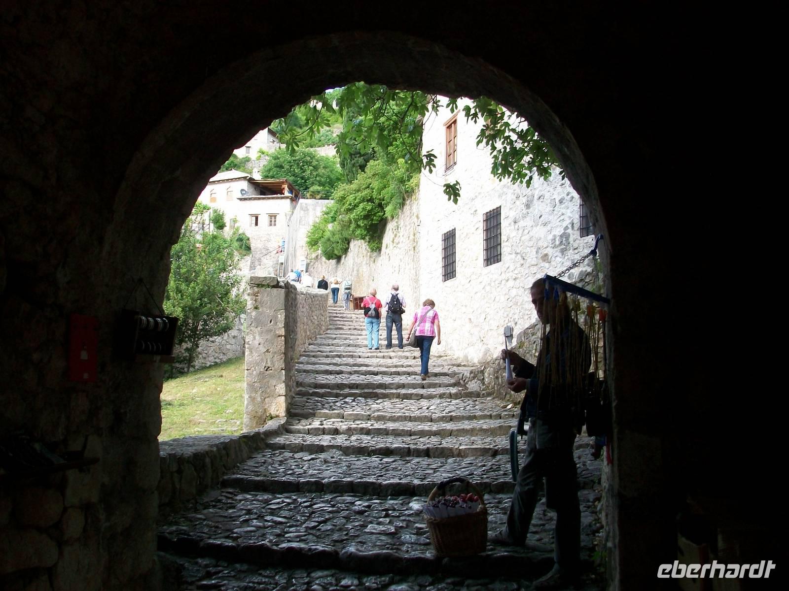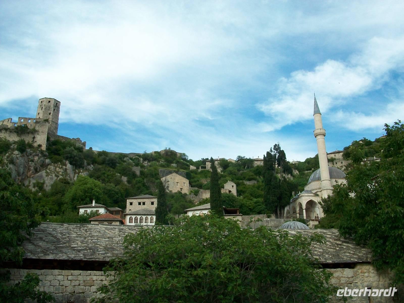 Ein Musterbeispiel türkischer Ortsgestaltung ist das Dorf Pocitelj, hier legen wir eine Rast ein um uns das etwas näher anzuschauen. Die Wege hinauf zur Moschee und der Festung sind etwas unwegsam, aber von oben werden wir mit einem phantastischen Panorama belohnt. Unter uns sind die Häuser, das ehemalige Bad, der Han und die Moschee zu sehen. Neben der Straße taucht die Neretva aus den Bergen auf um ihre grünen Fluten schlängelnd der Adria zuzusenden- ein Hochgenuss!