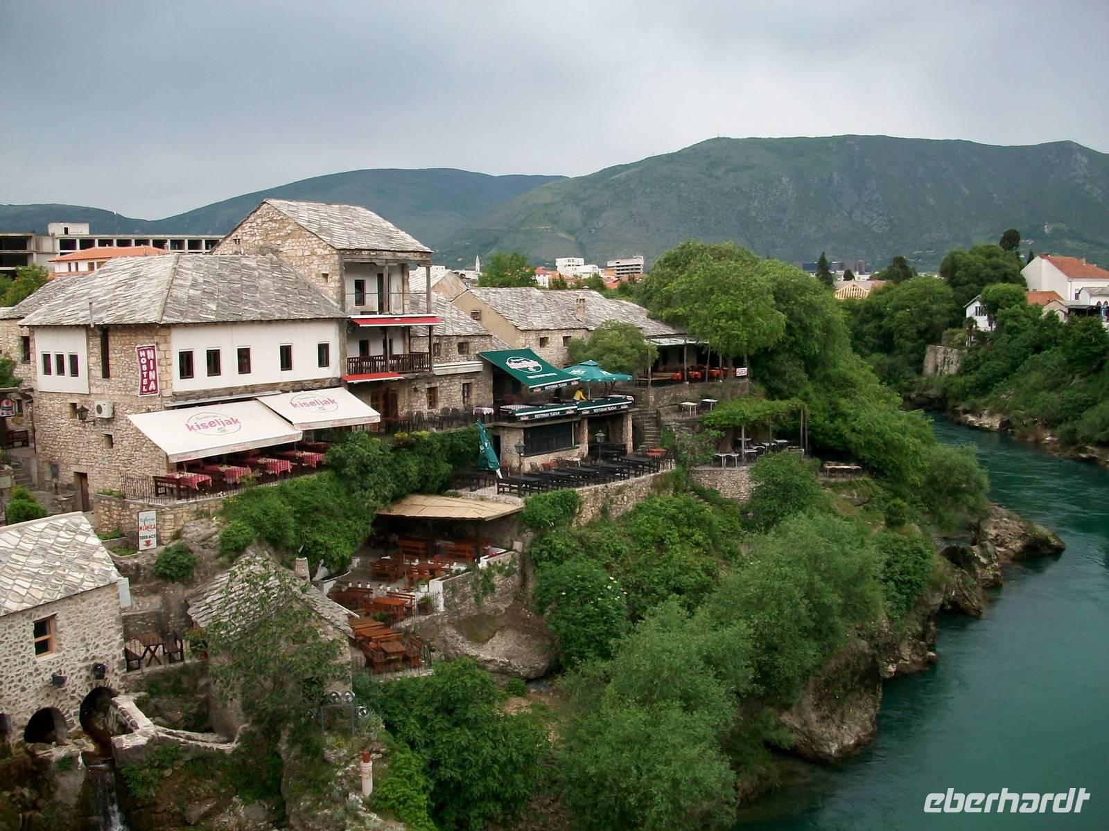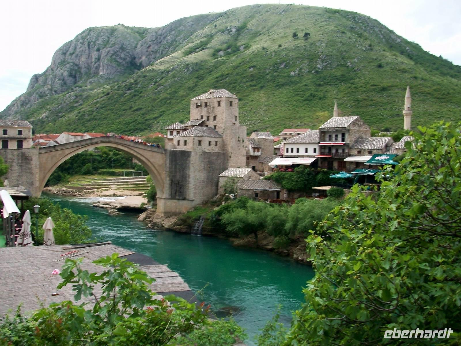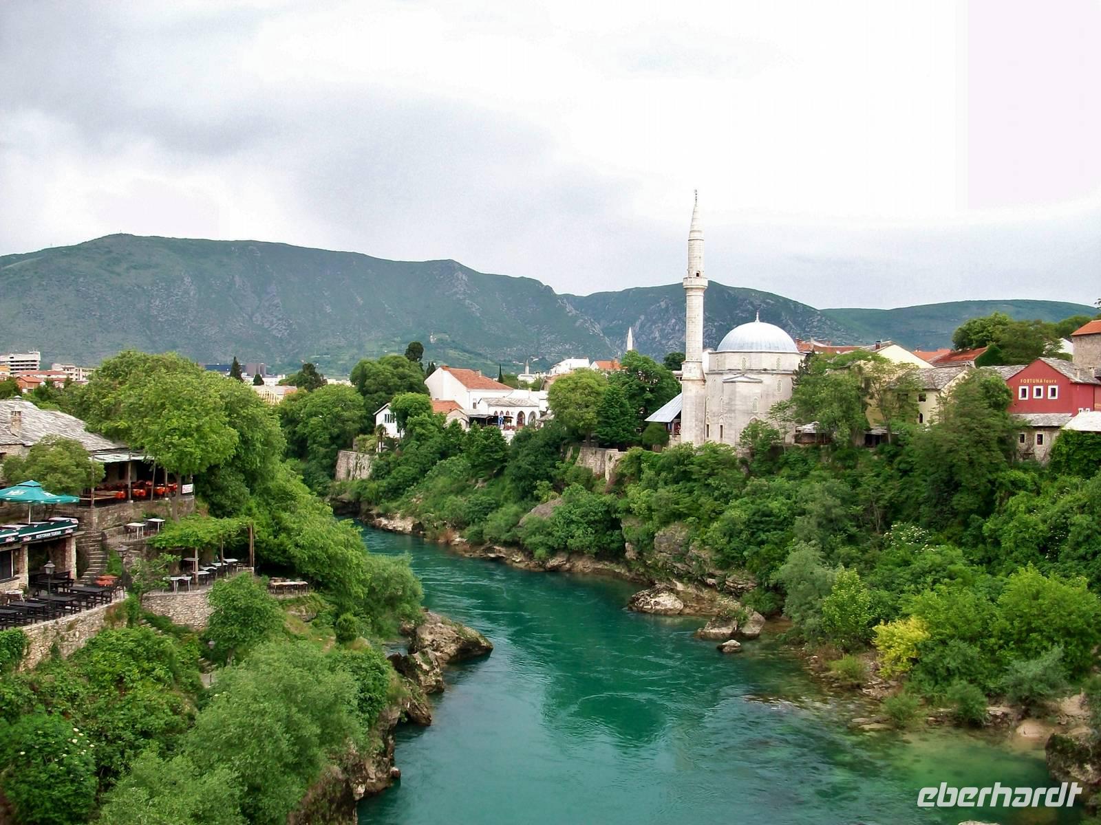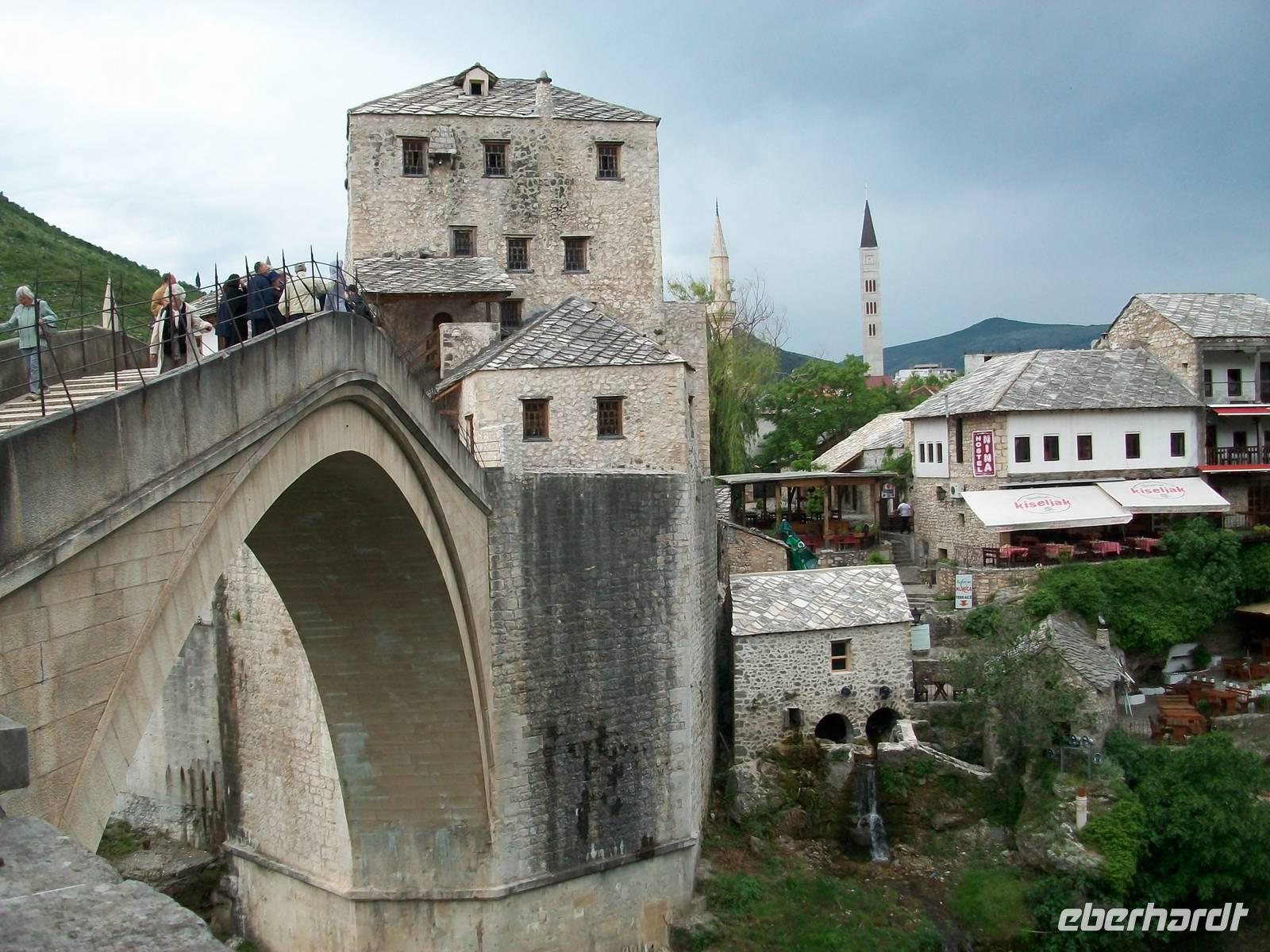 Nur wenige Minuten mit dem Bus, und dann sind wir zu Fuß unterwegs um wiederholt in die Architektur des Osmanischen Reiches einzutauchen. Jetzt am Morgen ist es noch ruhig in Mostar, so gelangen wir zuerst zum wichtigsten Wahrzeichen der Stadt der Stari Most, der Alten Brücke. Elegant überspannt dieses beeindruckende Bauwerk in einem Bogen die Neretva und nicht ganz ohne Mühe erreichen wir die andere Seite. Hier gelangen wir durch eine schmale Gasse zu einem schönen Aussichtspunkt mit Blick auf die Brücke, ein pittoreskes Motiv abgebend.