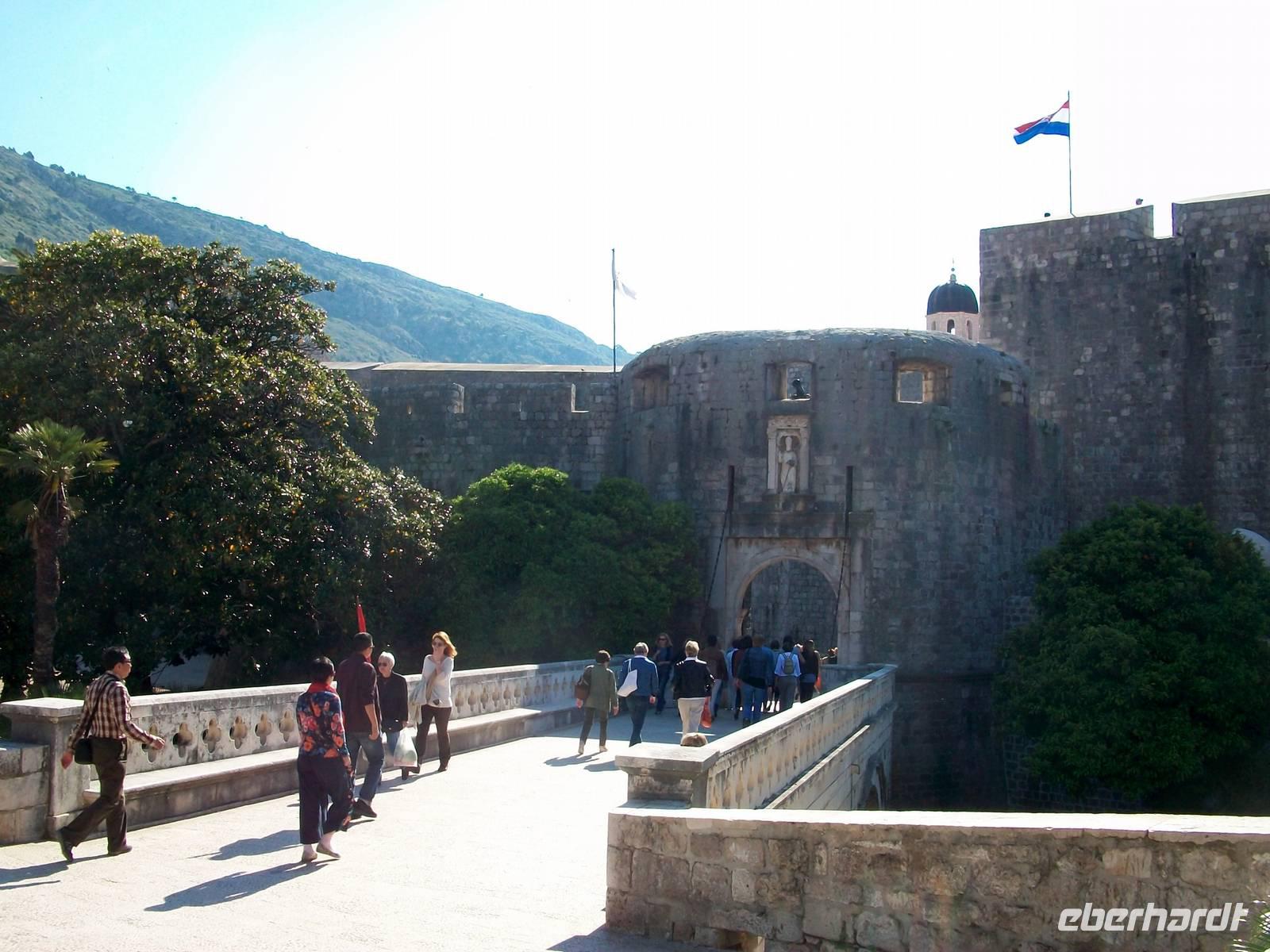 Der Weg zur Altstadt ist kurz und zu dieser frühen Stunde hält sich der Andrang noch in Grenzen. Über eine Brücke gelangen wir in die altehrwürdigen Mauern der alten Ragusa. Beim Eintreten werden wir vom Schutzpatron Blasius begrüßt und Antea gibt uns erste interessante Informationen über die Schutzfunktion der Befestigungen.