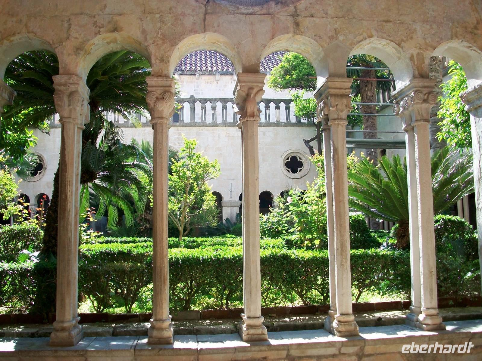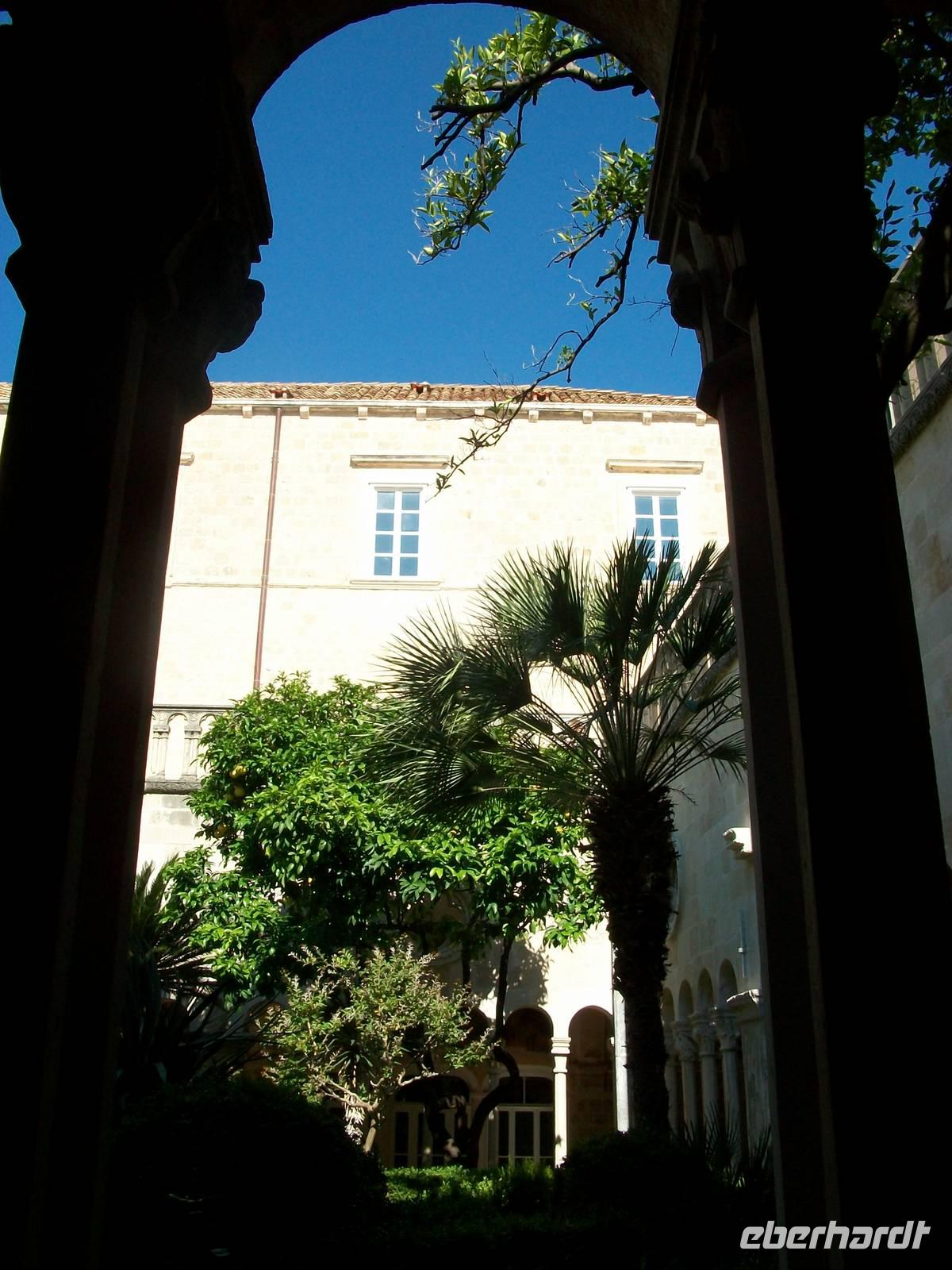 Dann gelangen wir zur sonnendurchfluteten Fußgängerzone, Stradun genannt. Gegenüber des großen Onofriobrunnens befindet sich der Eingang zum Franziskanerkloster. Ein schöner Ort ist der Kreuzgang aus romanischen Zeiten, schräg fällt das Sonnenlicht ein und taucht diesen magischen Ort in ein Wechselspiel von Licht und Schatten. Im Garten grünt und blüht es, einige überreife Pampelmusen hängen noch an den Bäumen.