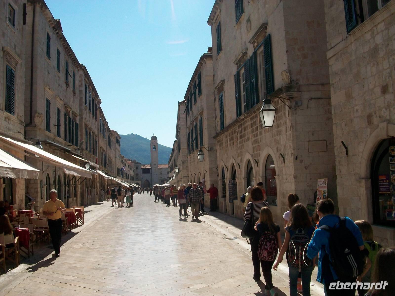 Dann geht es bei strahlendem Sonnenschein weiter, über die obere Gasse die auch gern „Fressgasse" wegen ihrer zahlreichen guten Restaurants genannt wird, gelangen wir wieder hinunter zur Blasiuskirche. Von hier haben wir einen schönen Blick bis zum anderen Ende von Stradun, der Kathedrale und dem Uhrturm von Dubrovnik.