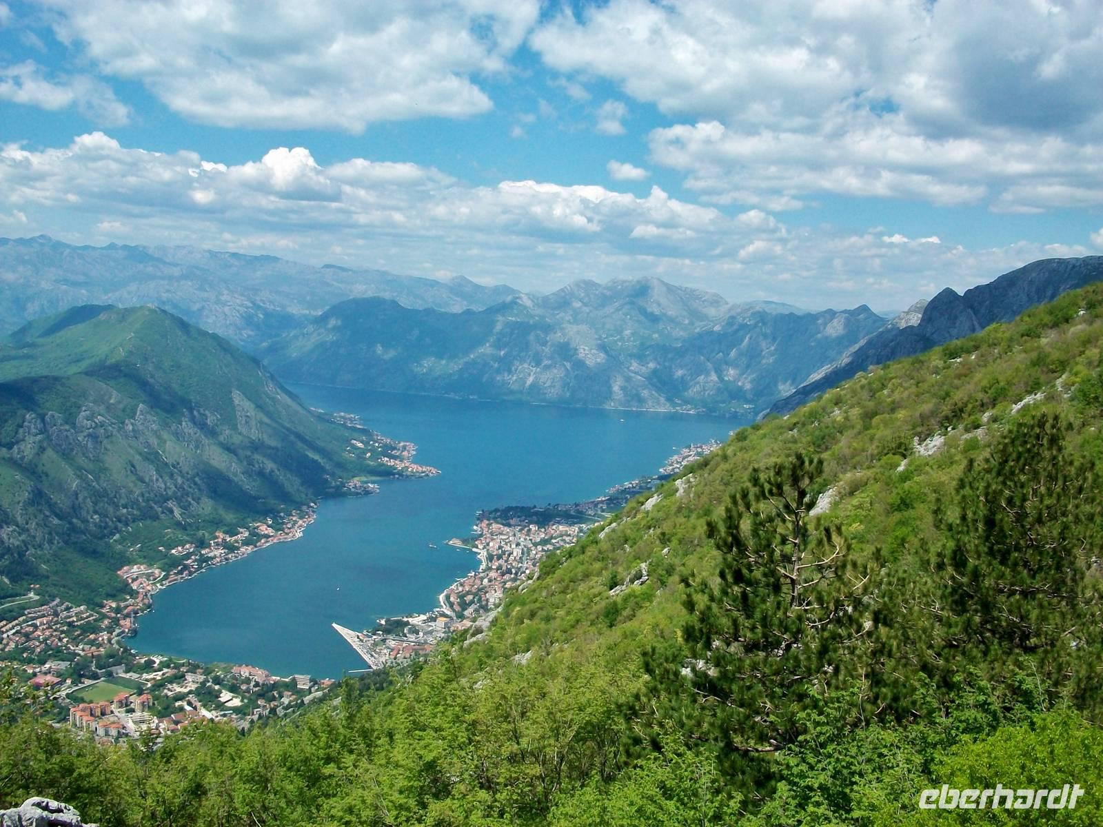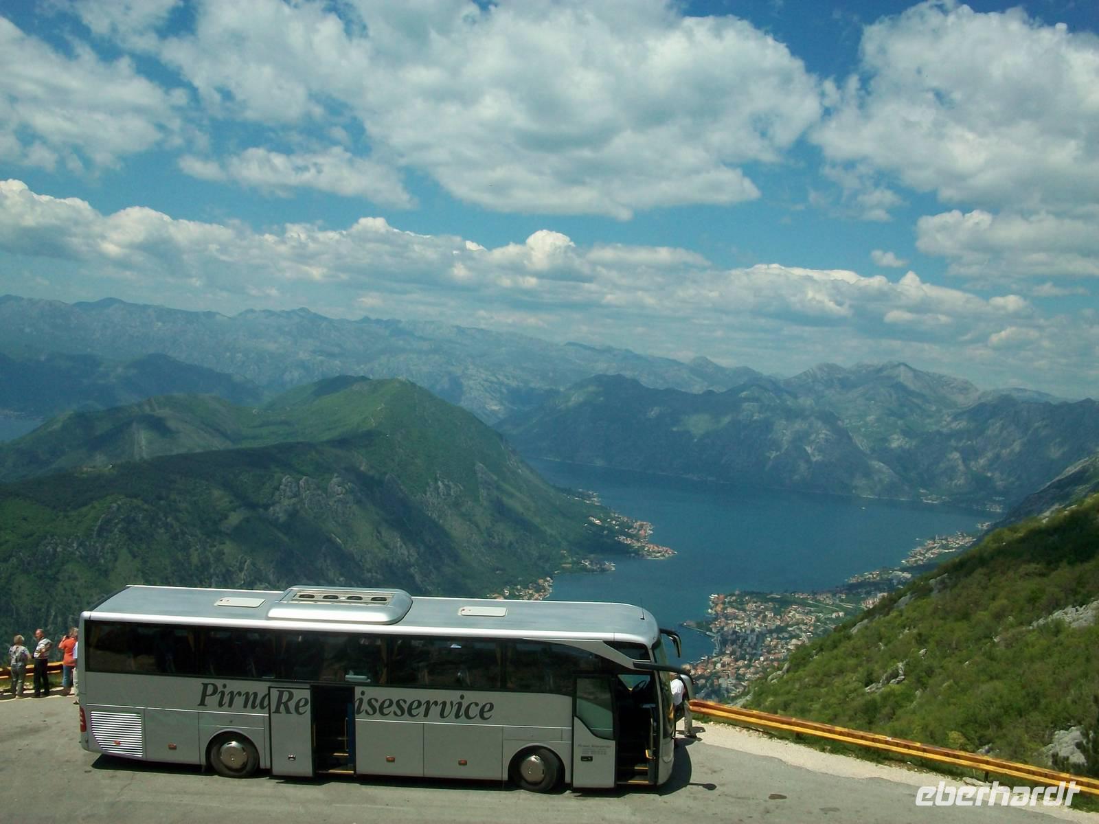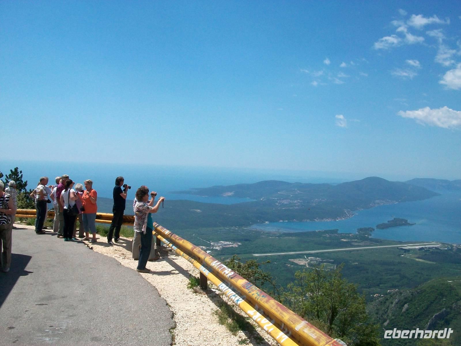 Nachdem die Formalitäten erledigt sind setzen wir die Fahrt fort; im Hintergrund ist schon die Wasserfläche der Kotorbucht zu sehen, von dort erheben sich die schroffen Spitzen des Lovcen- Massivs die ganz oben noch Schneereste tragen, während es hier unten schon fast sommerlich warm ist.