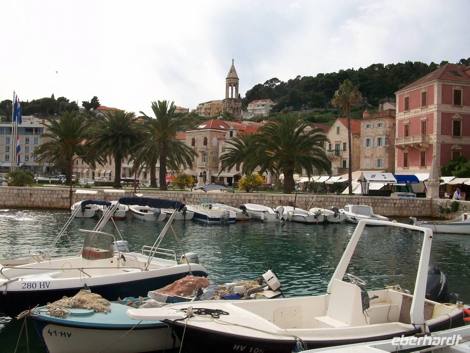 Die ersten Siedler waren die alten Griechen, von denen ist heute im Stadtbild nichts mehr zu sehen, aber die Macht Venedigs ist überdeutlich zu erkennen. Schöne Stadtpaläste, schmale verwinkelte Gassen, die Kathedrale und das ehemalige Arsenal sind die Höhepunkte die wir uns anschauen. Ein besonders schöner Ort ist der Hauptplatz der direkt in eine Bucht einmündet; auf dem Wasser sind zahlreiche Jachten festgemacht- Hvar ist auch ein Ort der zahlreichen wohlhabenden Gäste aus ganz Europa.