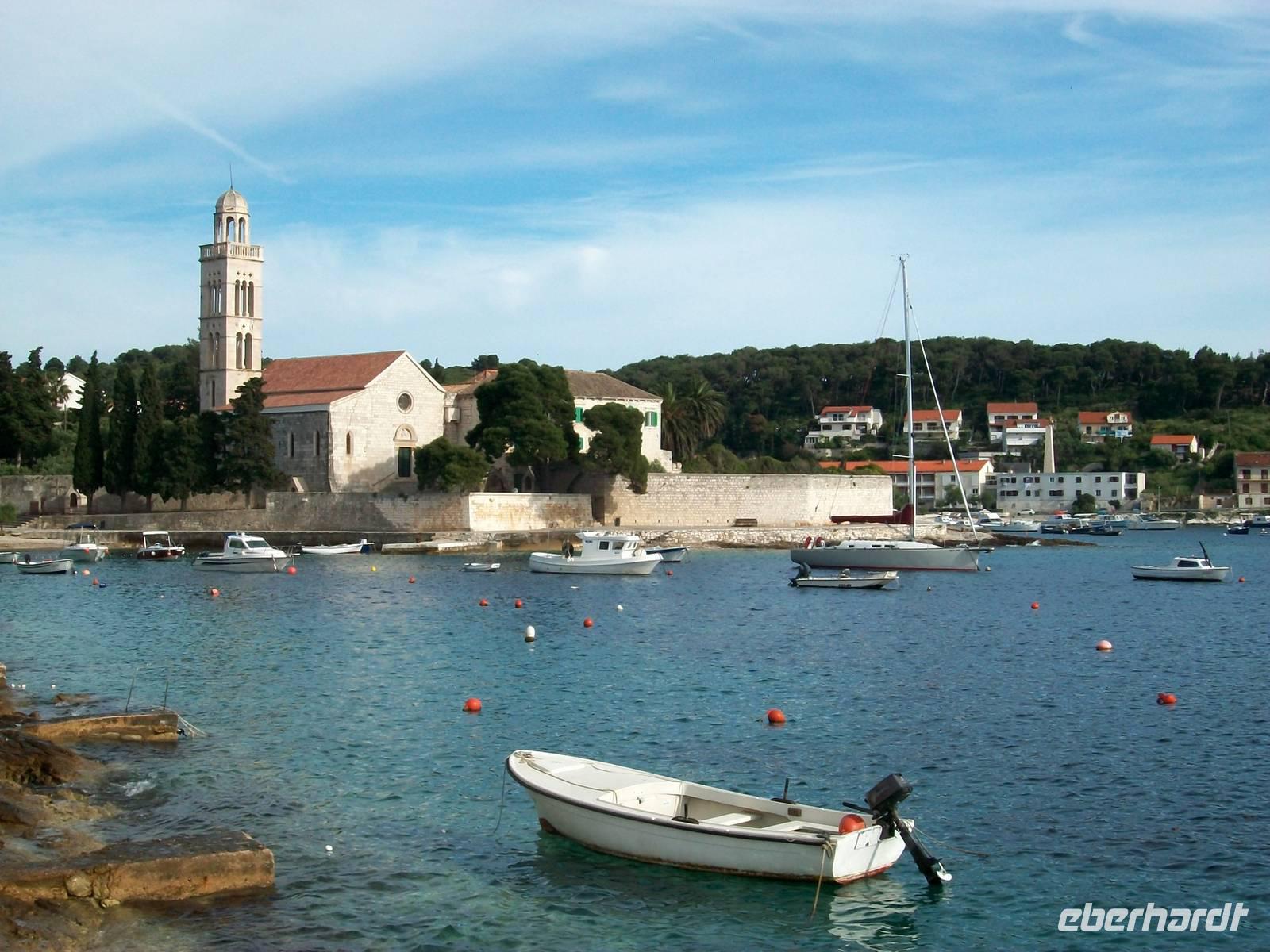 Die Überfahrt gestaltet sich sehr ruhig; nach etwa 40 Minuten langen wir auf der Sonneninsel Hvar an; von nun ab geht es durch eine unberührte mediterrane Landschaft. Einsame Dörfer lösen sich mit einer üppigen Vegetation ab, alles steht hier um diese Jahreszeit in voller Blüte, die verschiedenen Farben erfreuen das Auge und immer haben wir auch den Blick auf die unermessliche Wasserfläche der Adria.