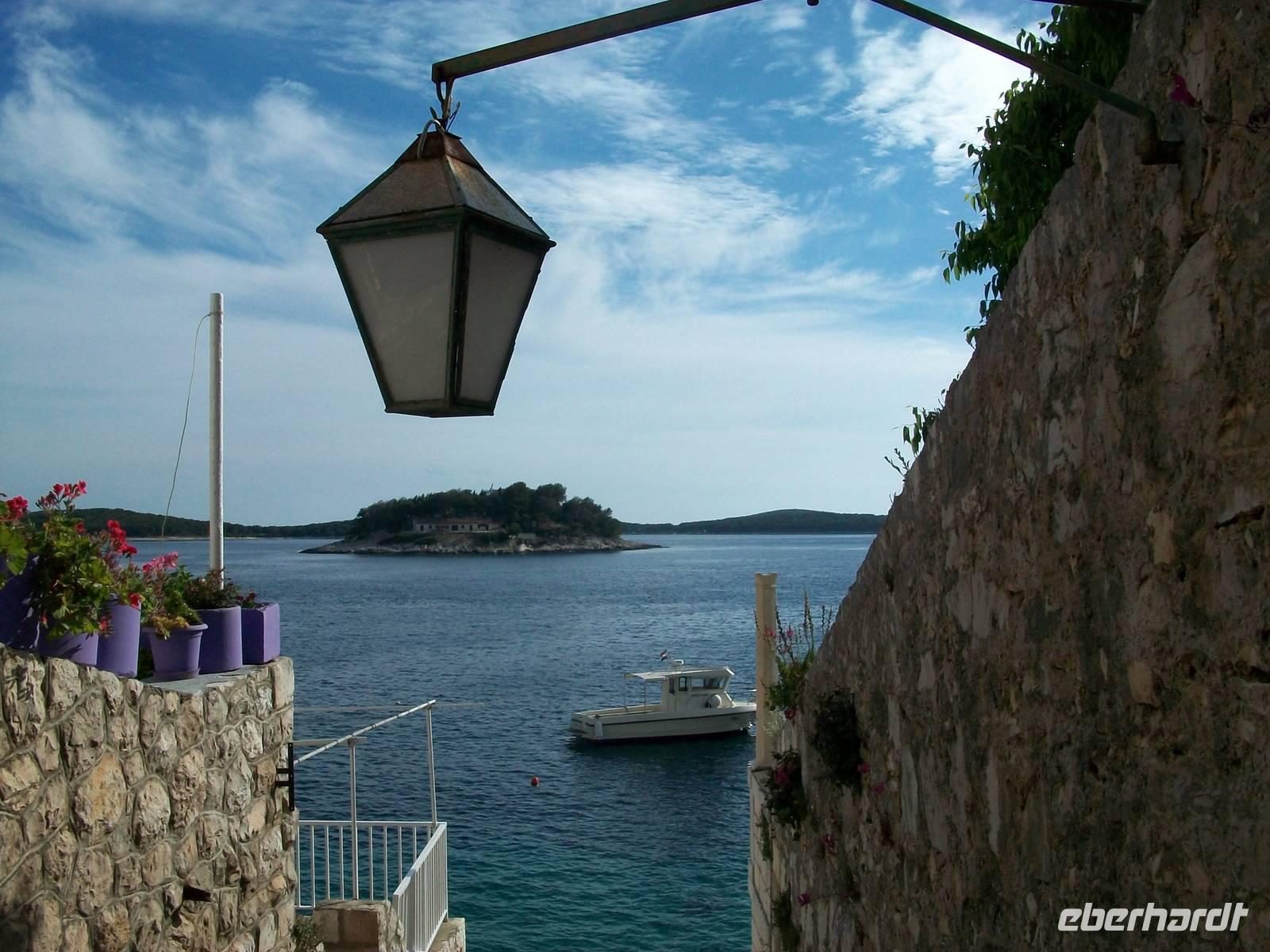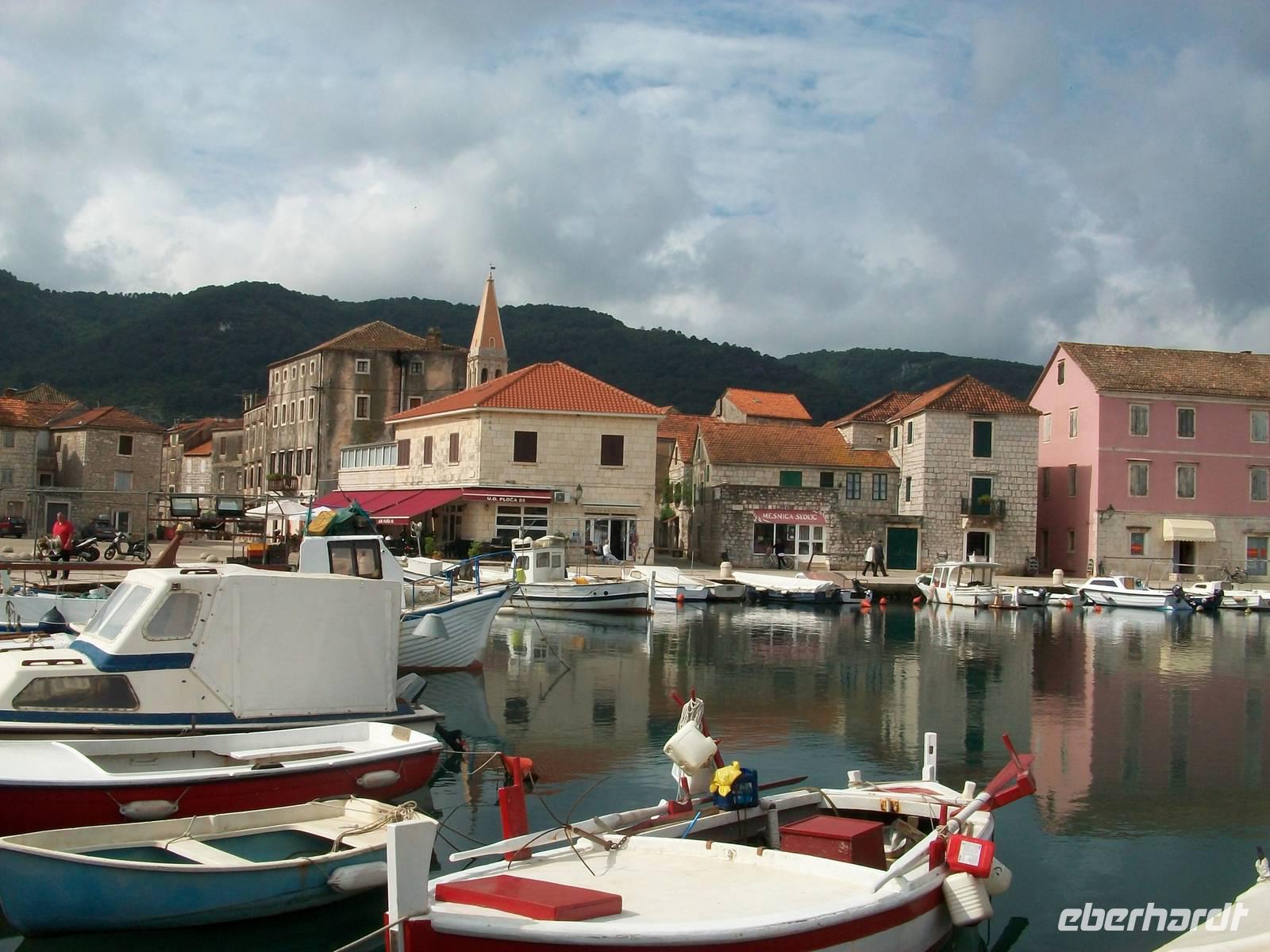 Als wir dann starten hat sich das Wetter gebessert und die Sonne begleitet uns auch heute. Über die Halbinsel Pelješac gelangen wir wieder zum Festland und auf der Küstenstraße mit den schönen Ausblicken durchqueren wir noch einmal das Neretvatal und erreichen gegen eins den Ort Drvenik. Von hier beginnt dann die Fährüberfahrt zur Insel Hvar; noch etwas Zeit um in diesem beschaulichen Ort bummeln zu gehen. Leichte Wellen schlagen an den Strand und bewegen dabei leise raschelnd die kleinen Kiesel.