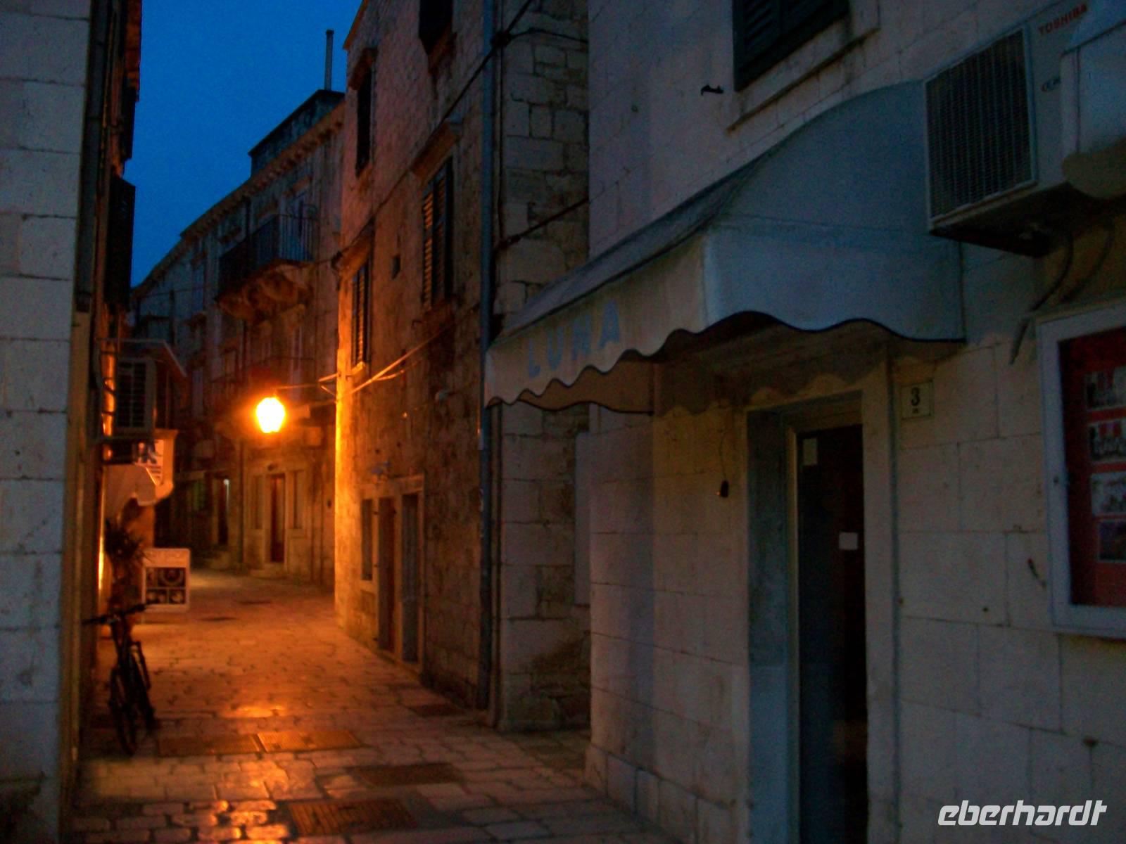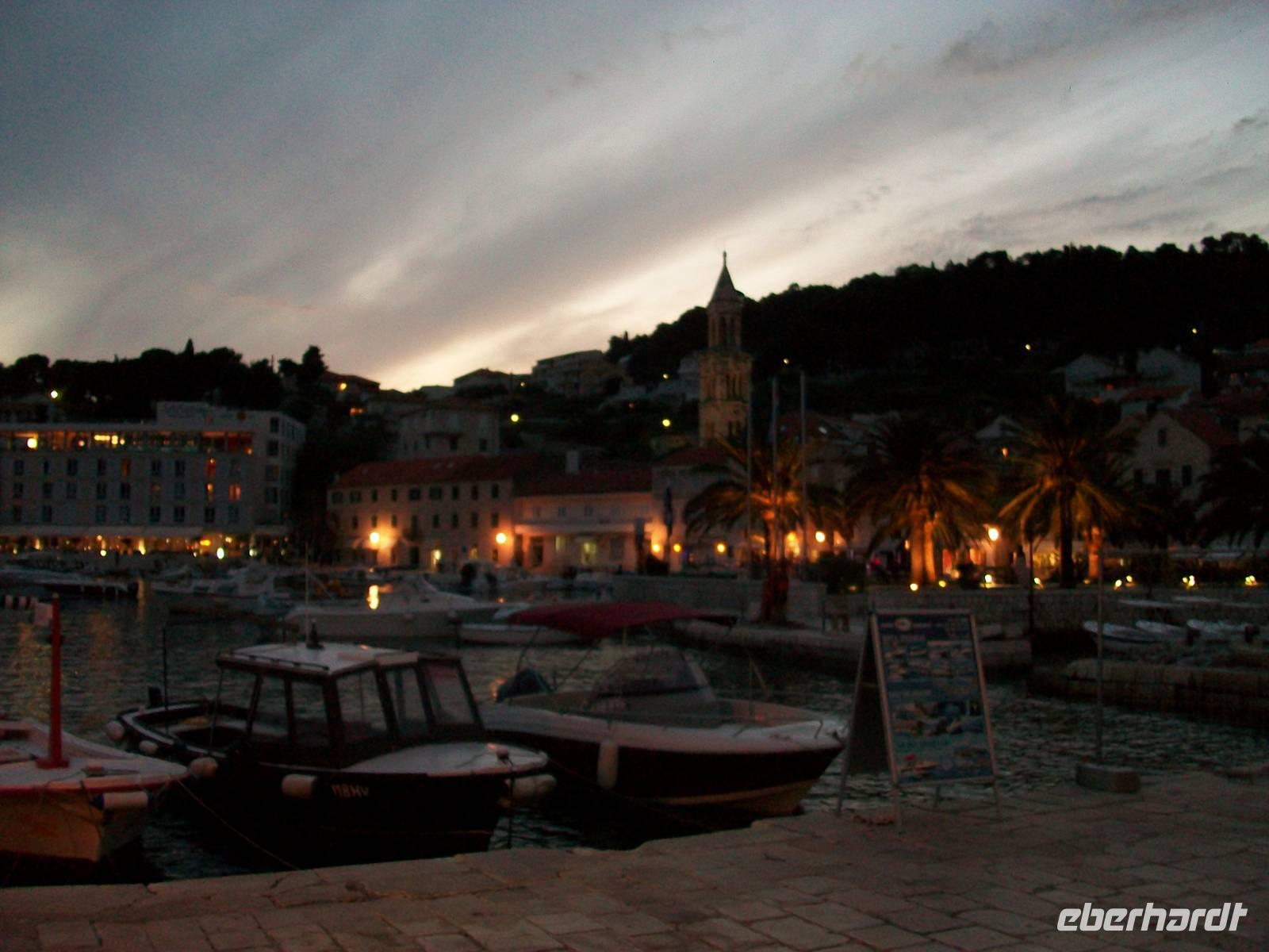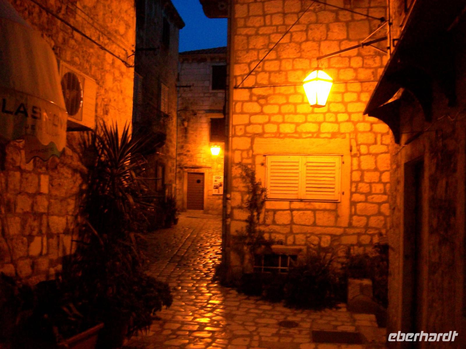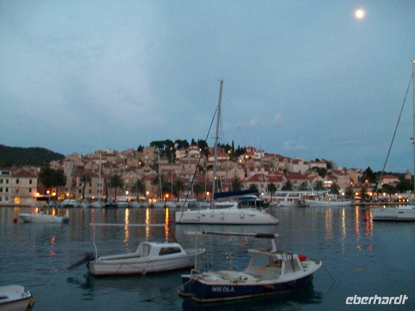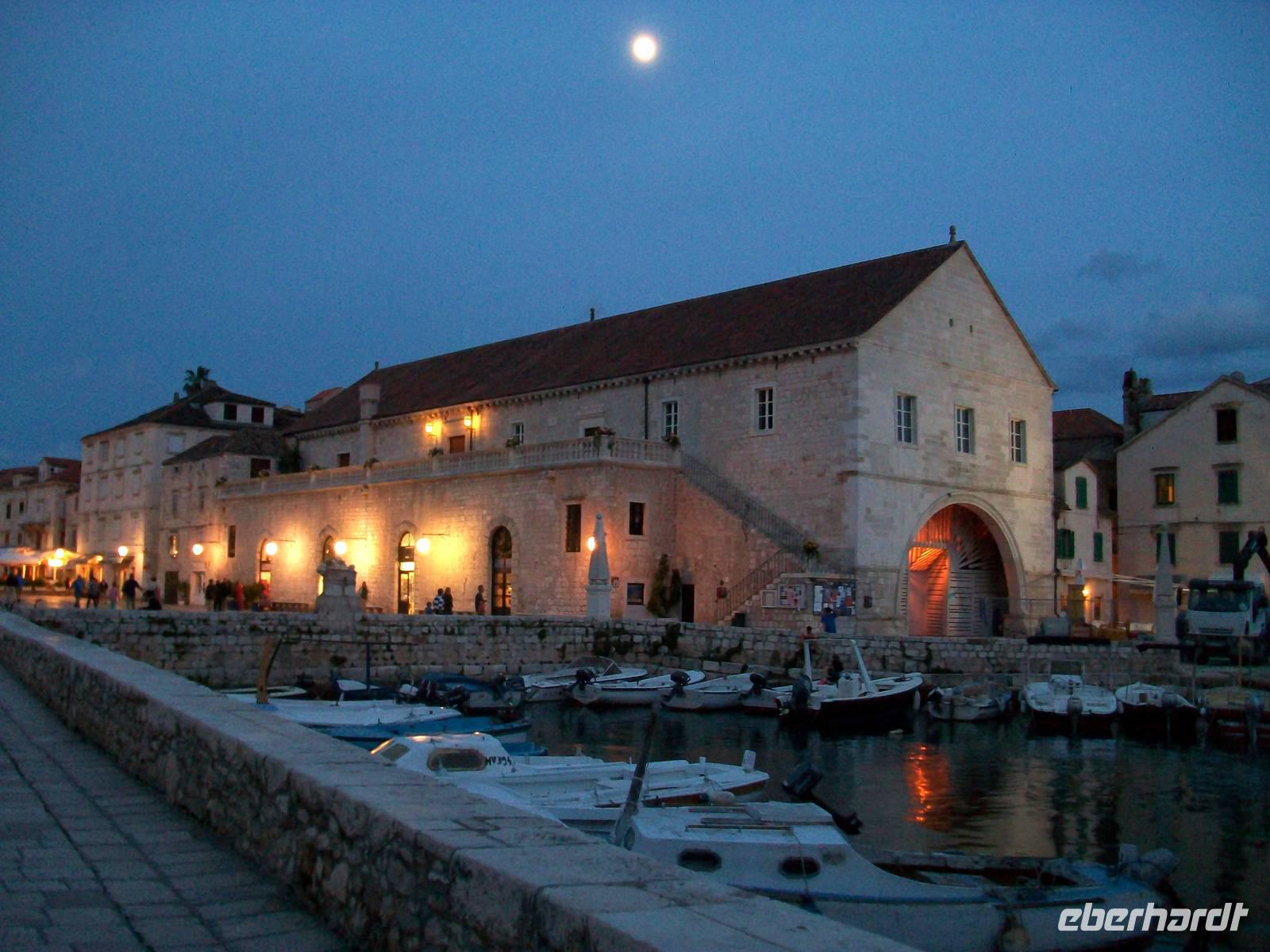 Nach der Führung gelangen wir zum Hotel und nach dem Abendessen ist es nur ein Katzensprung in die Altstadt. Entlang der schönen Uferpromenade kommen bald die Lichter von Hvar in Sicht; die Sonne ist untergegangen und die alten venezianischen Gebäude erstrahlen in einer magischen Beleuchtung. Über allem steht der Mond der diese überaus romantische Impression komplett macht.