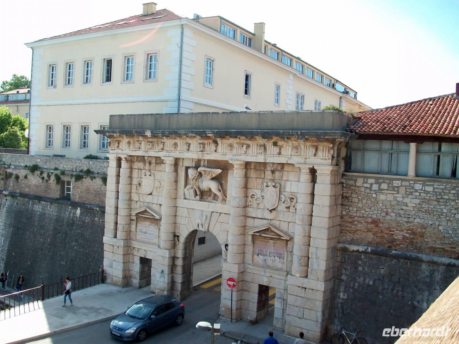 Zadar wurde im 2. Weltkrieg zerstört, deshalb gibt es hier auch moderne Bauten. An ihnen entlang geht unser Weg zum Hauptplatz. Neben der Stadtwache und der Loggia fällt ein Neorenaissancebau der Mussolini- Ära ins Auge, es ist das Rathaus. Vorbei an der Simonskirche und dem Platz der Fünf Brunnen geht es hinauf in einen kleinen Park, von hier oben werfen wir einen Blick auf das Landtor und die Befestigungsanlagen aus venezianischer Zeit. Hier beendet Edi die wie immer wissenswerte Führung und bis zur Abfahrt bleibt noch genügend Zeit für eigene Erkundungen im sonnigen Zadar.
