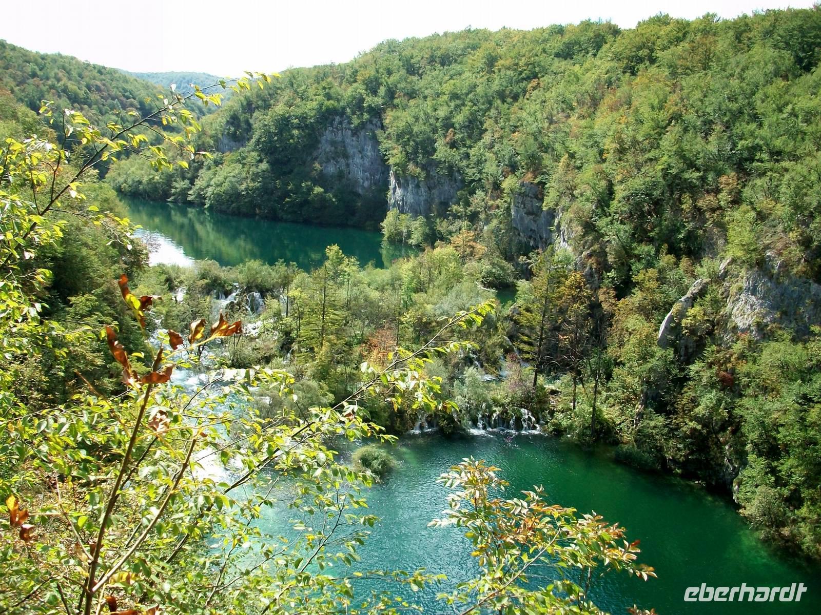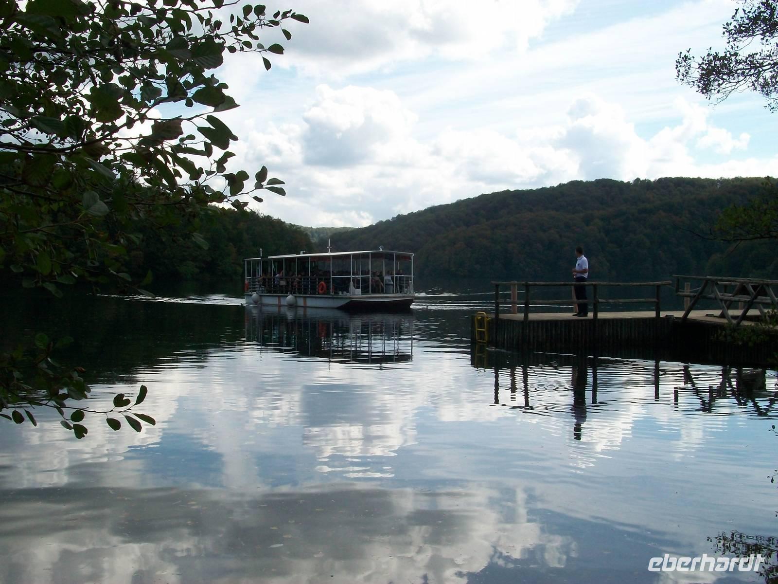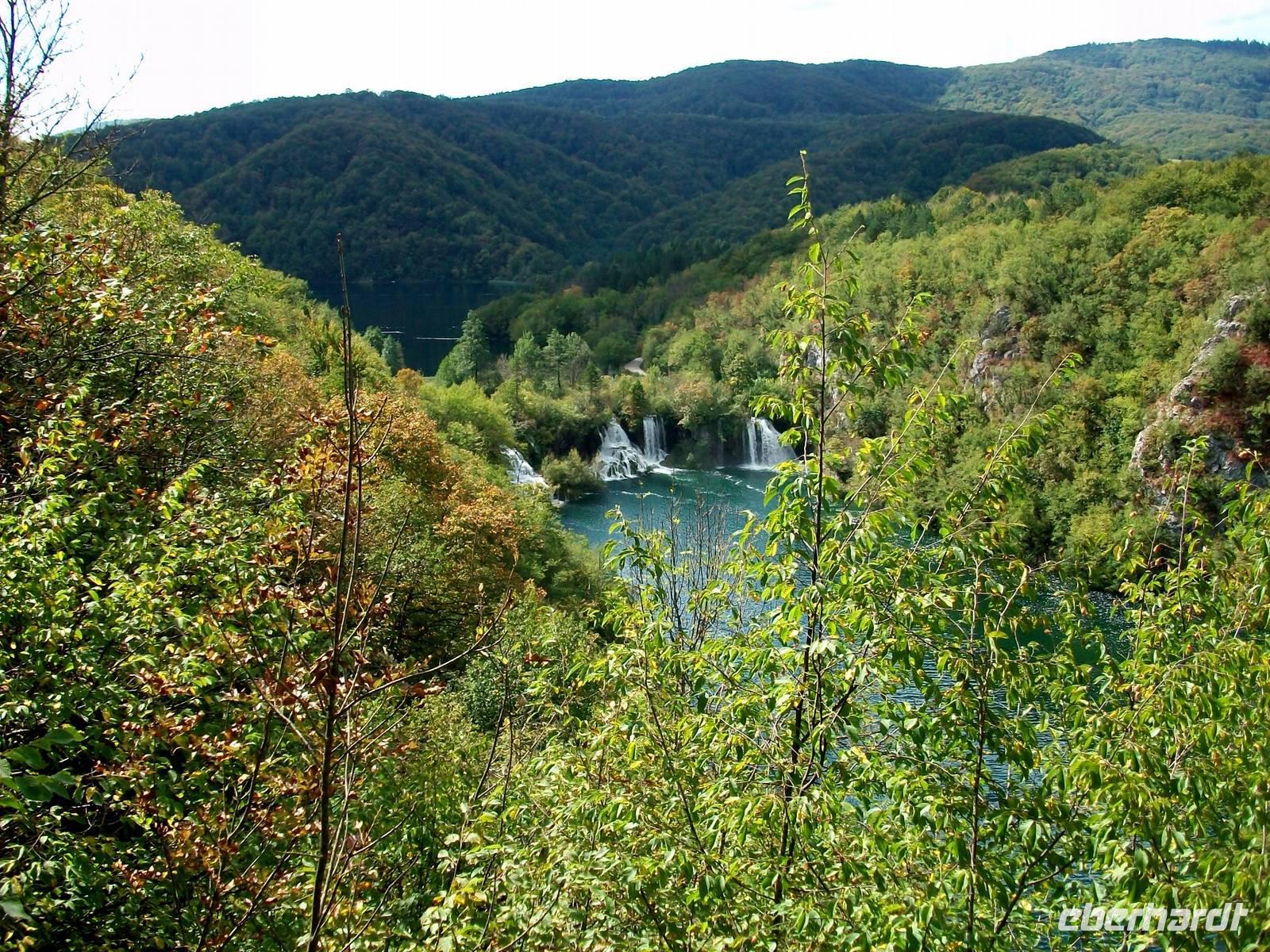 Vom Eingang 1 gelangen wir über die obere Strecke und können tief unten die smaragdgrünen Seen und die sie verbindenden Kaskaden sehen. Am ersten Aussichtspunkt werfen wir einen Blick auf den großen Wasserfall der donnernd sein Nass zur Erde sendet. Der Weg führt uns dann bergab und über eine Brücke gelangen wir zum Bootsanleger. Das erfordert nun etwas Geduld aber danach werden wir mit einer romantischen Überfahrt belohnt, langsam zieht dabei die nun schon fast herbstliche Landschaft an unseren Augen vorbei- wunderschön.