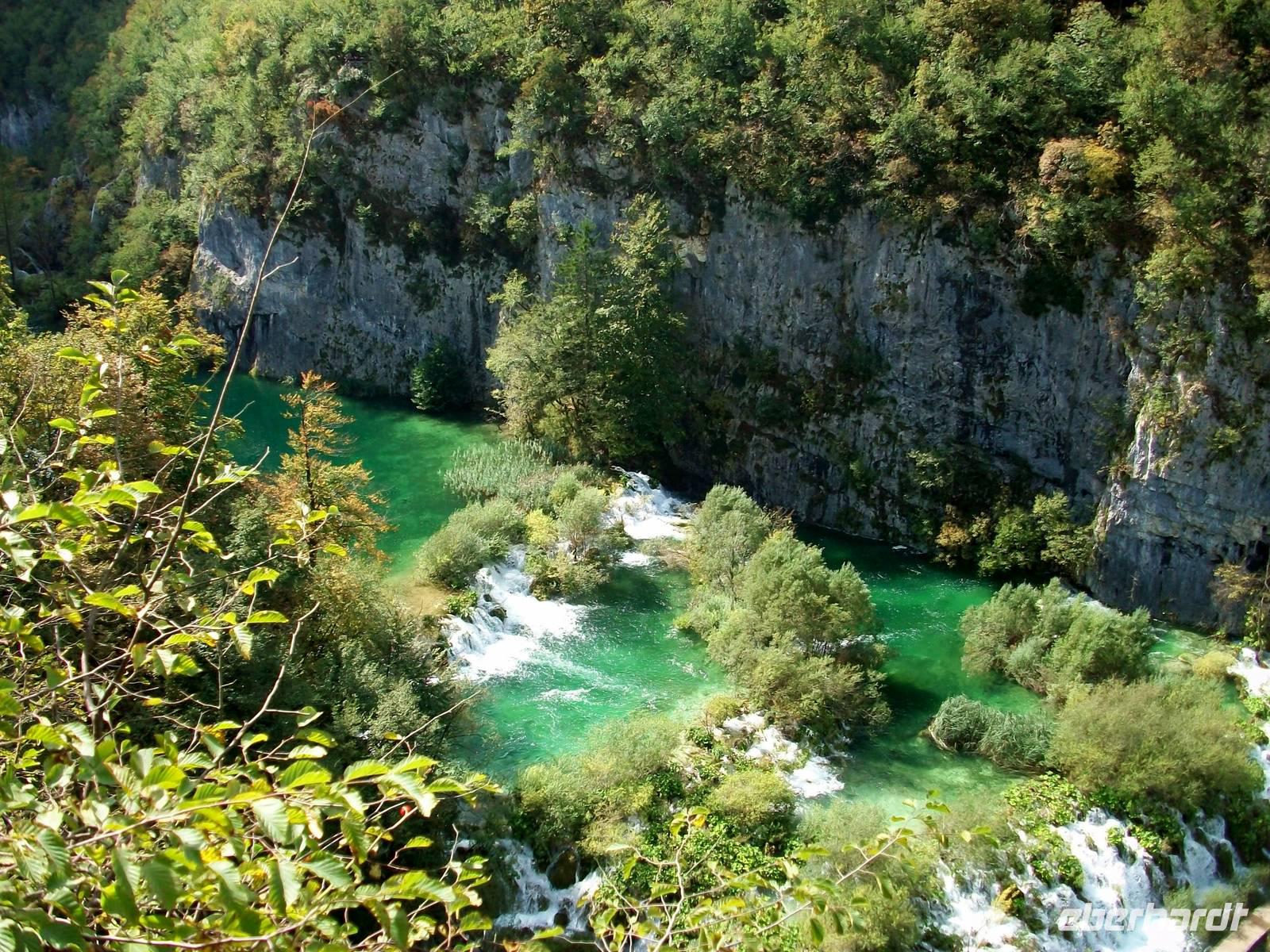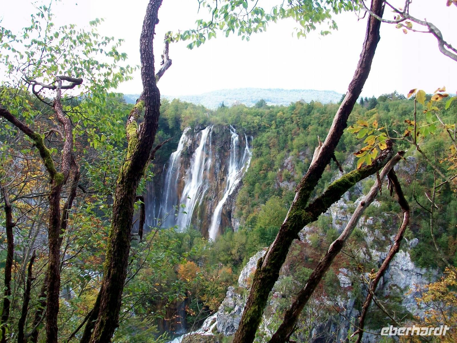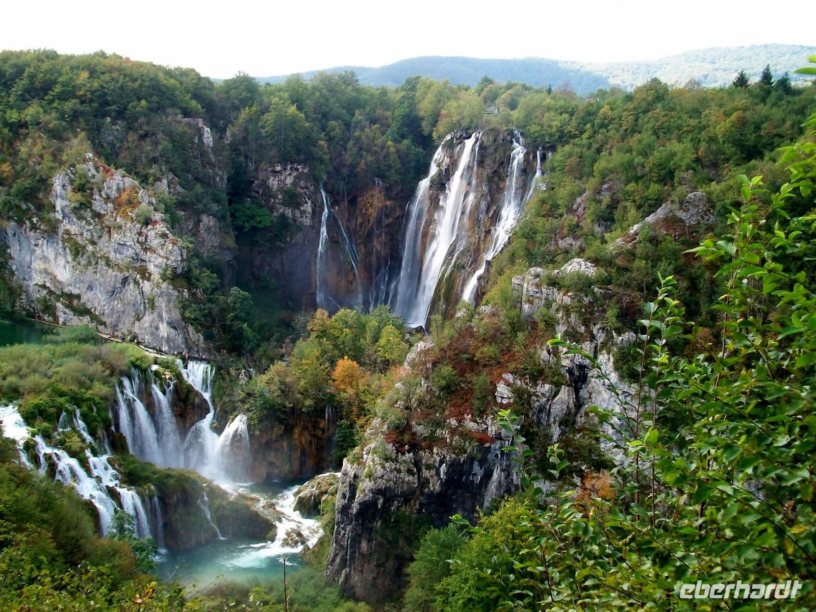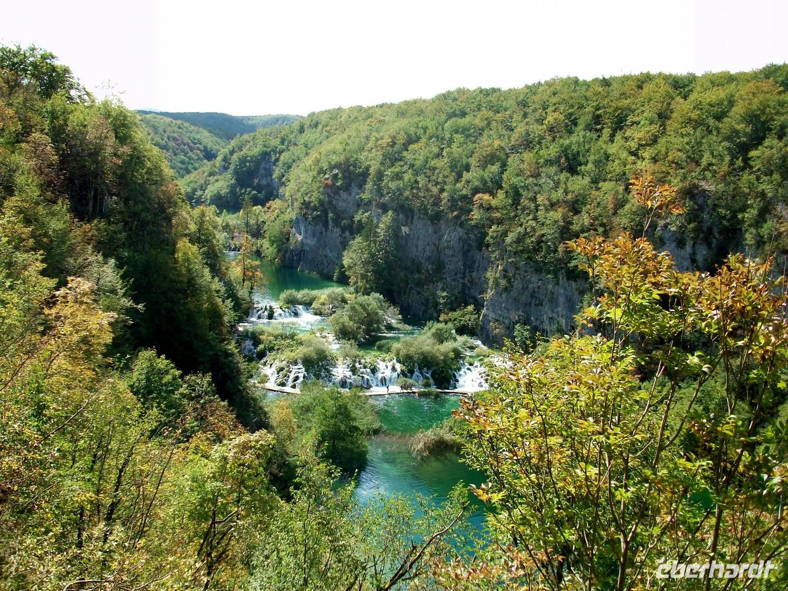 Vom Eingang 1 gelangen wir über die obere Strecke und können tief unten die smaragdgrünen Seen und die sie verbindenden Kaskaden sehen. Am ersten Aussichtspunkt werfen wir einen Blick auf den großen Wasserfall der donnernd sein Nass zur Erde sendet. Der Weg führt uns dann bergab und über eine Brücke gelangen wir zum Bootsanleger. Das erfordert nun etwas Geduld aber danach werden wir mit einer romantischen Überfahrt belohnt, langsam zieht dabei die nun schon fast herbstliche Landschaft an unseren Augen vorbei- wunderschön.