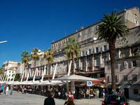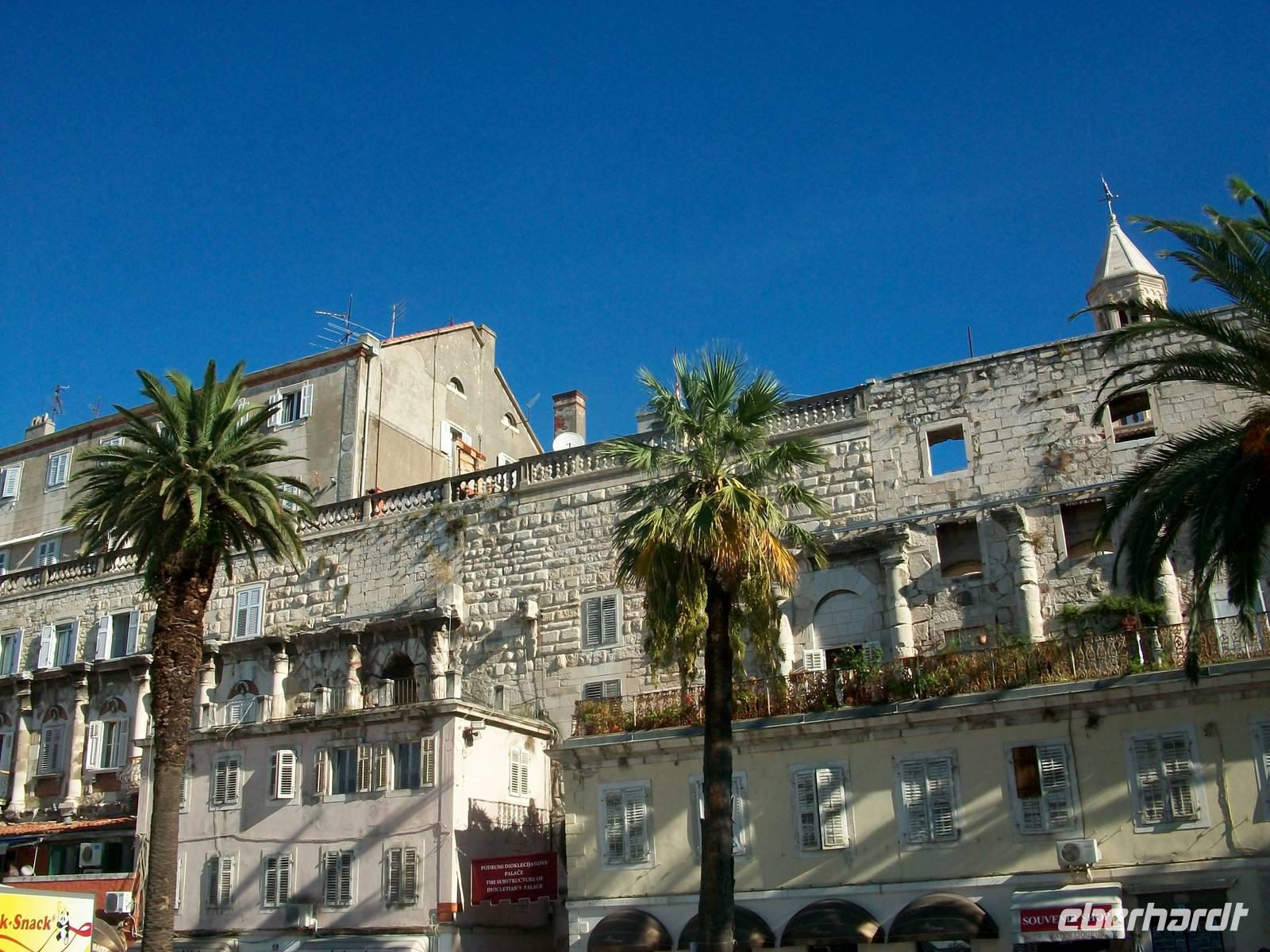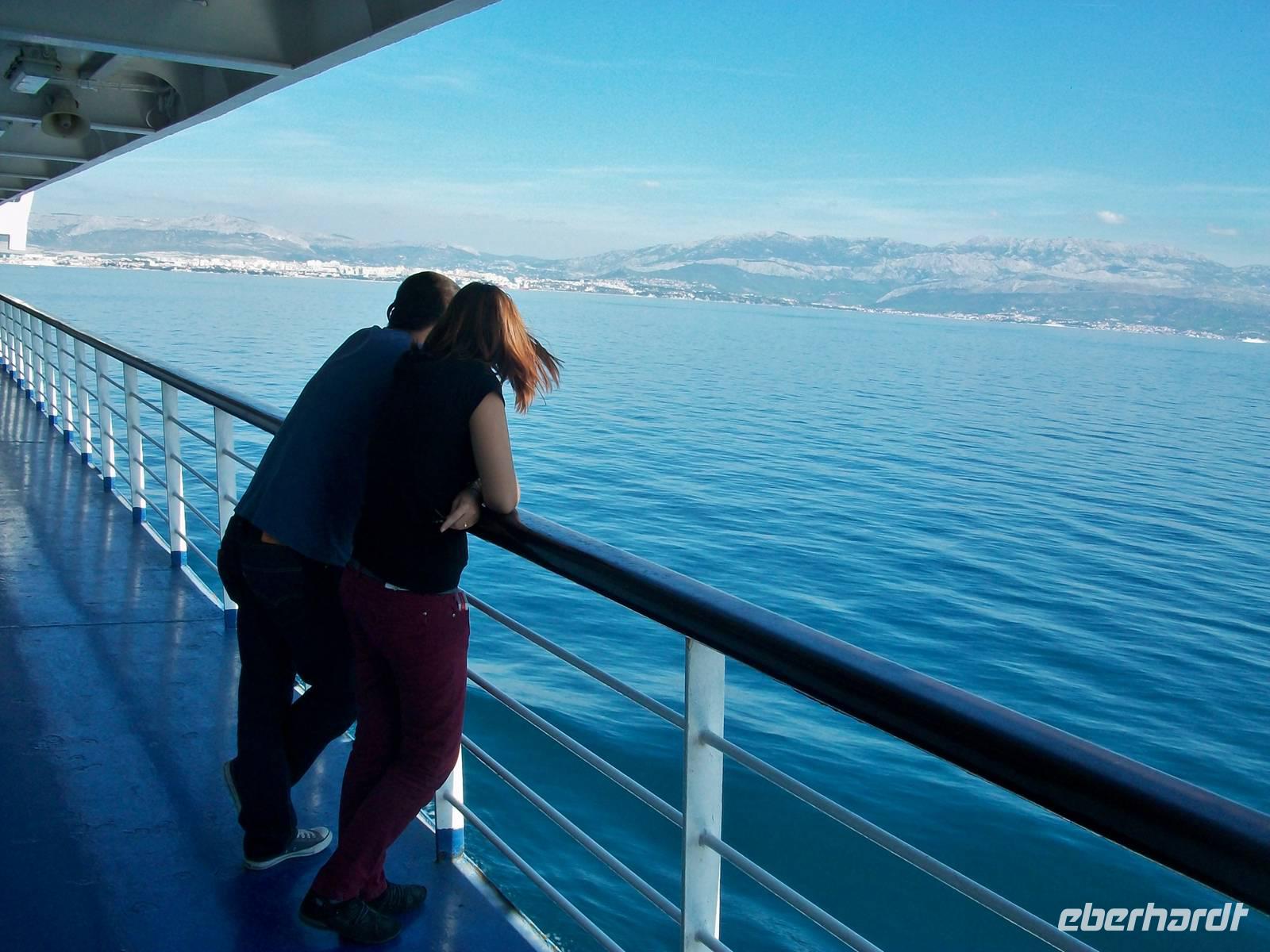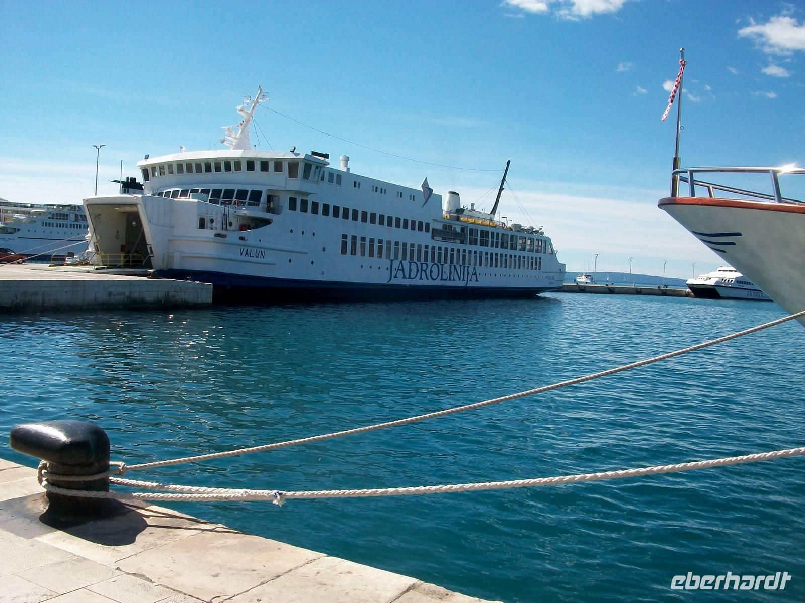 Gegen halb zwölf, unsere Gruppe hat sich ein schönes Plätzchen auf dem Sonnendeck der Fähre gesucht, legt das Schiff ab und bei strahlendem Sonnenschein und einer nur leichten Brise genießen wir die Überfahrt. Wir nehmen unsere Bahn zwischen den Inseln Brac und Šolta hindurch, über uns ist der blaue Himmel gespannt und leise rauschend schneidet sich der Kiel der Fähre durch das tiefblaue Wasser der Adria. Kann es eine angenehmere Erholung geben? Bald taucht das Häusermeer von Split auf, viel zu schnell geht die schöne Überfahrt zu Ende und wir kämpfen uns vorerst mit dem Bus durch das Gewühl der zweitgrößten kroatischen Stadt.
