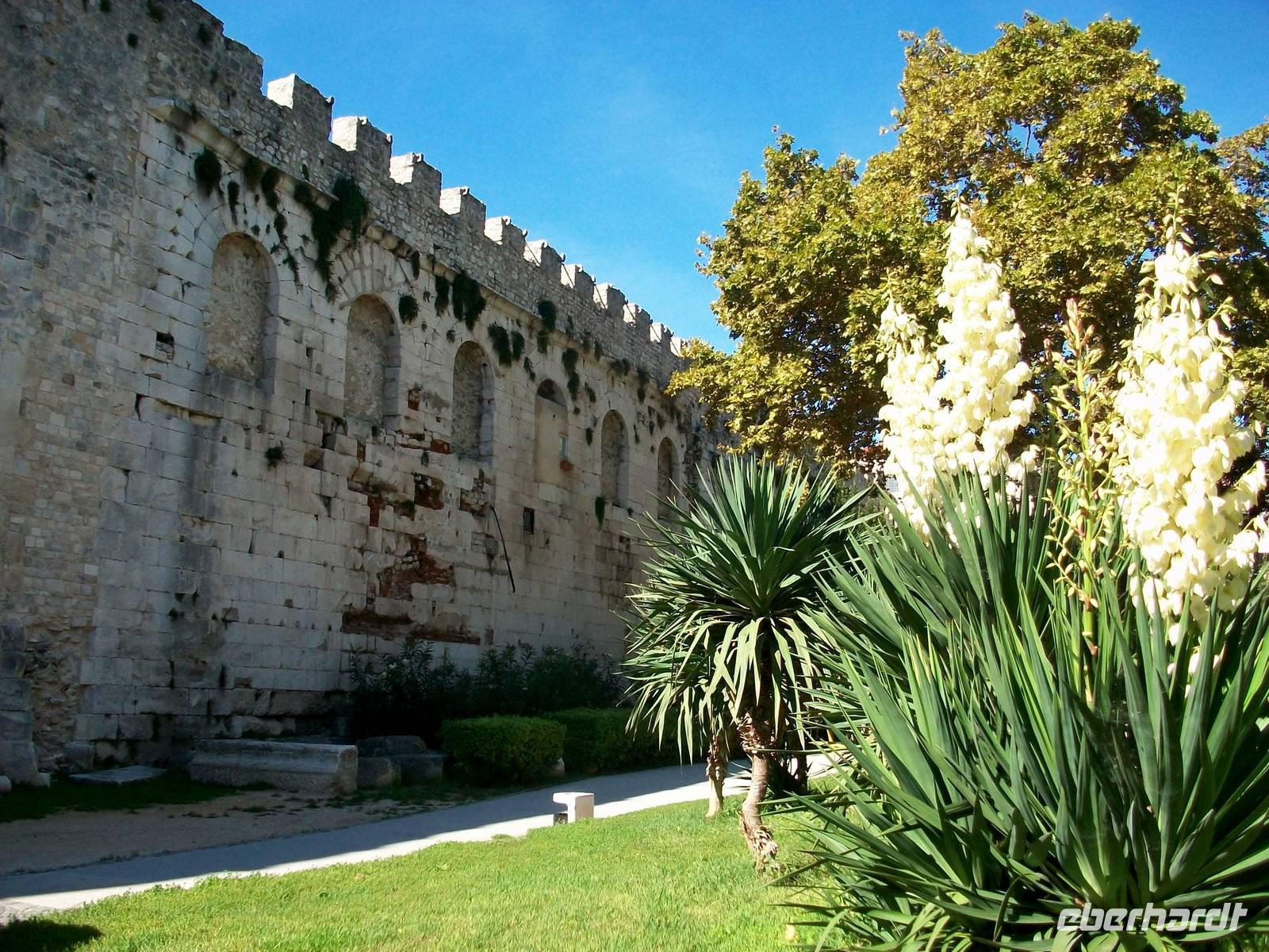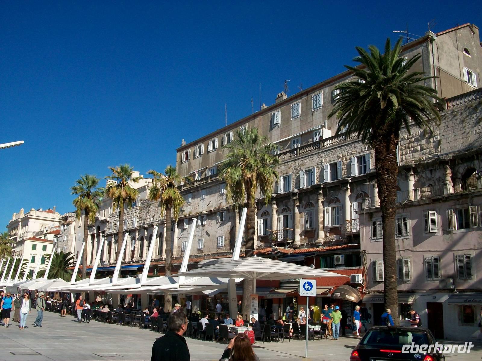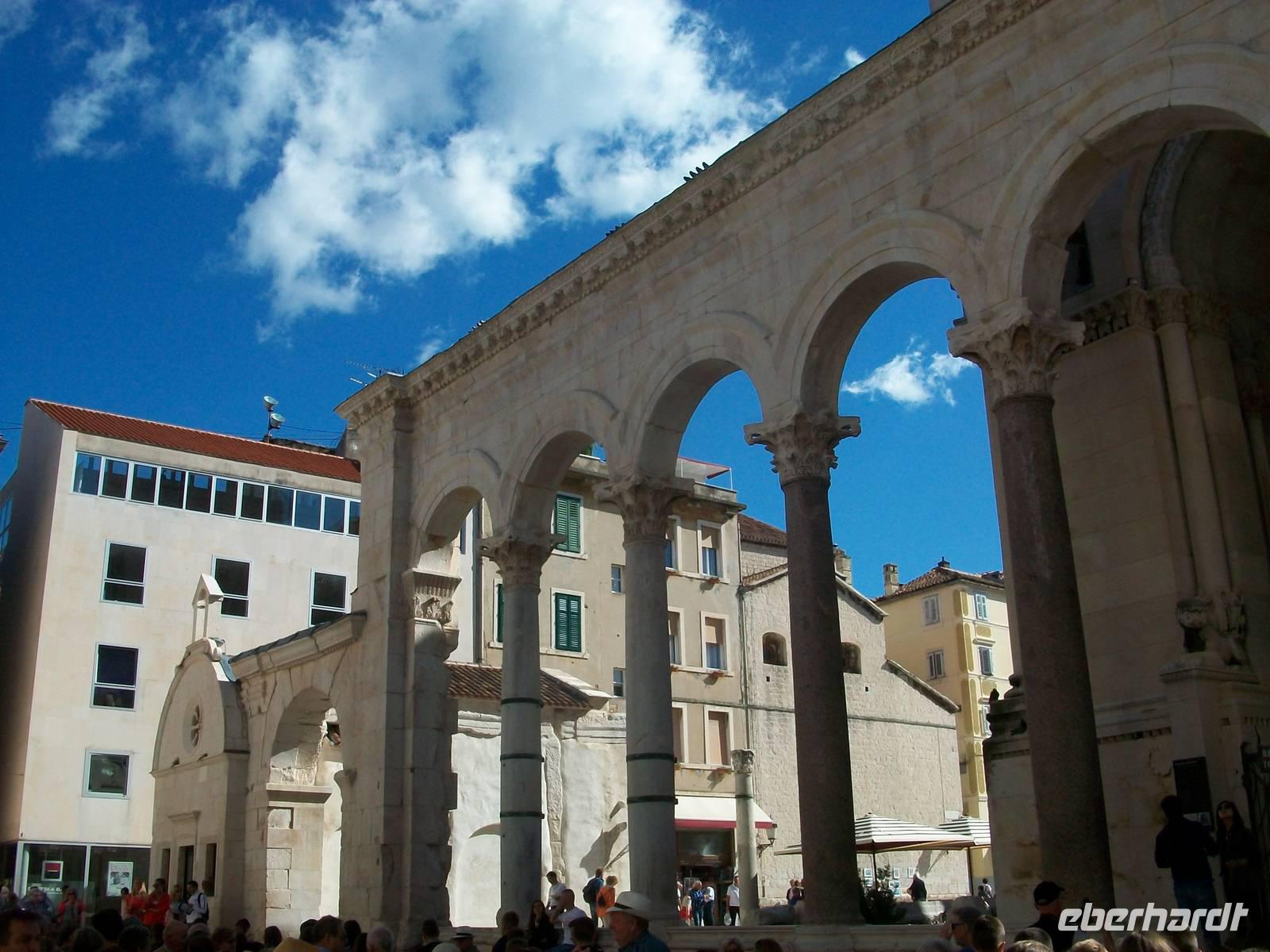 23.9.2014. In der Nacht hat uns Petrus wieder sein nun schon obligatorisches Gewitter gesandt, als wir aber gegen neun starten lacht aber schon wieder die Sonne wenngleich es sich etwas abgekühlt hat. Als wir von den Bergen herunterkommen breitet sich vor unseren Augen das Häusermeer von Split aus, es wird von der Morgensonne angestrahlt. Bald sind wir unten angelangt und wir müssen uns etwas durch den Verkehr kämpfen, dennoch kommen wir rechtzeitig am vereinbarten Treffpunkt an. Hier werden wir schon von Josip, unserem Stadtführer erwartet, er wird uns nun in die Geheimnisse von Split einweihen. Zunächst gelangen wir in die Kellerräume des Palastes den uns der Römische Kaiser Diokletian überlassen hat. Fast 2 000 Jahre alte Geschichte; wenn die Mauern reden könnten, so mach interessante Story würden wir erfahren. Kreuz und quer geht es durch diese alten Fundamente und als wir wieder am Licht auftauchen sind wir in einer anderen Zeitepoche unterwegs. Im Mittelalter und auch danach entstand die Altstadt; durch enge Gassen gelangen wir zu weiteren Höhepunkten, durchschreiten das Goldene Tor, schlendern über belebte Plätze und beenden die Führung wieder in der Nähe der Riva, es ist die Promenade von Split. Sie liegt im strahlenden Sonnenschein, das richtige Wetter für individuelle Exkursionen in dieser faszinierenden Stadt.