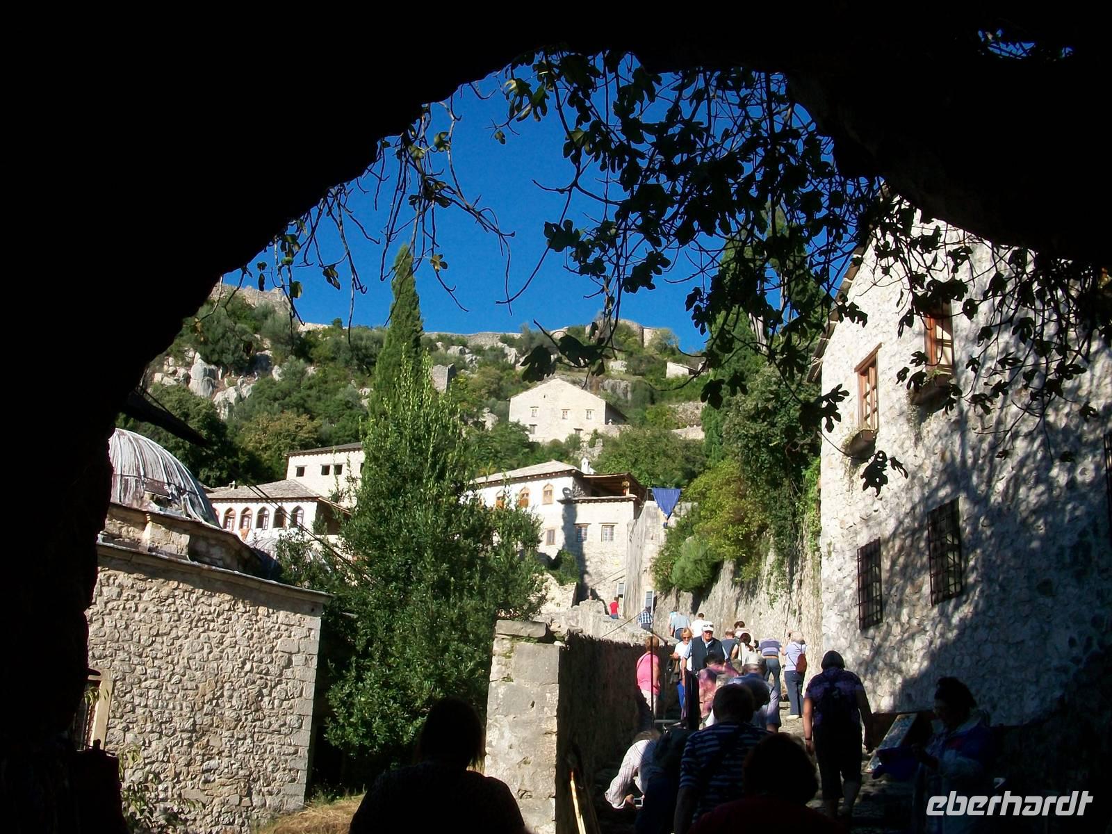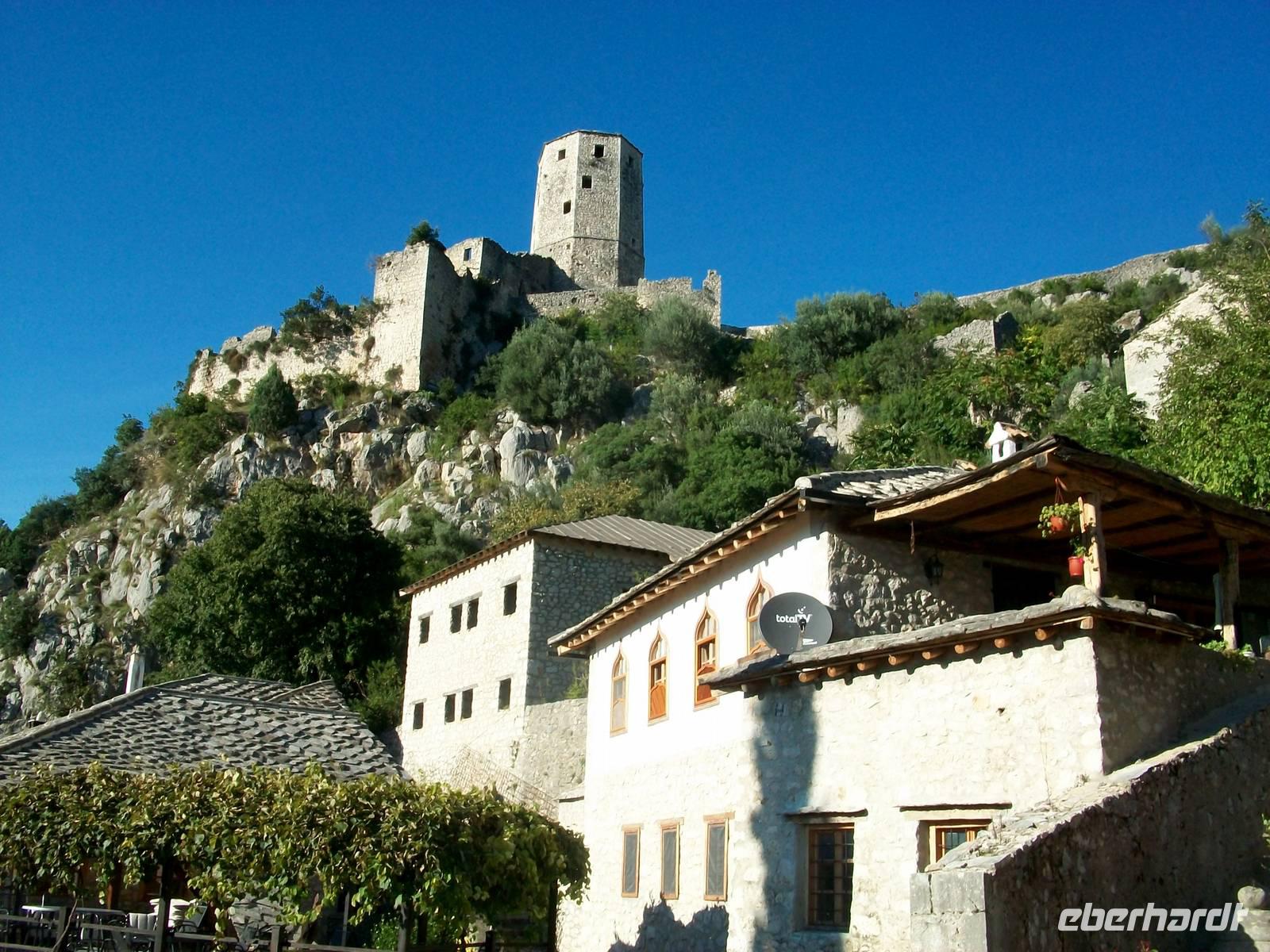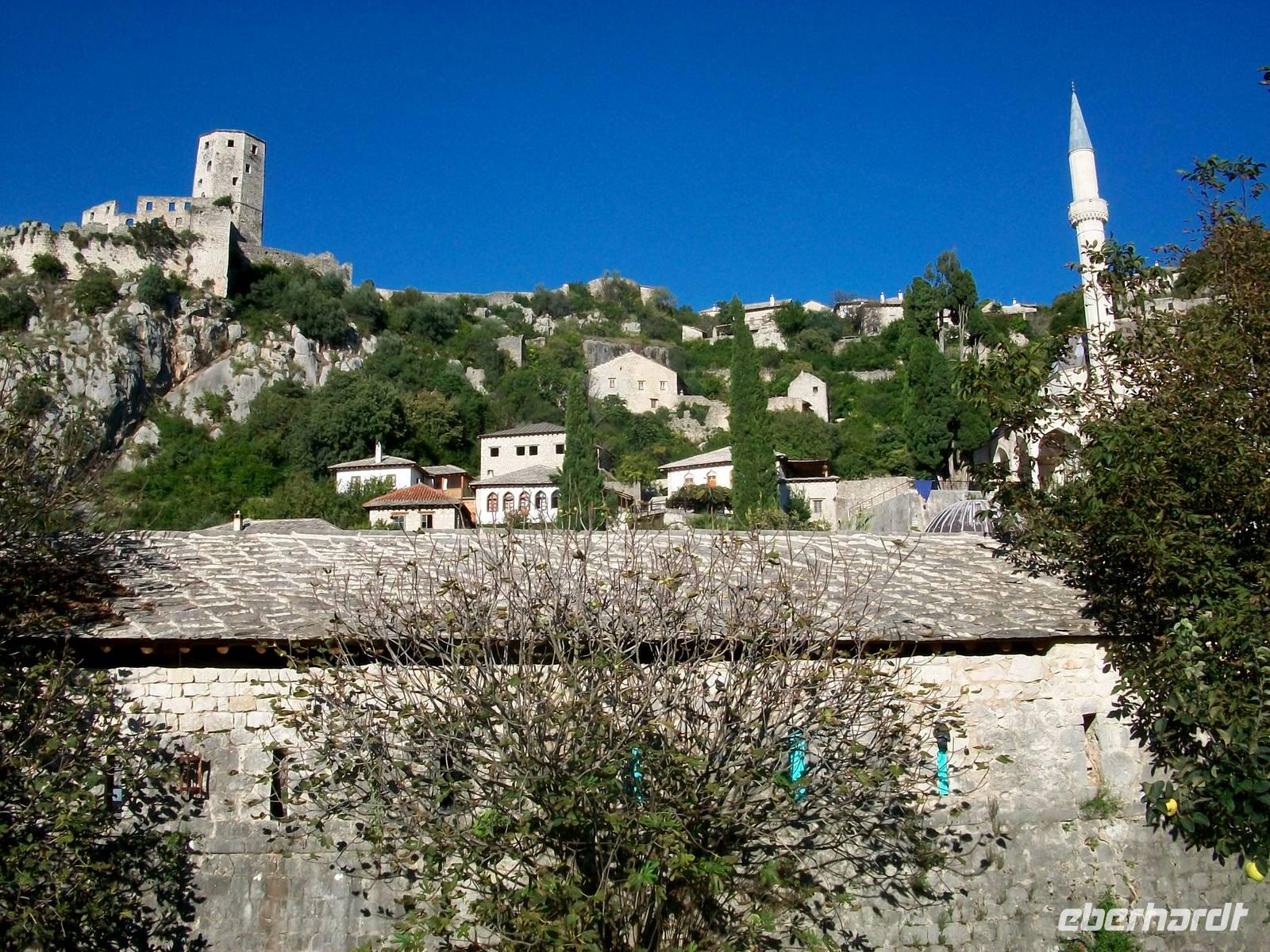 Dann sind wir an der Grenze zu Bosnien angelangt, die Formalitäten gehen schnell vonstatten und als wir in unserem neuen Gastland angelangt sind, tauchen wir gleichsam ein in einen neuen Kulturkreis. Hier herrschten über Jahrhunderte die Osmanen und hinterließen uns ihre Architektur. Besonders eindrucksvoll kann man das im Ort Pocitelj sehen, ihm statten wir noch eine Besuch ab. Ganz malerisch liegt er am Hang; beim Aufstieg zum alten Festungsturm breitet sich ein schönes Panorama vor unseren Augen aus: zu unseren Füßen der alte Ort und im Hintergrund schlängelt sich die Neretva durch die Berge.
