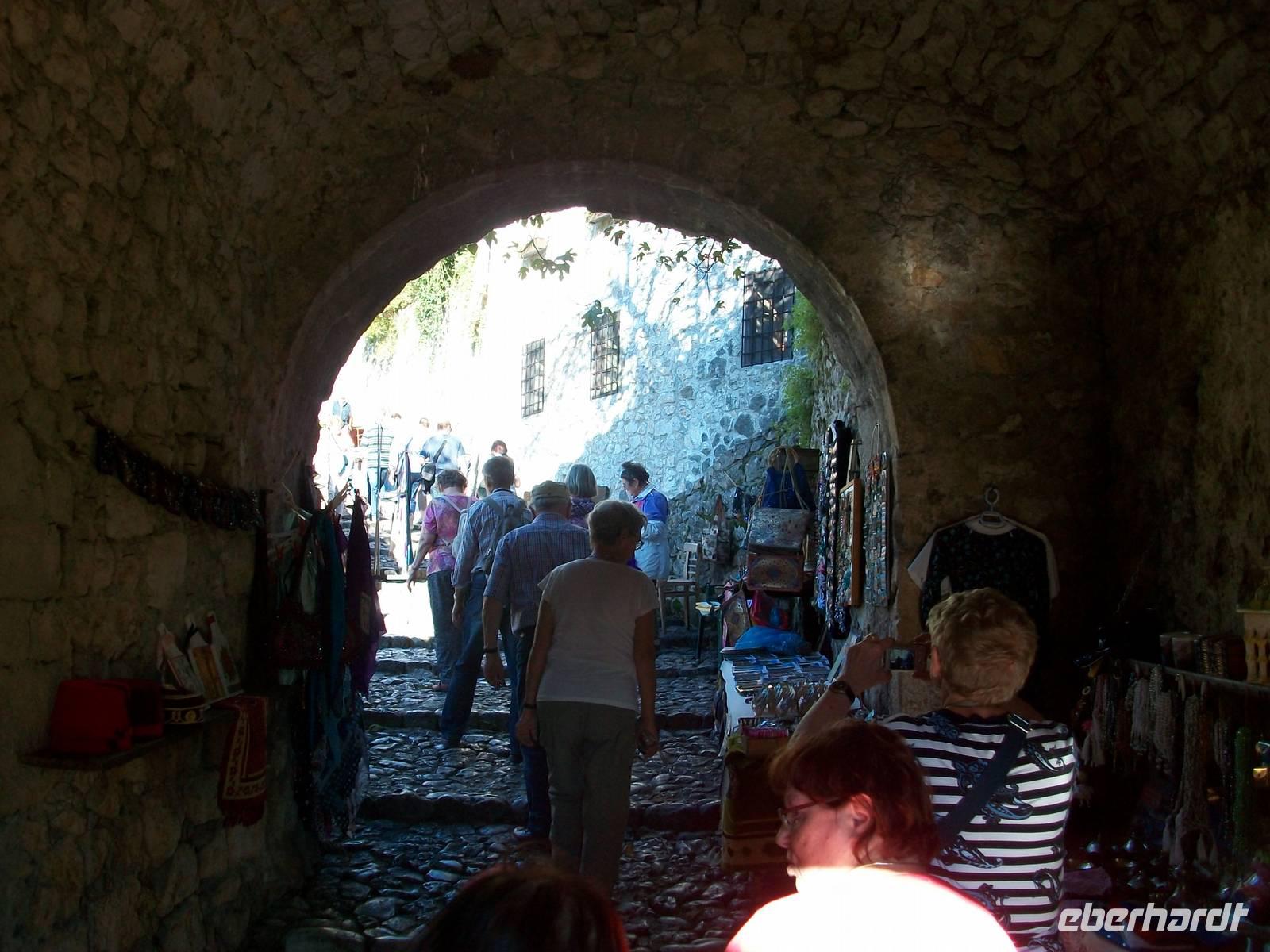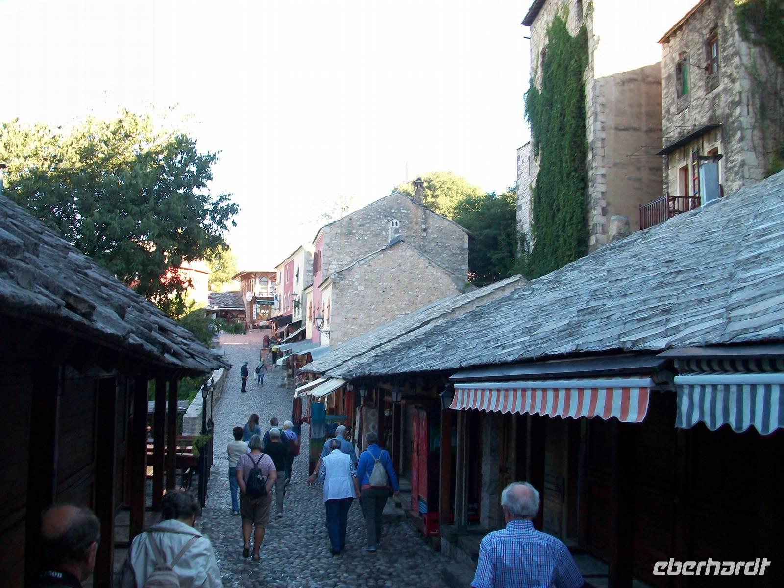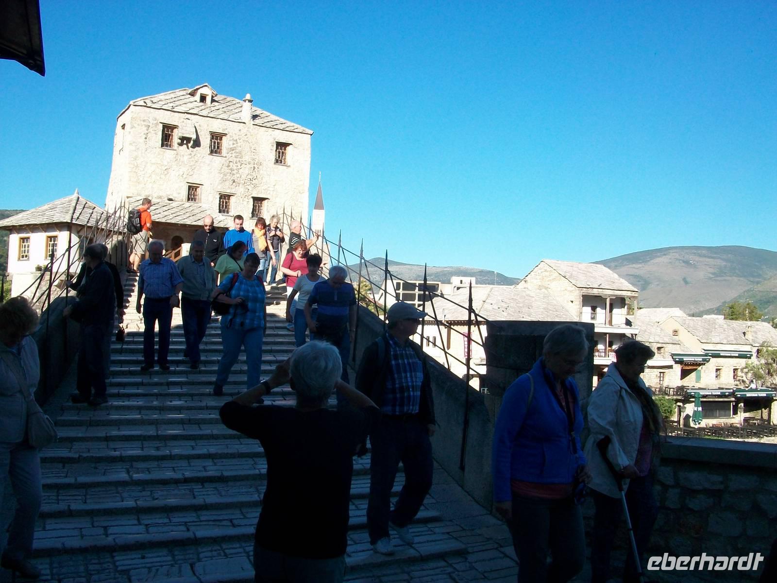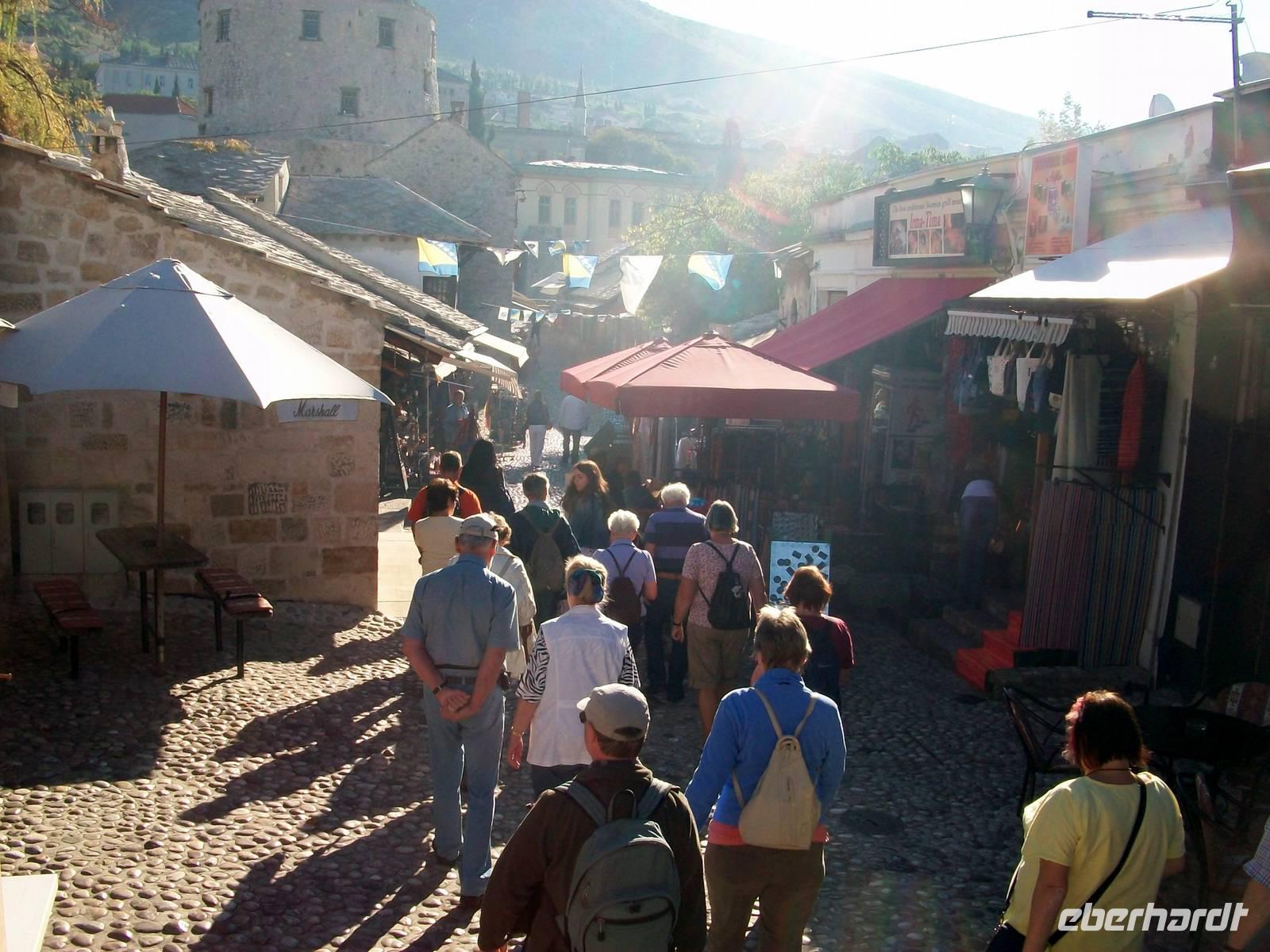 24.9.2014. Heute nun steht ein besonderer Ort auf dem Programm. Das Wetter kann schöner nicht sein und somit können wir pünktlich starten. Der Bus bringt uns zunächst in die Nähe der Altstadt von Mostar von hier geht nun alles zu Fuß. Mit unserer Stadtführerin Dea sind wir bald ein weiteres Mal ins Morgenland eingetaucht. Nicht ganz leicht sind die Steine auf dem Fußweg zu bewältigen, aber wir können uns Zeit nehmen zu dieser frühen Stunde sind nur wenige Touristen unterwegs.