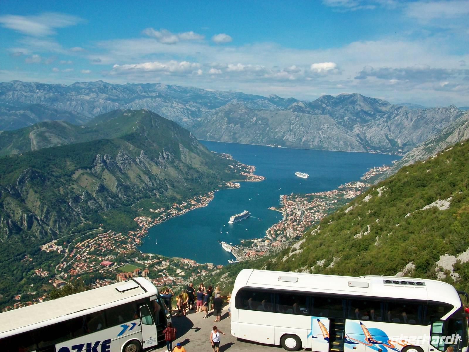 Dann sind wir in Kotor angelangt; hier können wir auch Jelena begrüßen, sie wird uns einen großen Teil des Tages durch ihr Heimatland begleiten. Zunächst erschließen wir uns die etwas geheimnisvollen Gassen von Kotor, stehen auf schönen Plätzen, bewundern die Kathedrale mit ihren zwei Türmen und statten dem Marinemuseum mit den hochinteressanten Exponaten einen Besuch ab. Danach verbleibt noch etwas Freizeit; die Mittagssonne sieht uns dann aber schon wieder auf dem Weg, wir erklimmen nun die Berge.