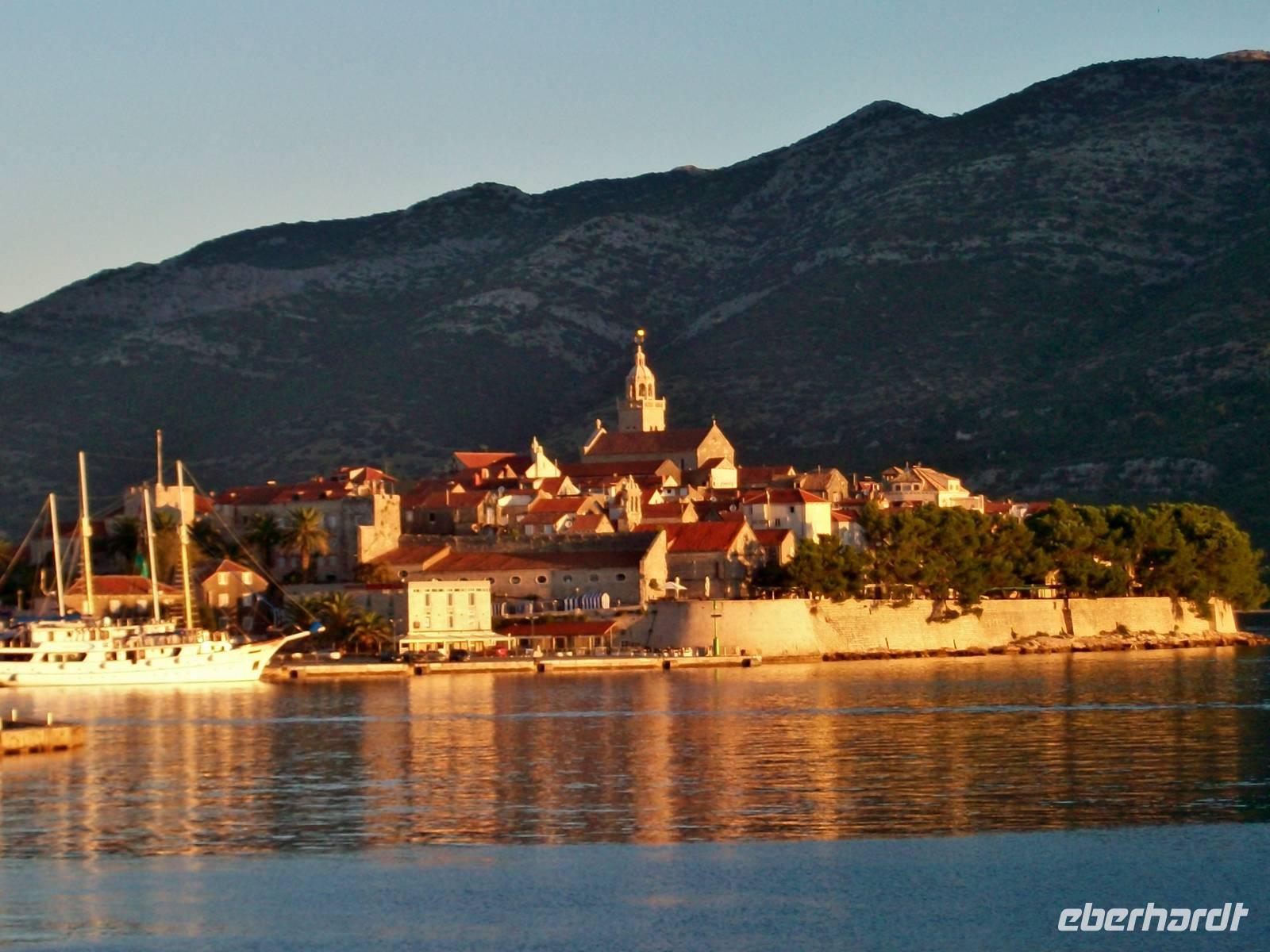 Die Morgensonne taucht die Altstadt von Korcula nach ihrem Aufgehen in ein rötliches Licht, es ist der ruhige Beginn dieses Tages der wieder viel für uns bereithalten wird.