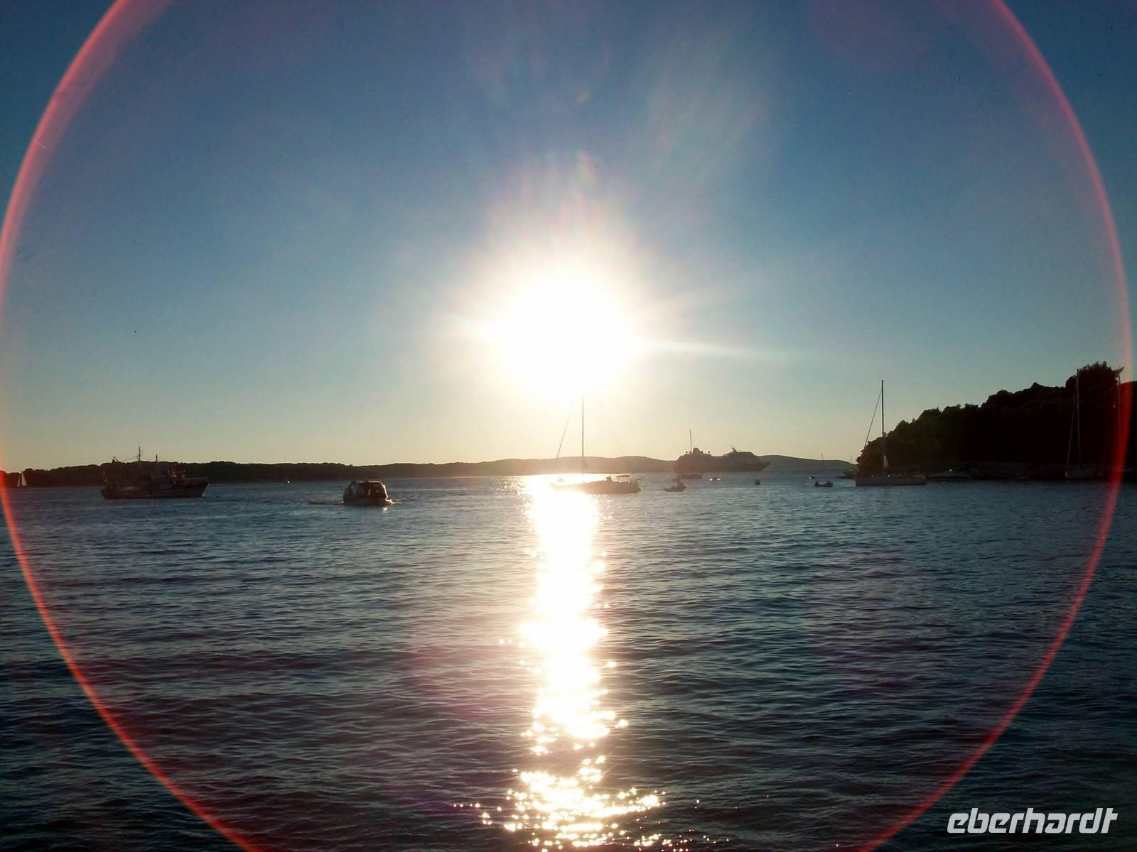 Noch etwas Freizeit im reizvollen Zadar, dann eine Fahrt von zwanzig Minuten mit dem Bus, doch bevor wir zum Hotel gelangen, sehen wir von den Busfenstern noch wie der glutrote Ball der Sonne hinter der Insel Ugljan untergeht.