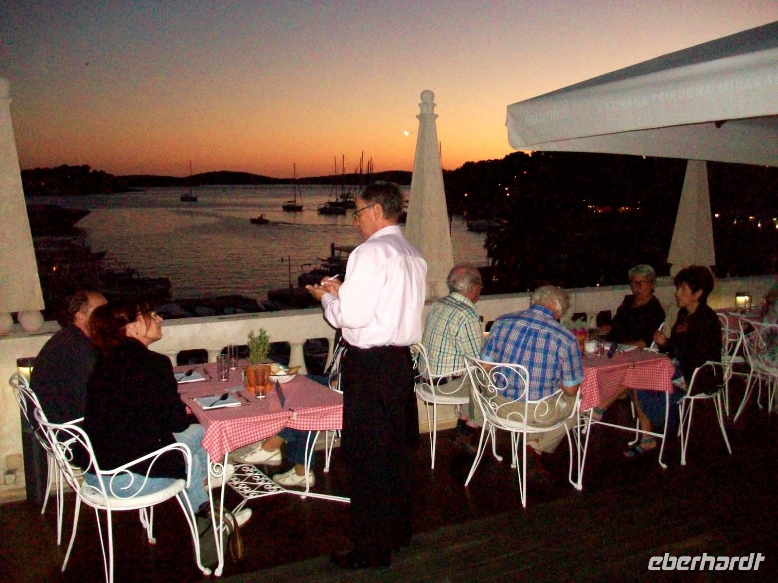 Die Sonne ist untergegangen und die Dämmerung hat Einzug gehalten als wir uns auf der Terrasse unseres Hotels zum romantischsten Diner der Reise wiedertreffen. Mit Blick auf den kleinen Hafen und die schön beleuchteten venezianischen Gebäude von Hvar geht auch dieser Tag zu Ende.