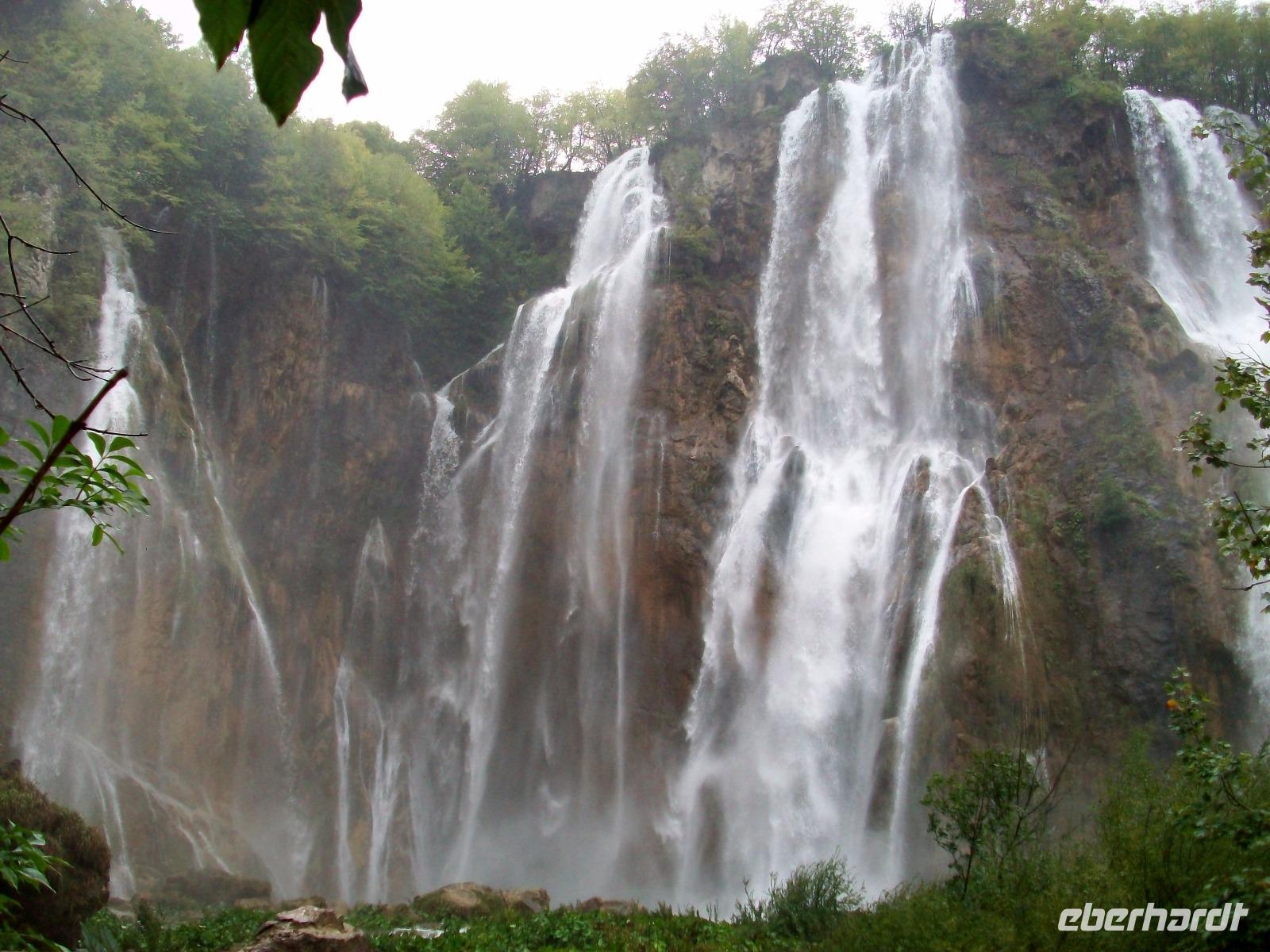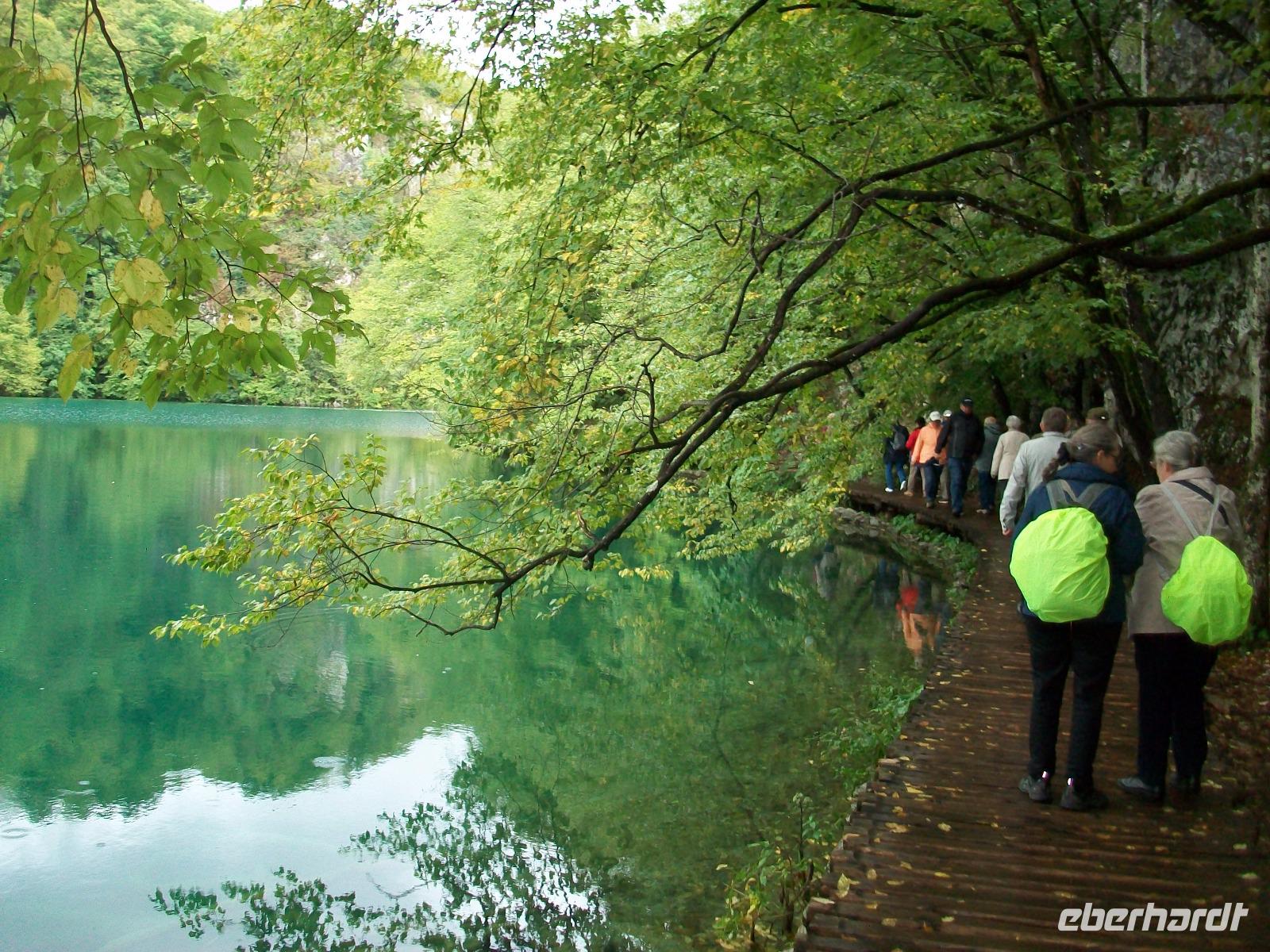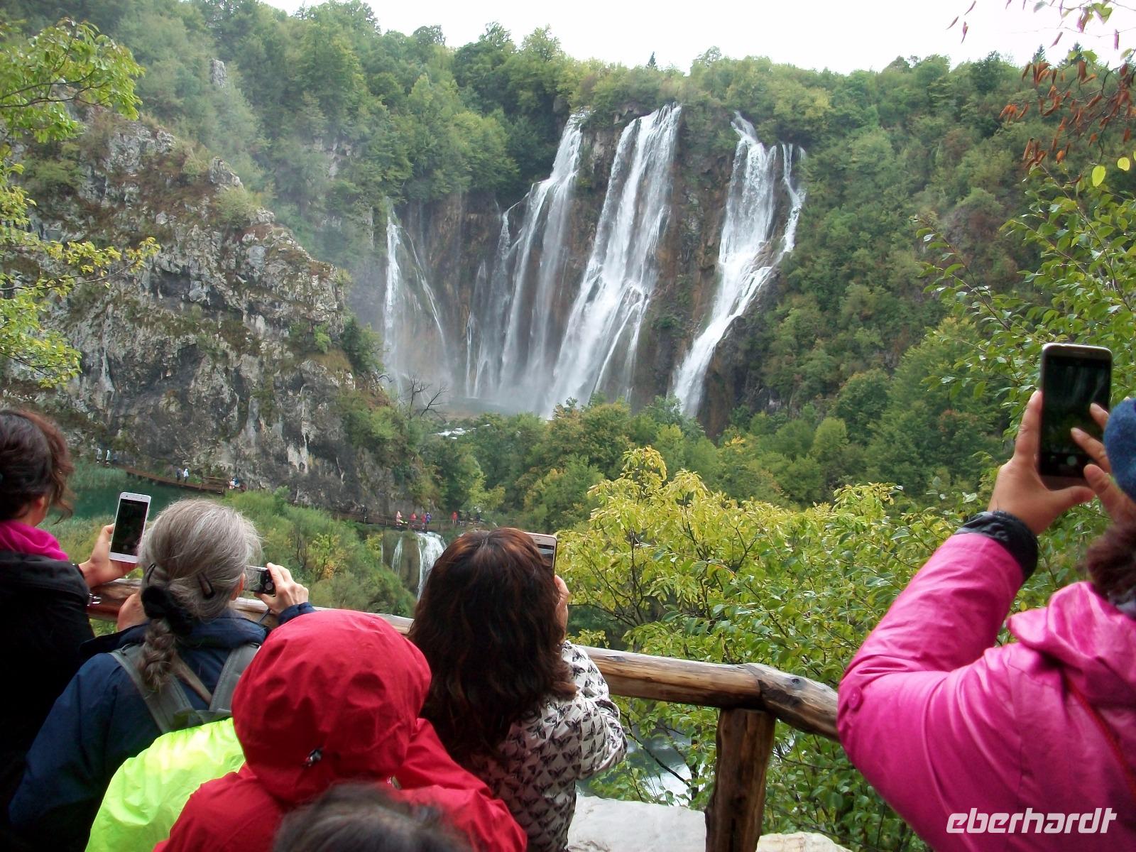 Pünktlich trifft Nikolina ein, sie wird uns in den nächsten Stunden die Wunder dieser unberührten Natur zeigen. Zunächst geht es vom Eingang zum Aussichtspunkt mit einem wahrhaft grandiosen Blick auf den Großen Wasserfall der fast 80 Meter sein Nass donnernd herabsendet. Zu Fuß gelangen wir hinunter und unten angekommen, netzt feiner Wasserstaub unsere Haut. Es ist schon ein beeindruckendes Gefühl diesem Wasserfall ganz nahe zu sein. Dann führt uns der Weg aufwärts; vorbei an den grünlichen Fluten der Seen und entlang der zahlreichen Kaskaden, gelangen wir zum Koziak - See. Hier beginnt eine gemütliche Bootsfahrt, sehr erholsam verläuft die Tour und am anderen Ende geht es noch etwas weiter bergauf, hier sind weitere Wasserfälle zu bewundern, da stört es auch nicht, dass Petrus einige Tropfen herabsendet.